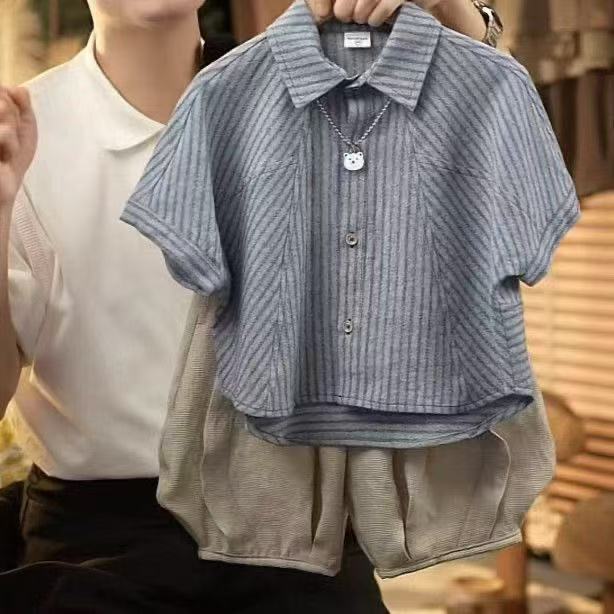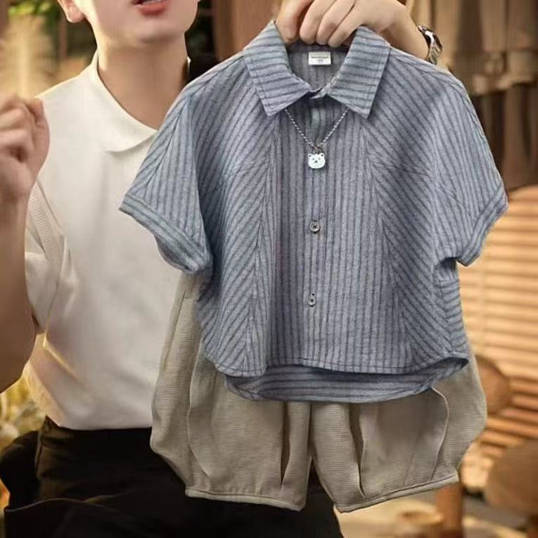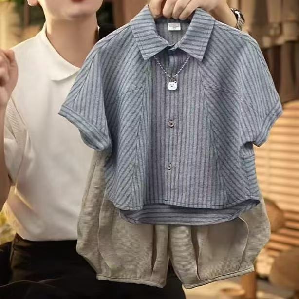 소년 여름 정장 2025 새로운 여름 잘 생긴 어린이 줄무늬 반팔 셔츠 아기 소년 세련된 세트