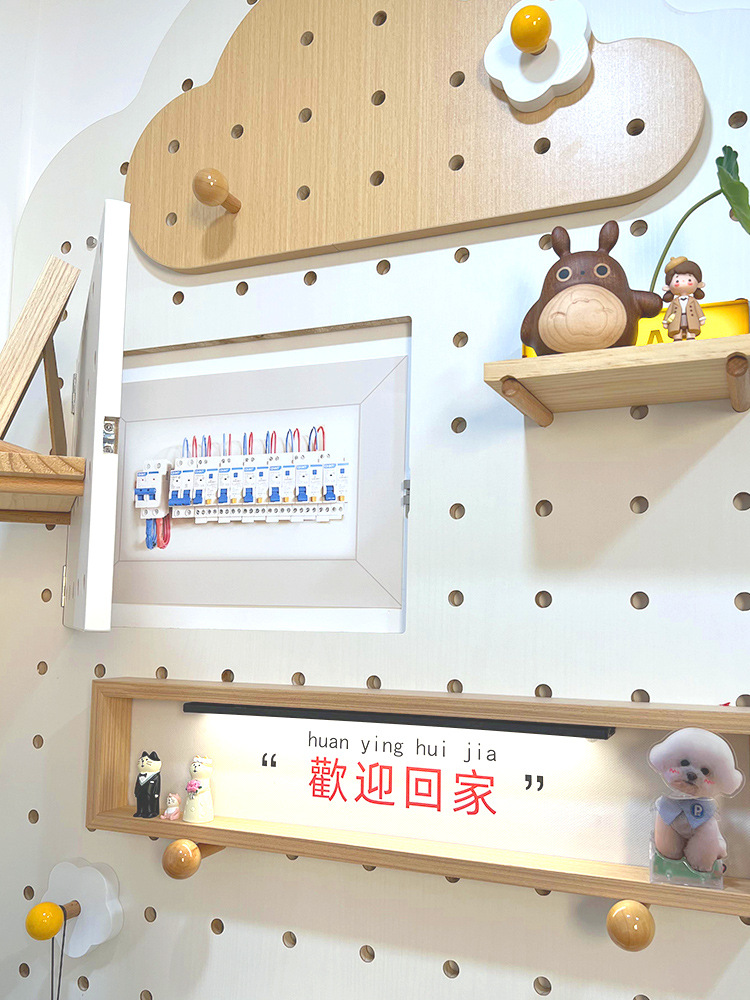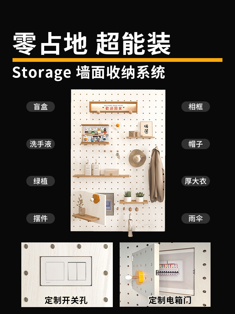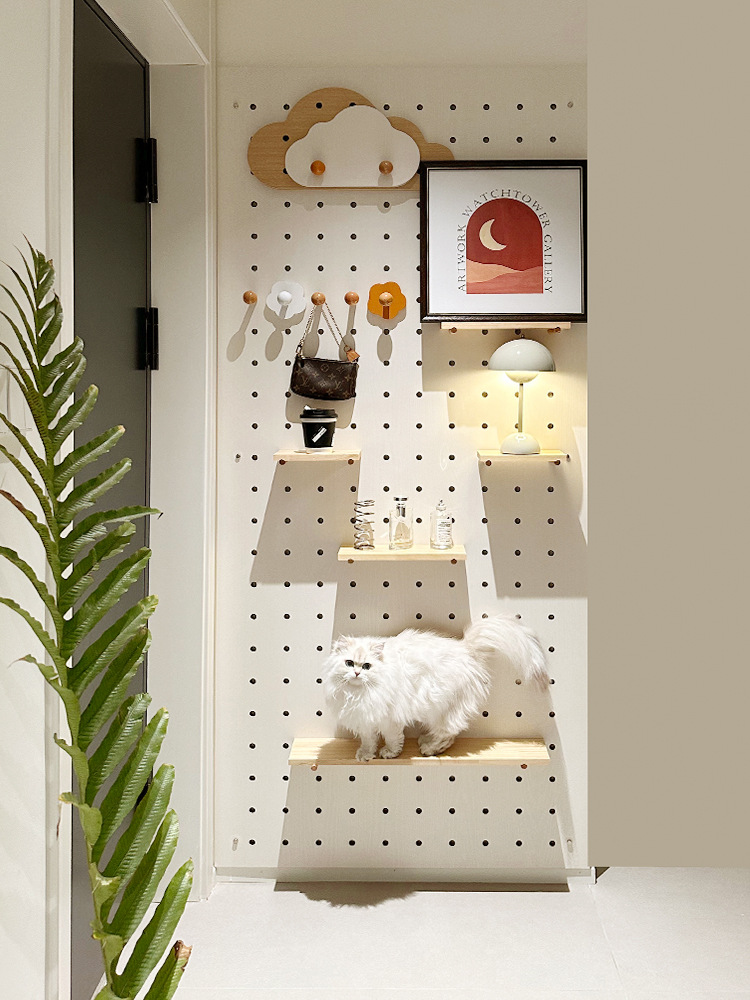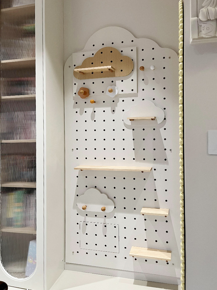 현관에 있는 구멍이 있는 보드 벽걸이 옷걸이 나무 디스플레이 보관 벽을 위한 구름 보관 랙 공급
