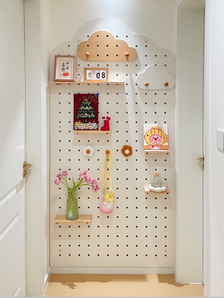 현관에 있는 구멍이 있는 보드 벽걸이 옷걸이 나무 디스플레이 보관 벽을 위한 구름 보관 랙 공급스토어 가기