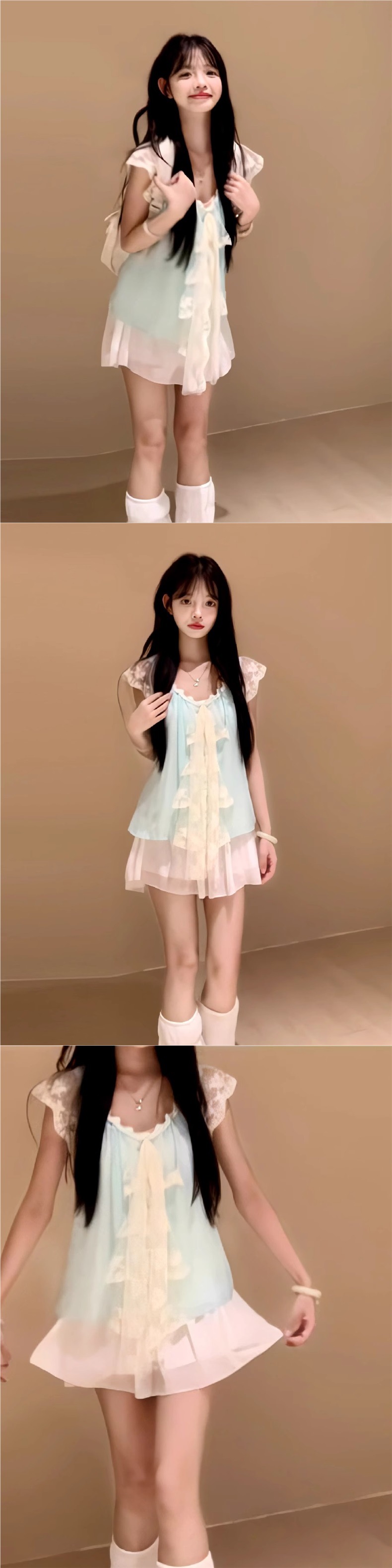 여름 민트 캔디 얇은 봄 나들이 쉬폰 여성 달콤한 작은 플라잉 슬리브 티셔츠 짧은 치마 정장 빈티지 나나 스타일 핫 소녀스토어 가기