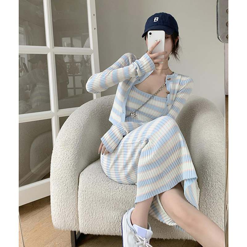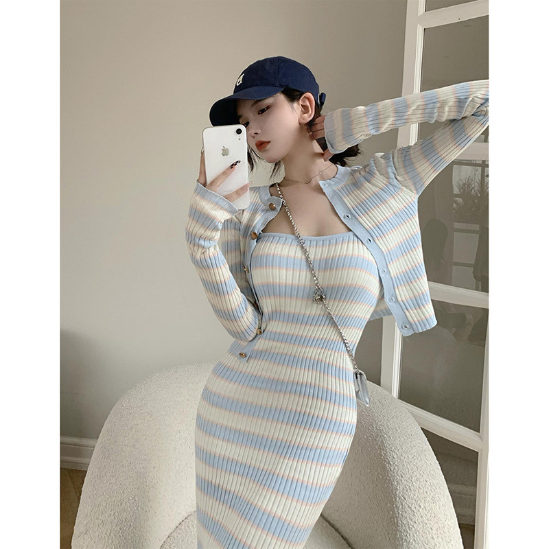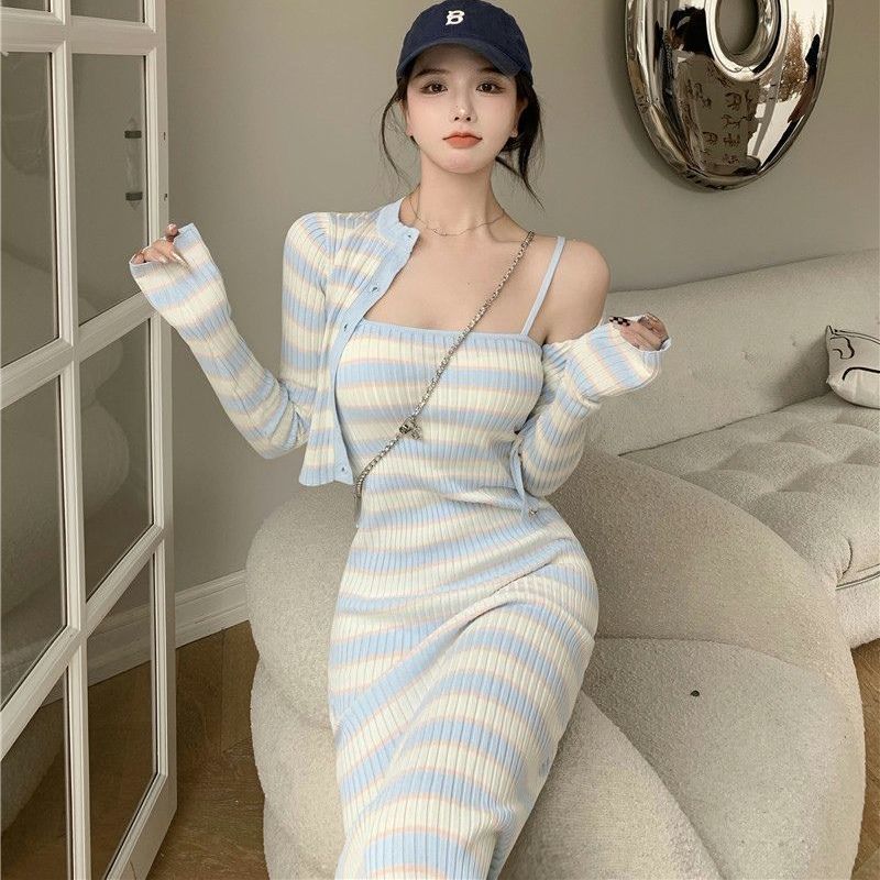 한국식 캐주얼 패션 슈트, 여성스럽고 왕가풍!니트 서스펜더 드레스 여성 가을 스트라이프 미드기장 스커트