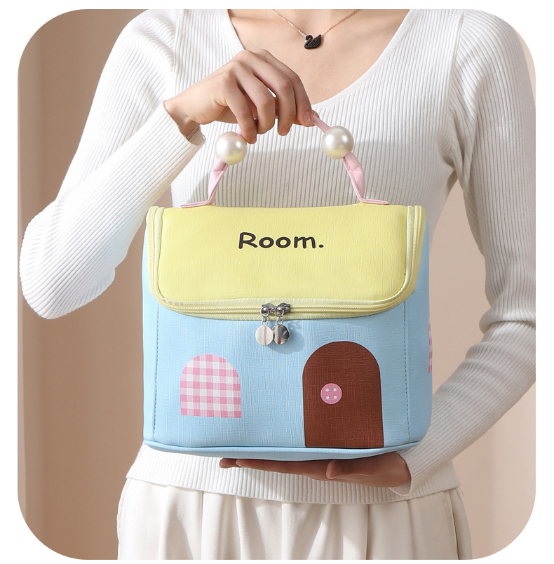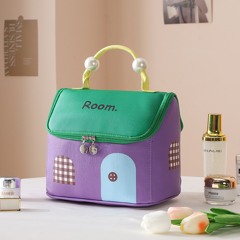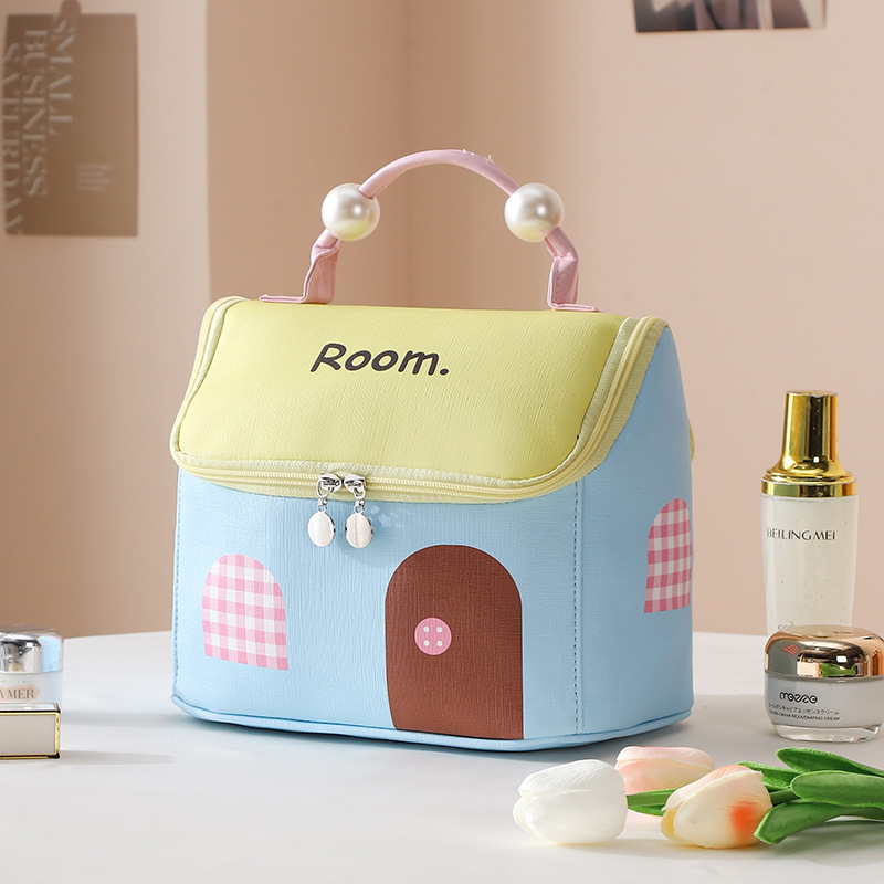 하우스 화장품 가방, 여행용 가죽 수납 가방, PU 방수 파티션 세면 용품 가방, 귀여운 진주 캐빈 수납 가방