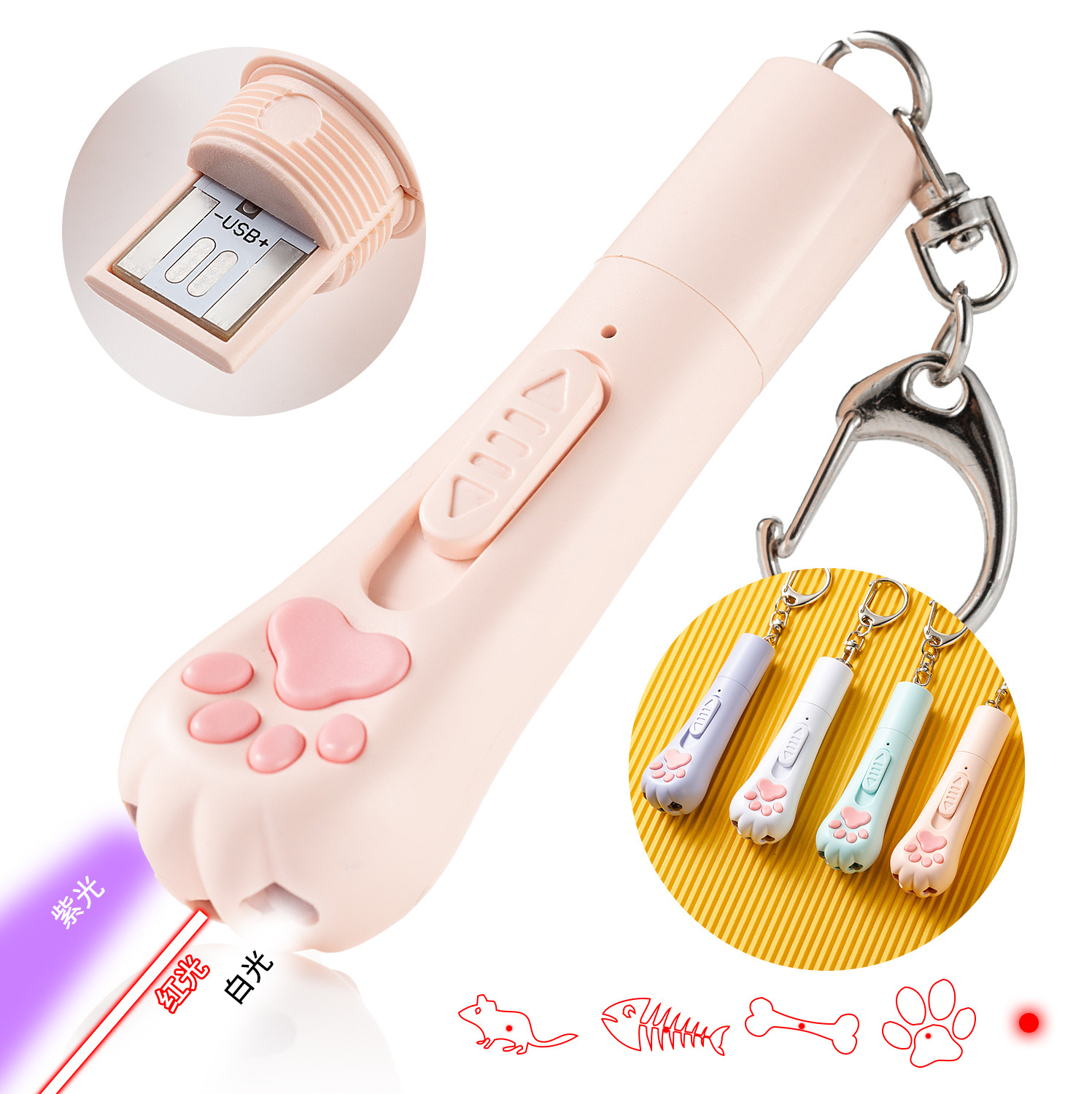 功能:激光(光点+老鼠+鱼+骨头+掌印)+紫光+白光照明
