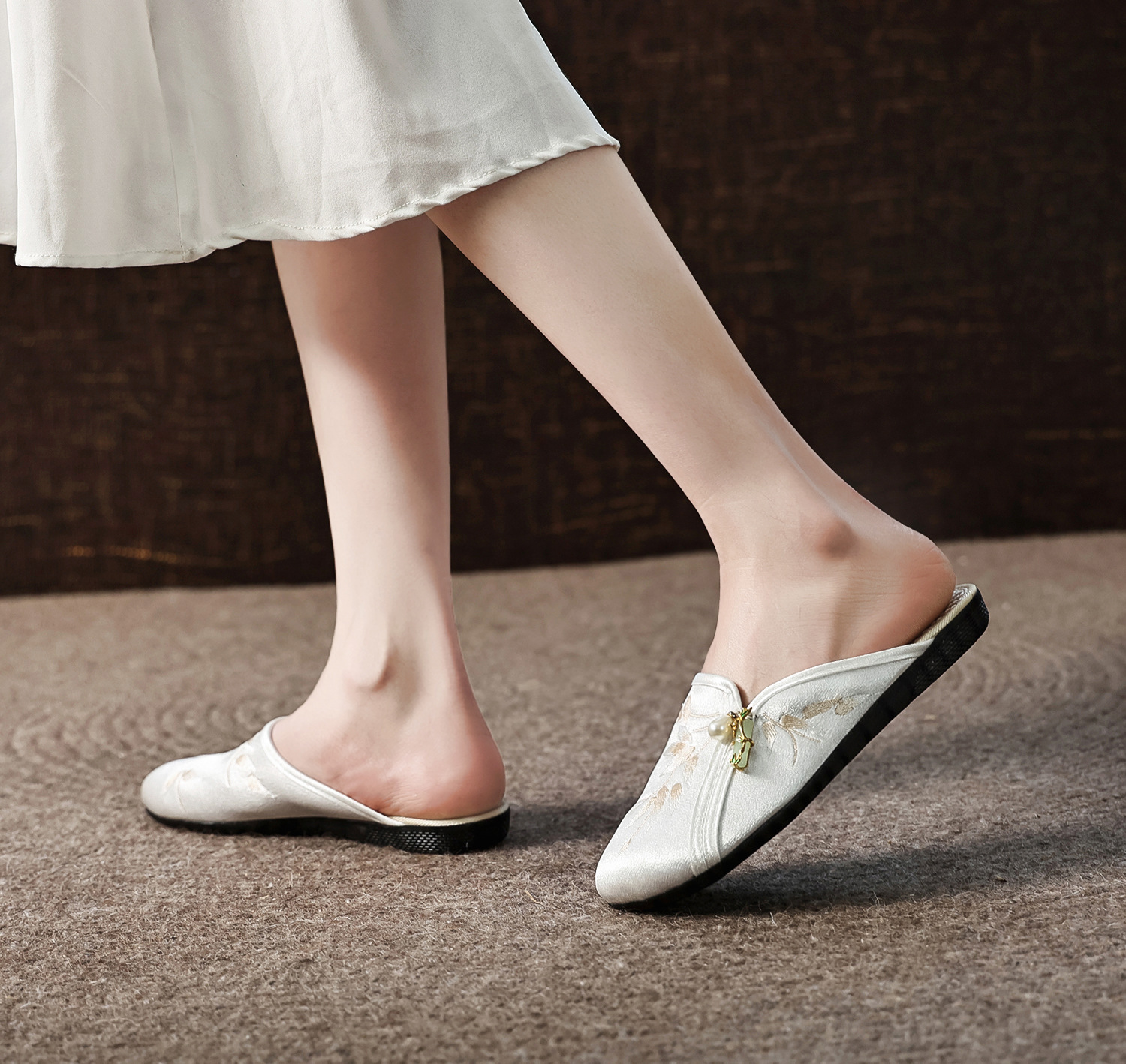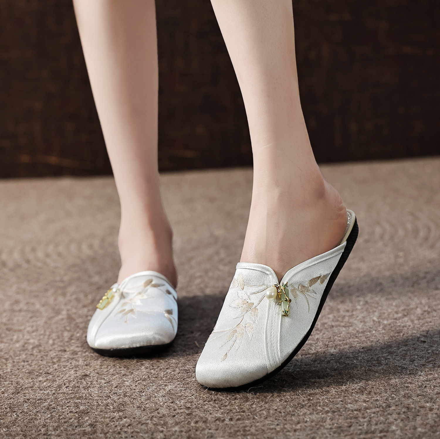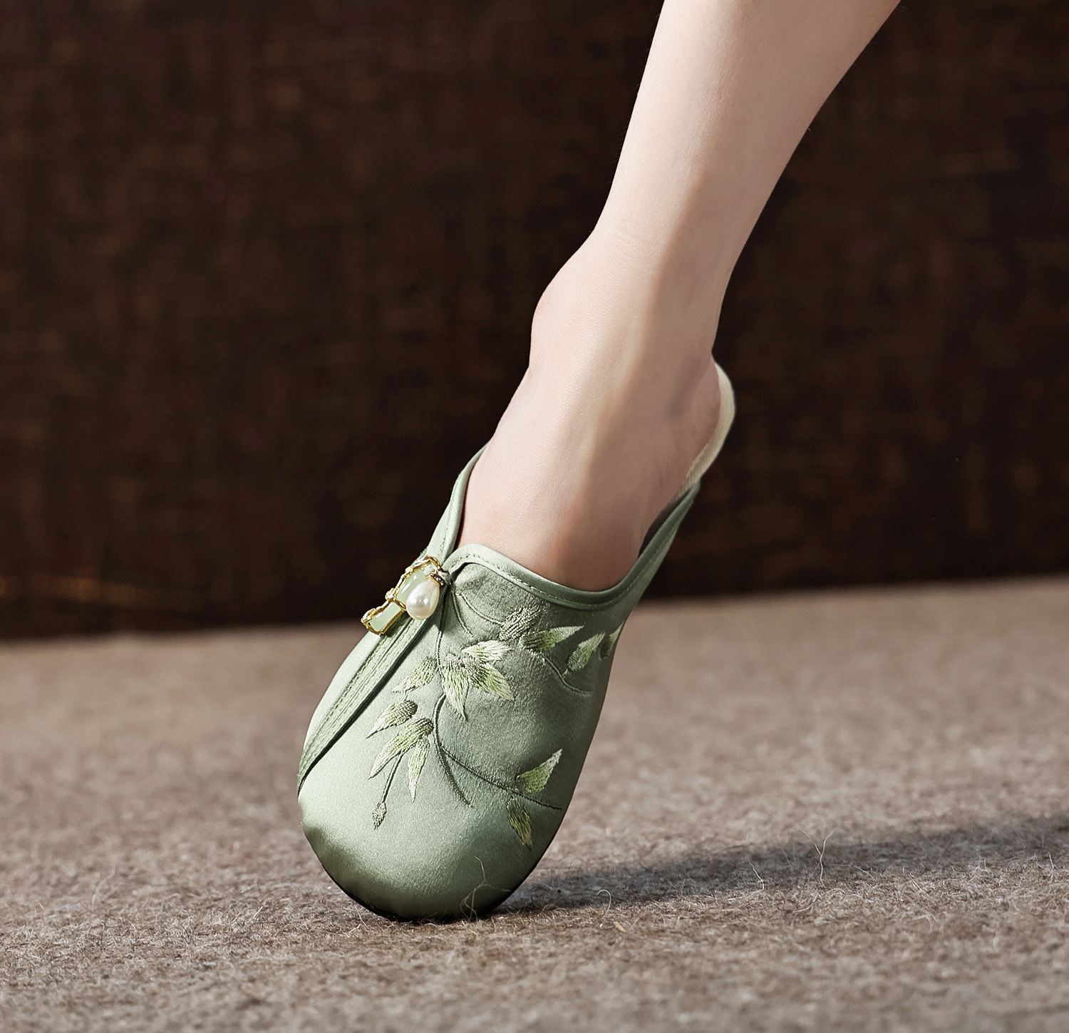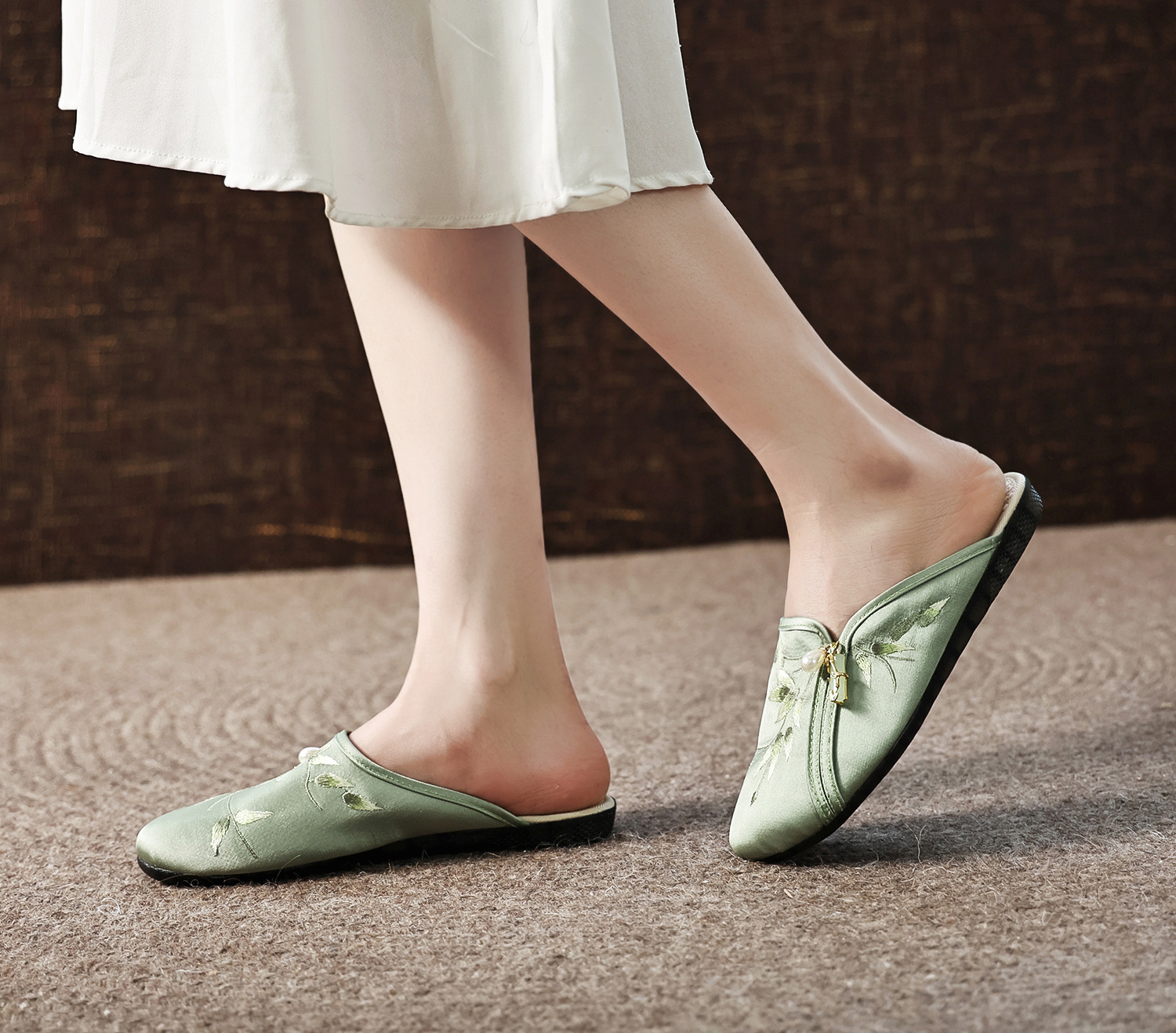 여름 새틴 수 놓은 반 슬리퍼 홈 및 의상 여성용 포크 자수 신발스토어 가기