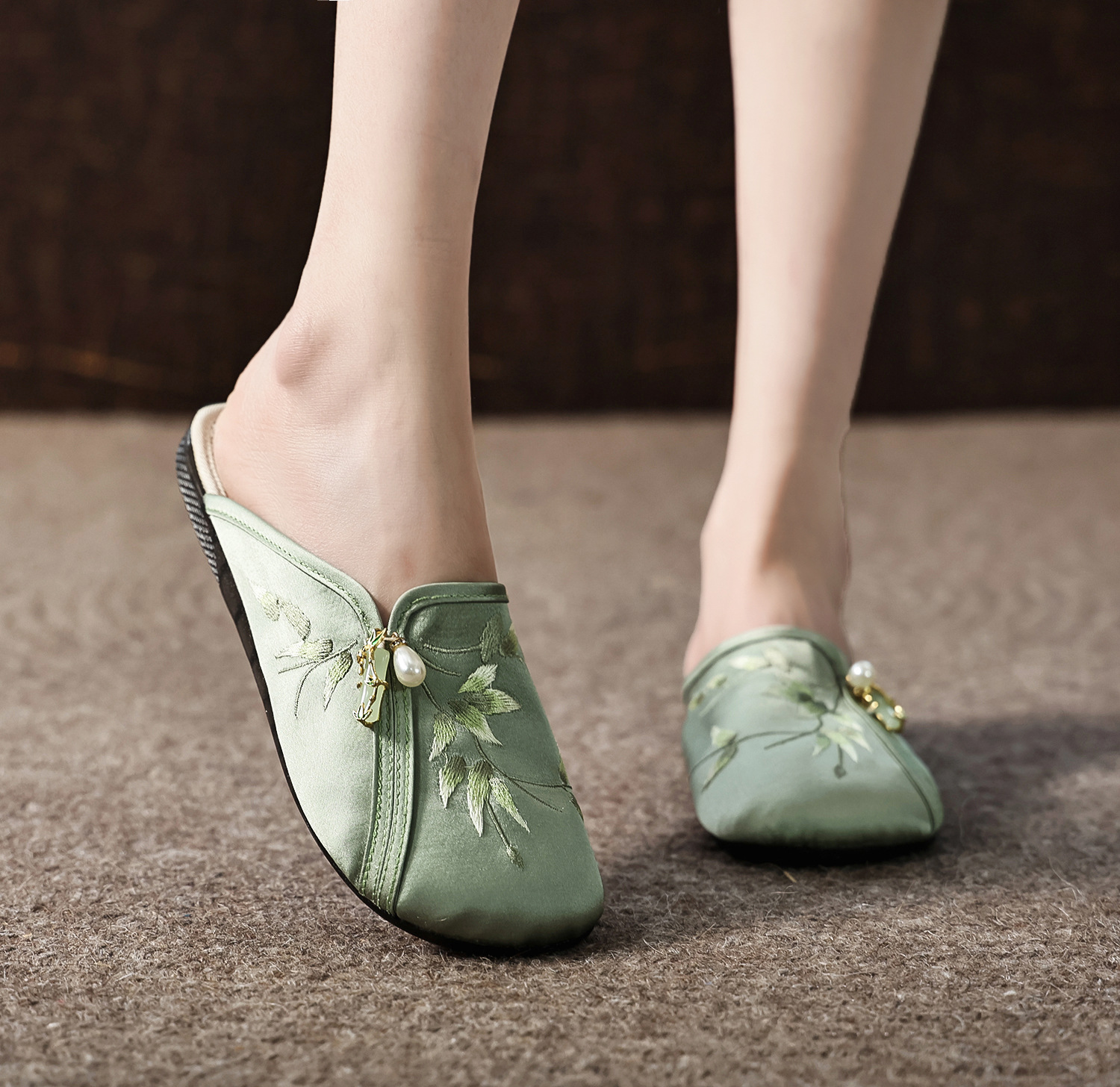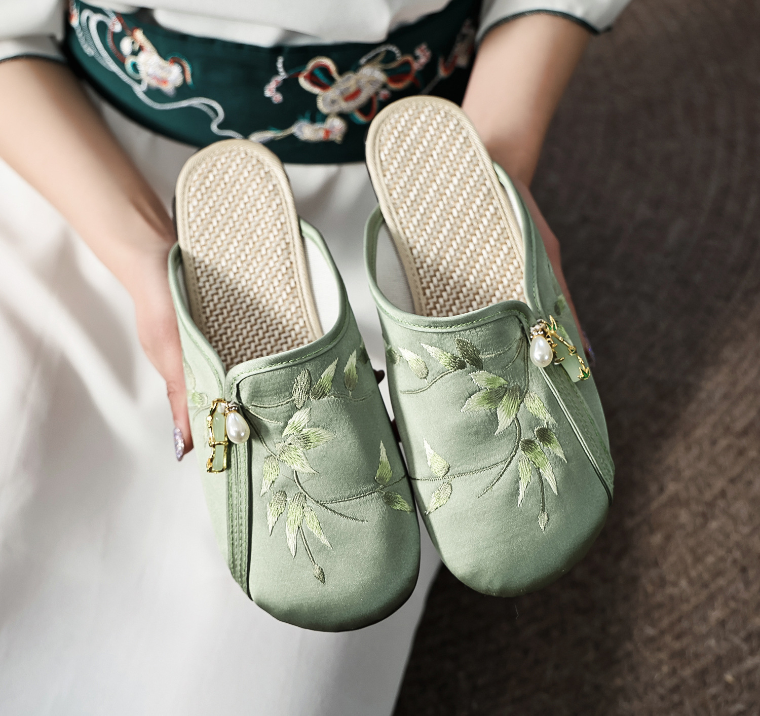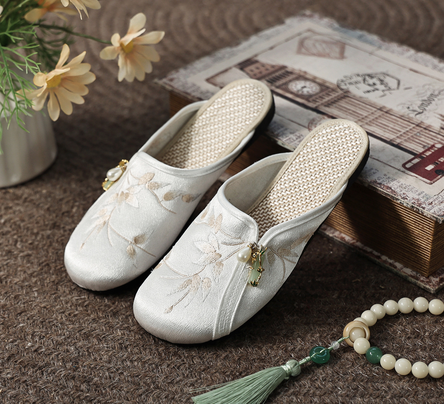 여름 새틴 수 놓은 반 슬리퍼 홈 및 의상 여성용 포크 자수 신발스토어 가기