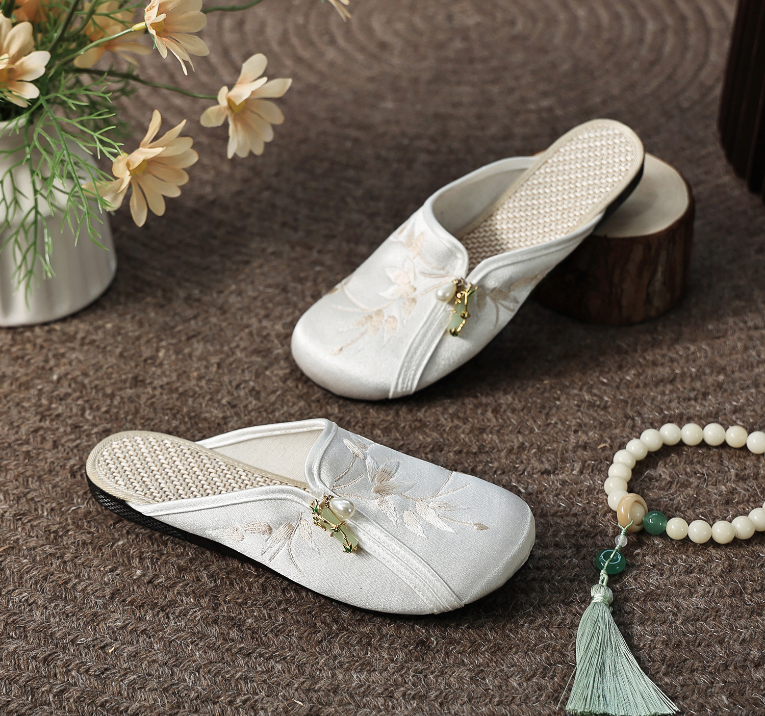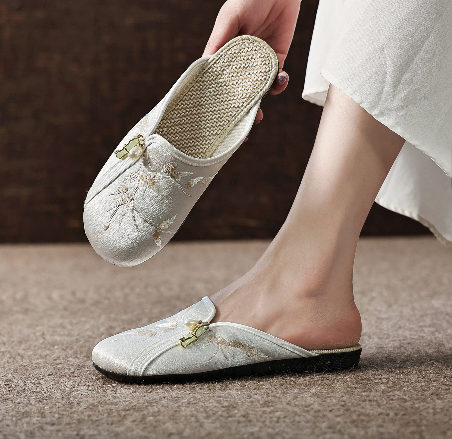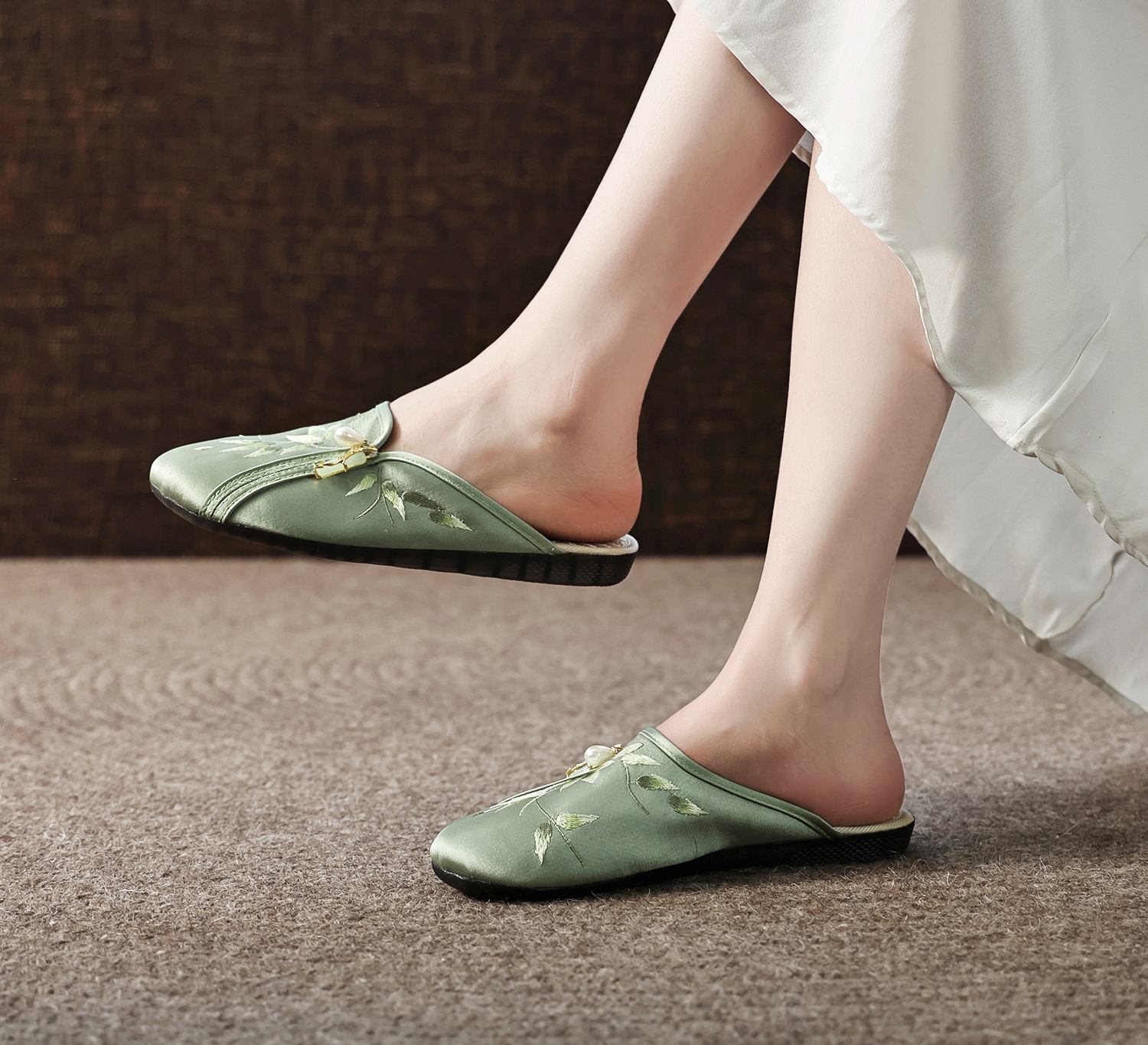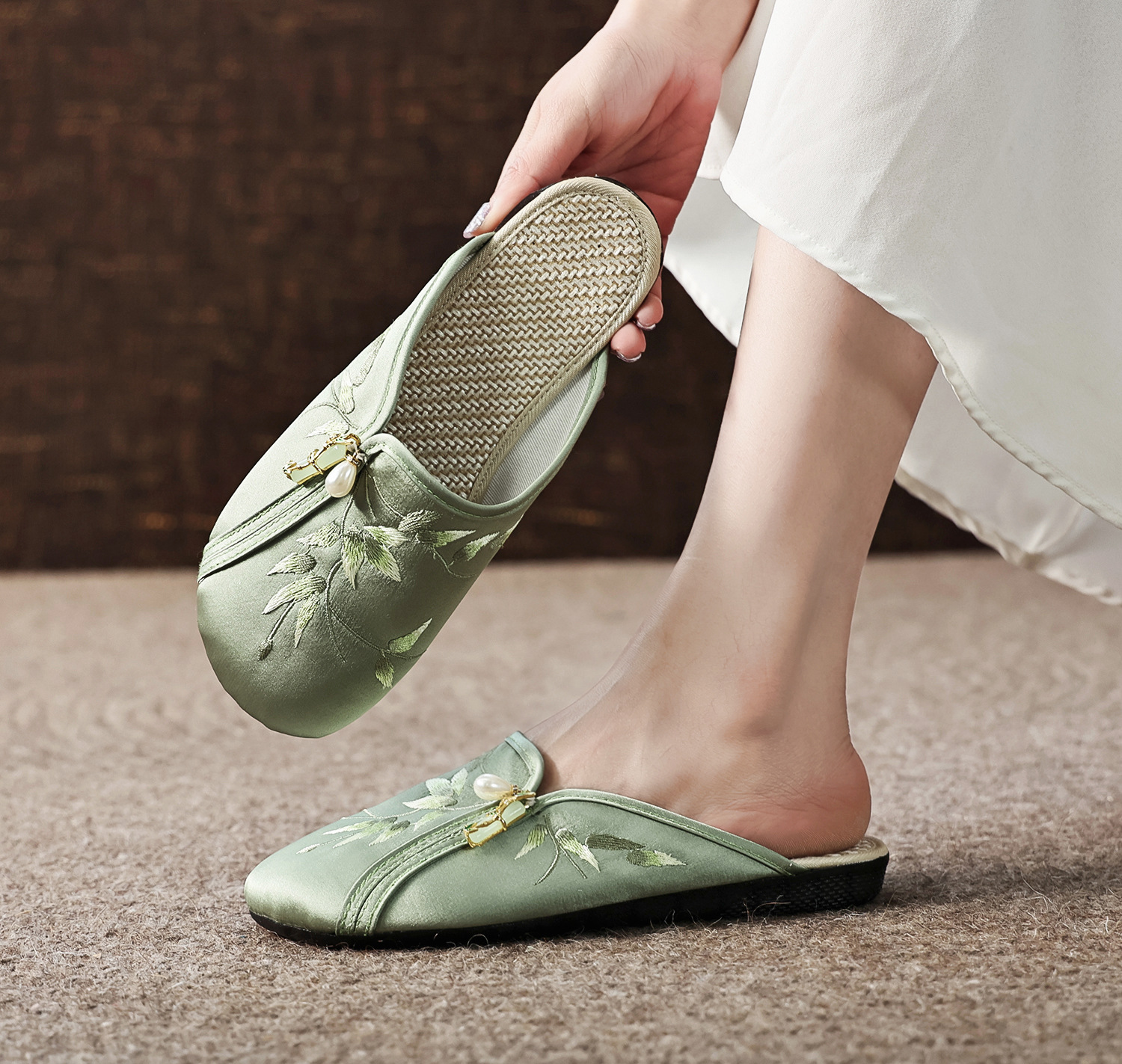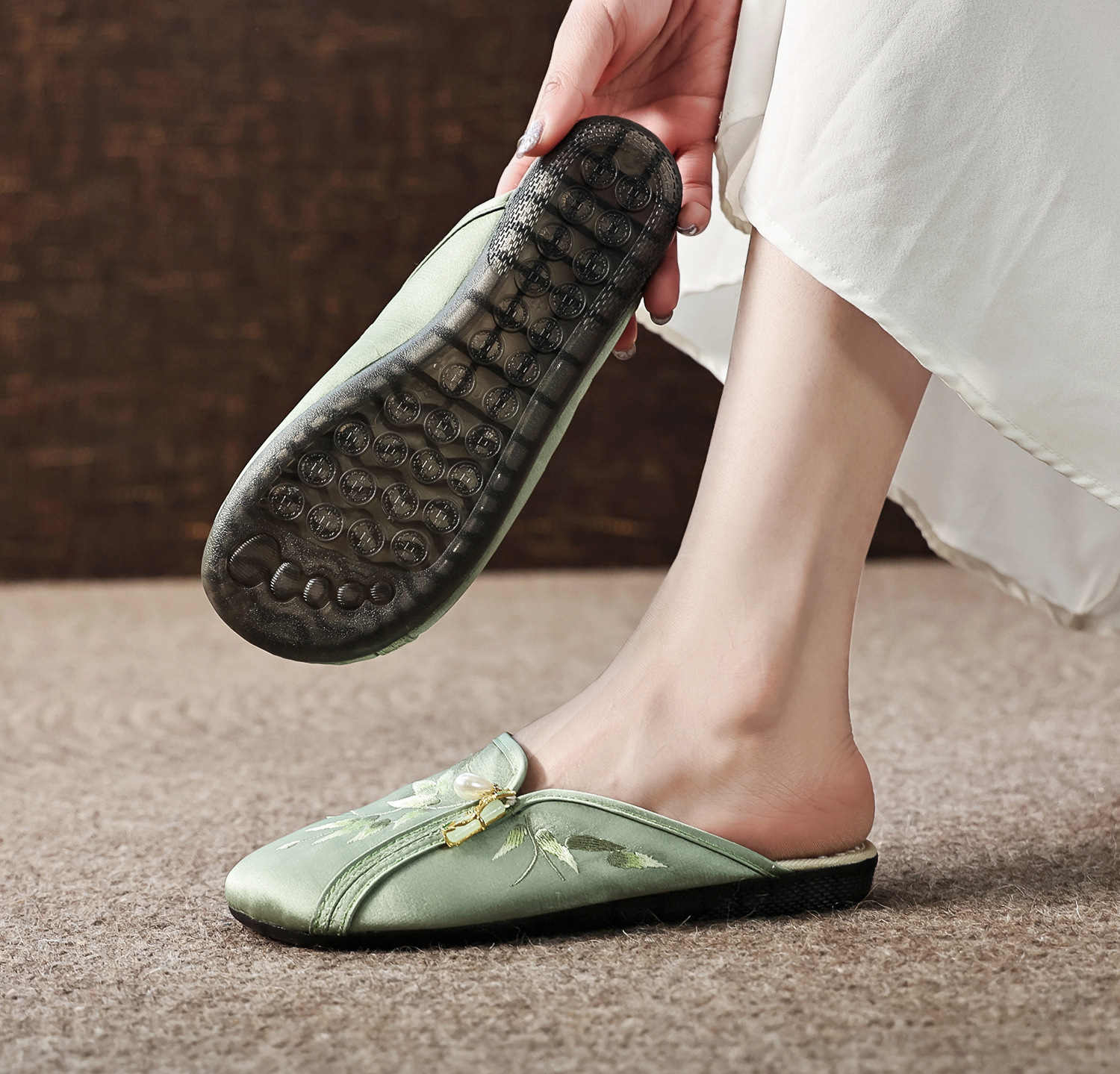 여름 새틴 수 놓은 반 슬리퍼 홈 및 의상 여성용 포크 자수 신발