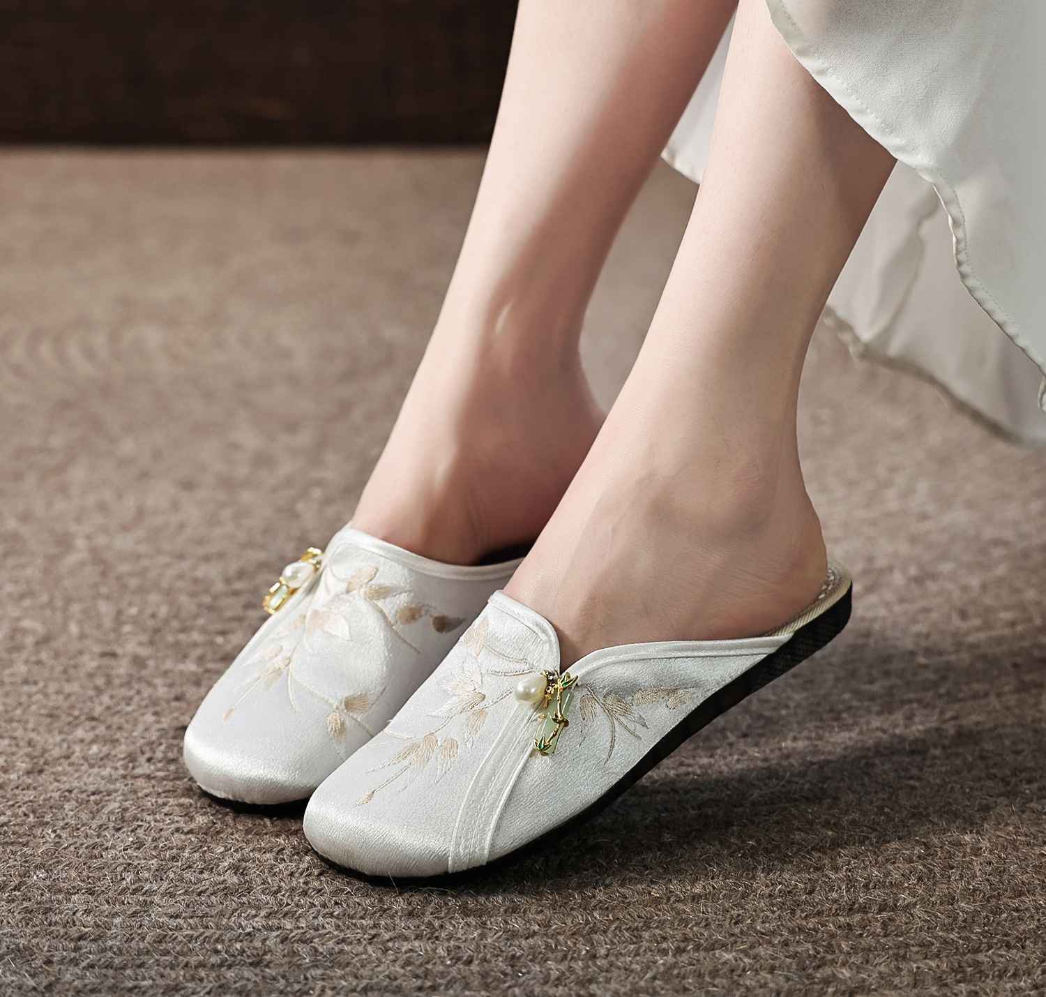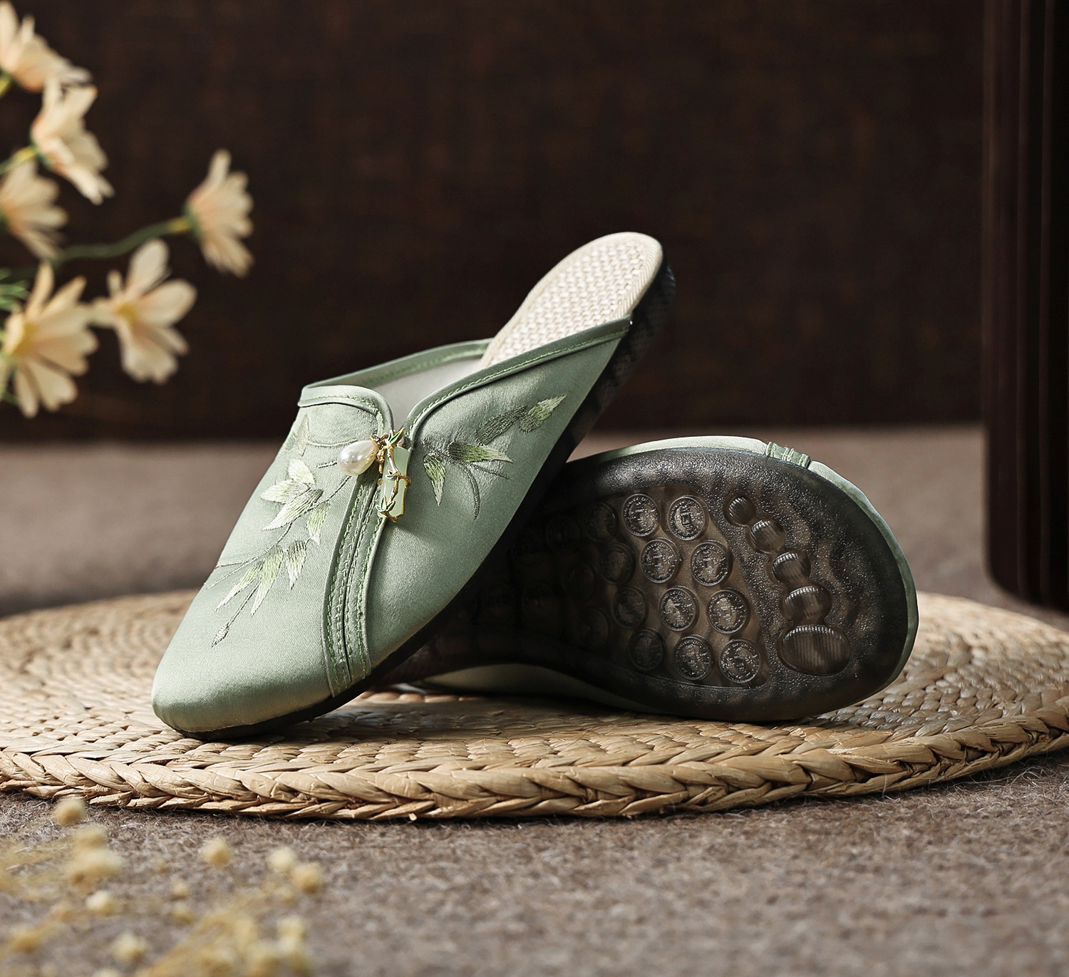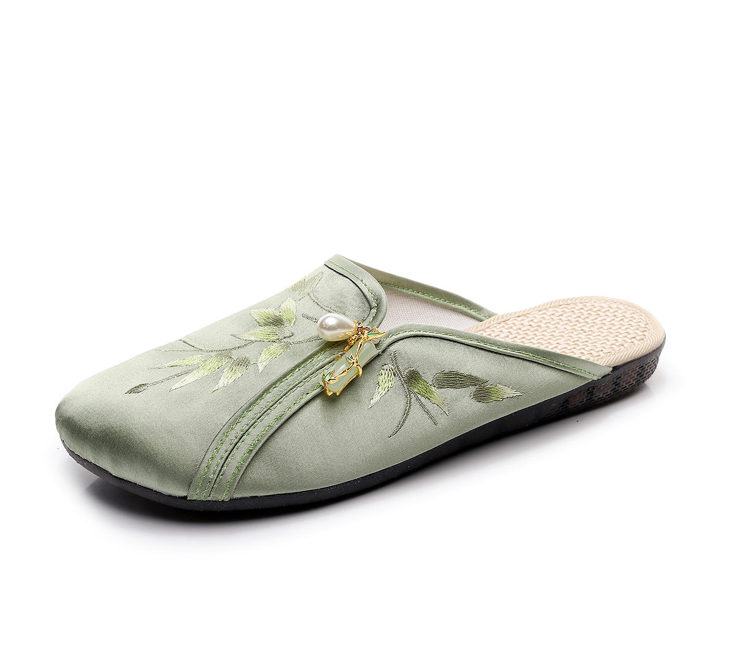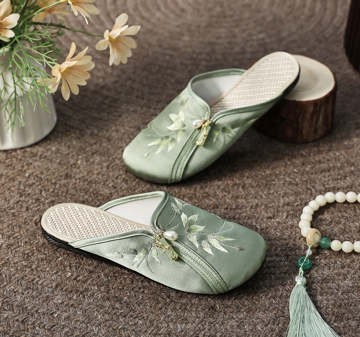 여름 새틴 수 놓은 반 슬리퍼 홈 및 의상 여성용 포크 자수 신발