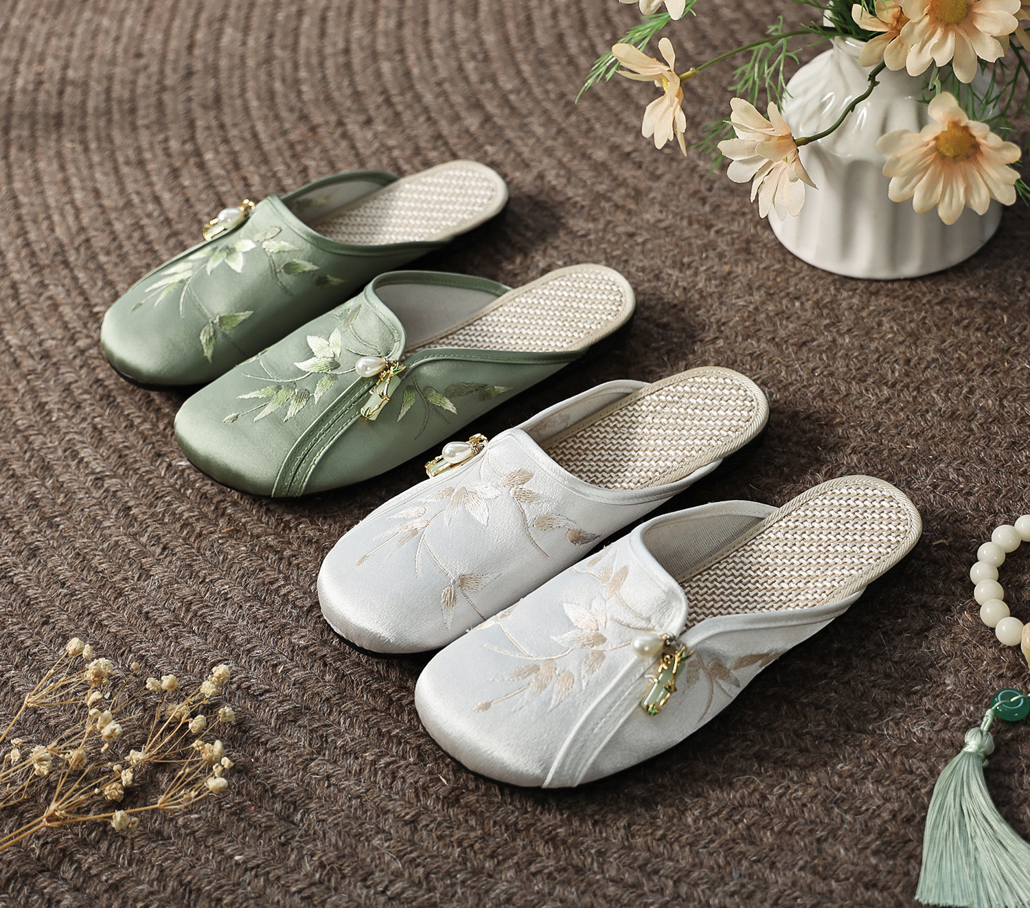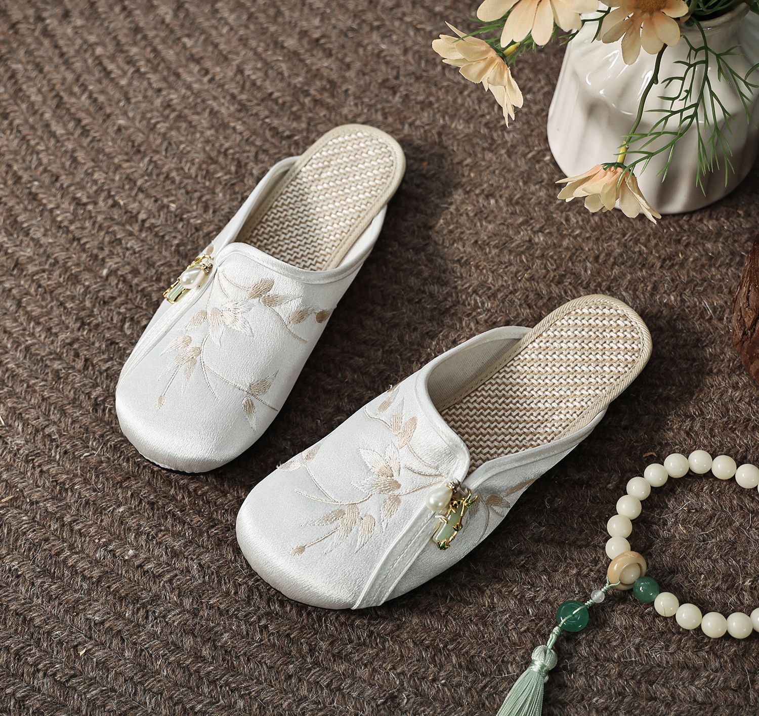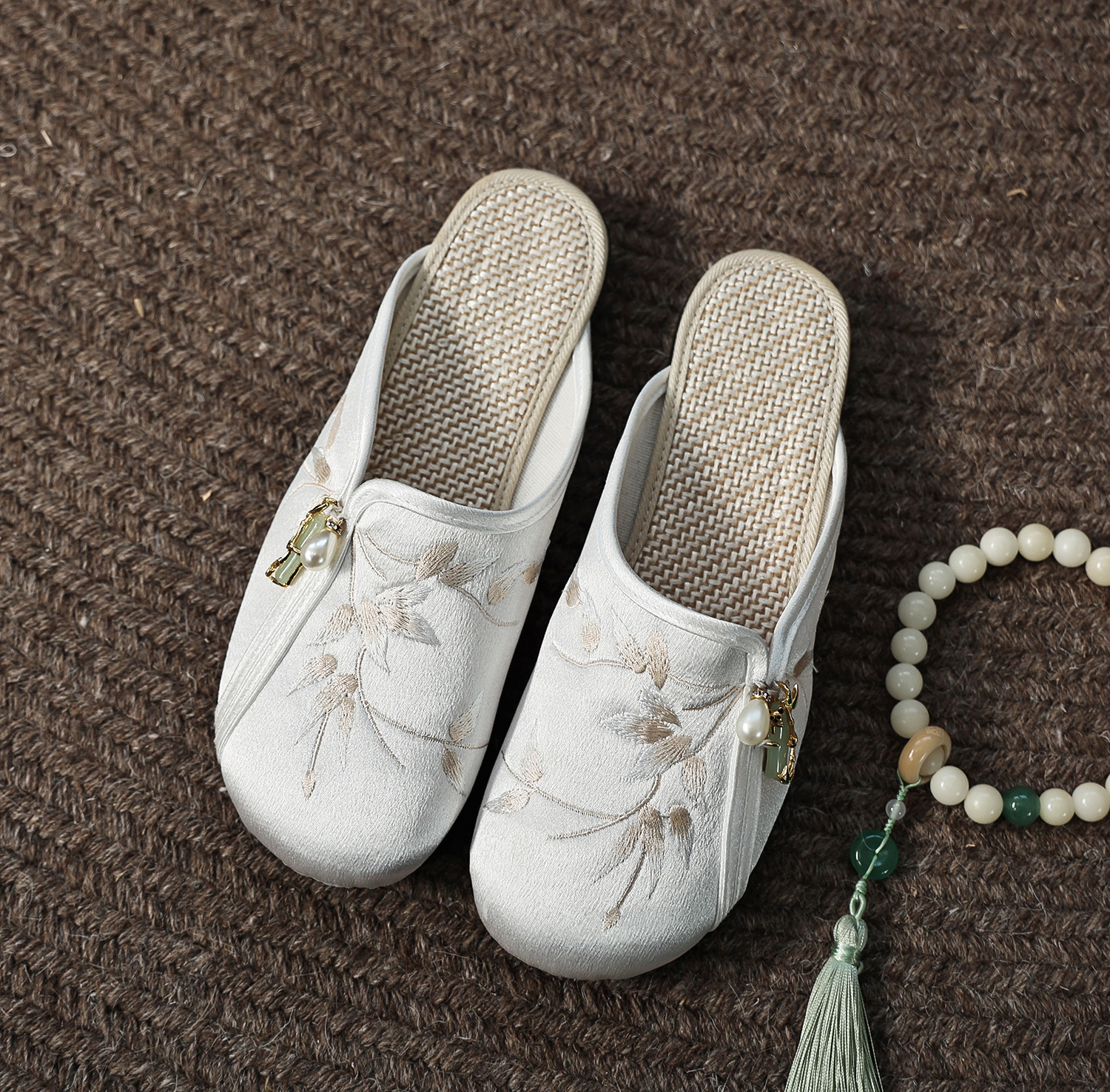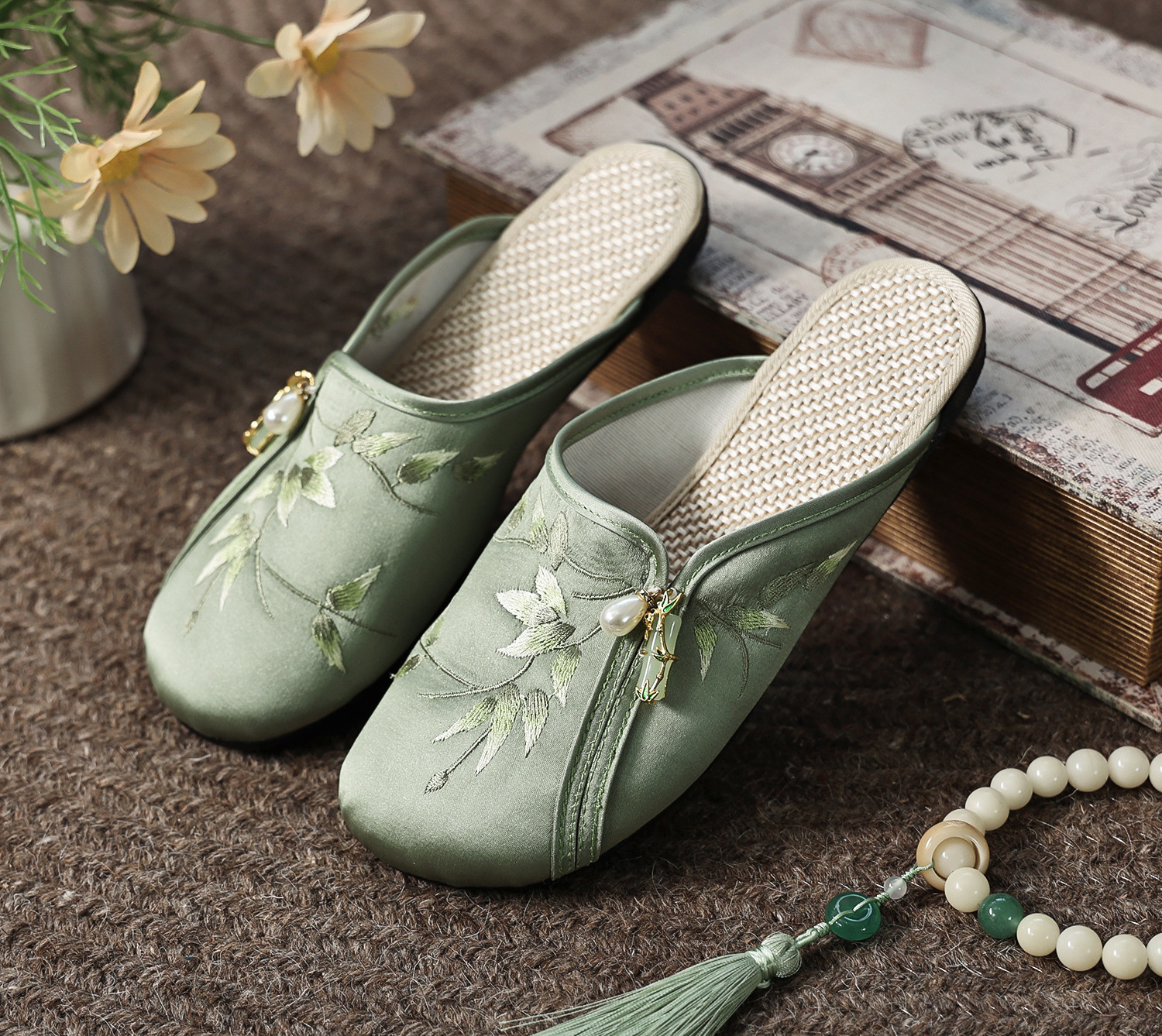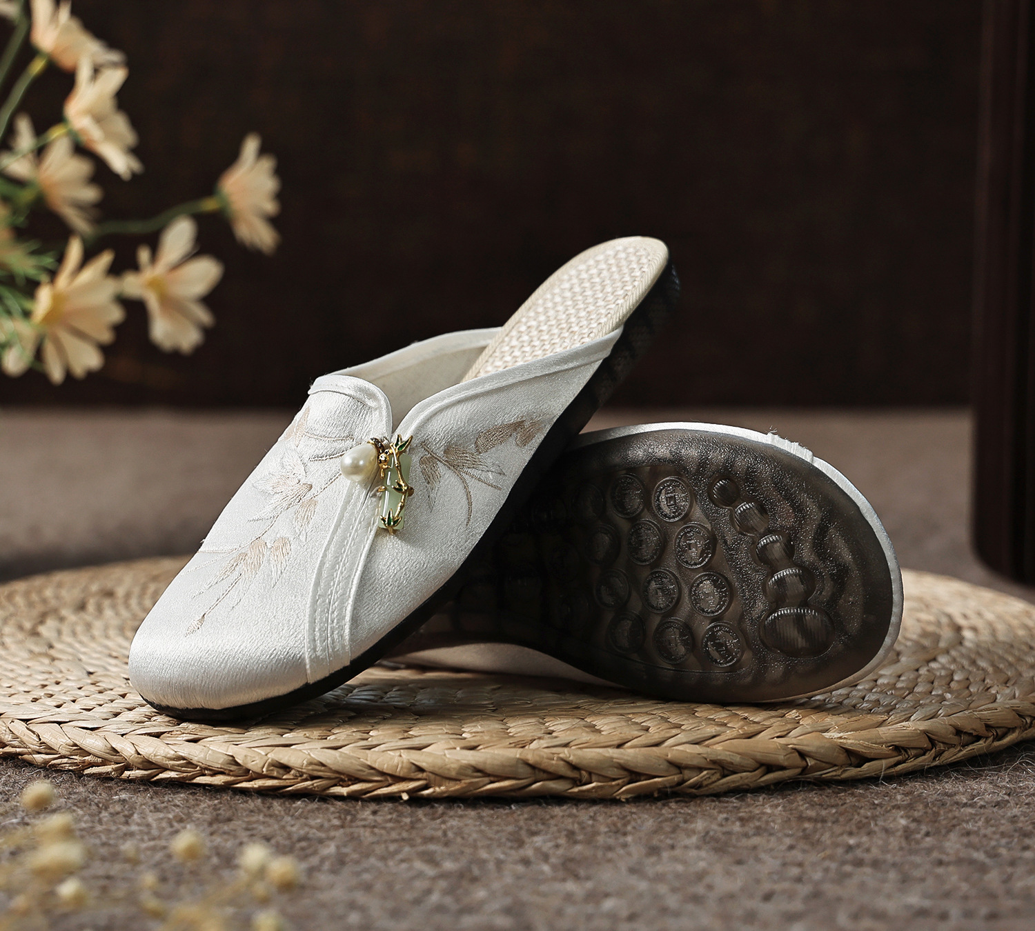 여름 새틴 수 놓은 반 슬리퍼 홈 및 의상 여성용 포크 자수 신발