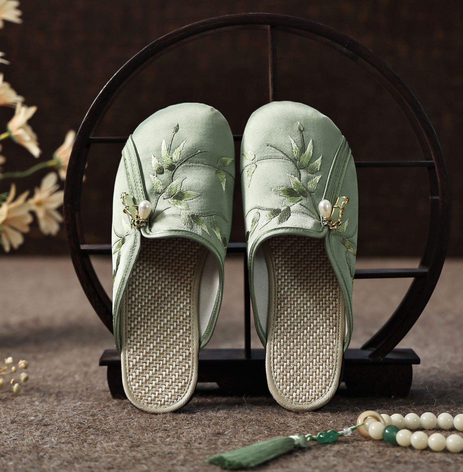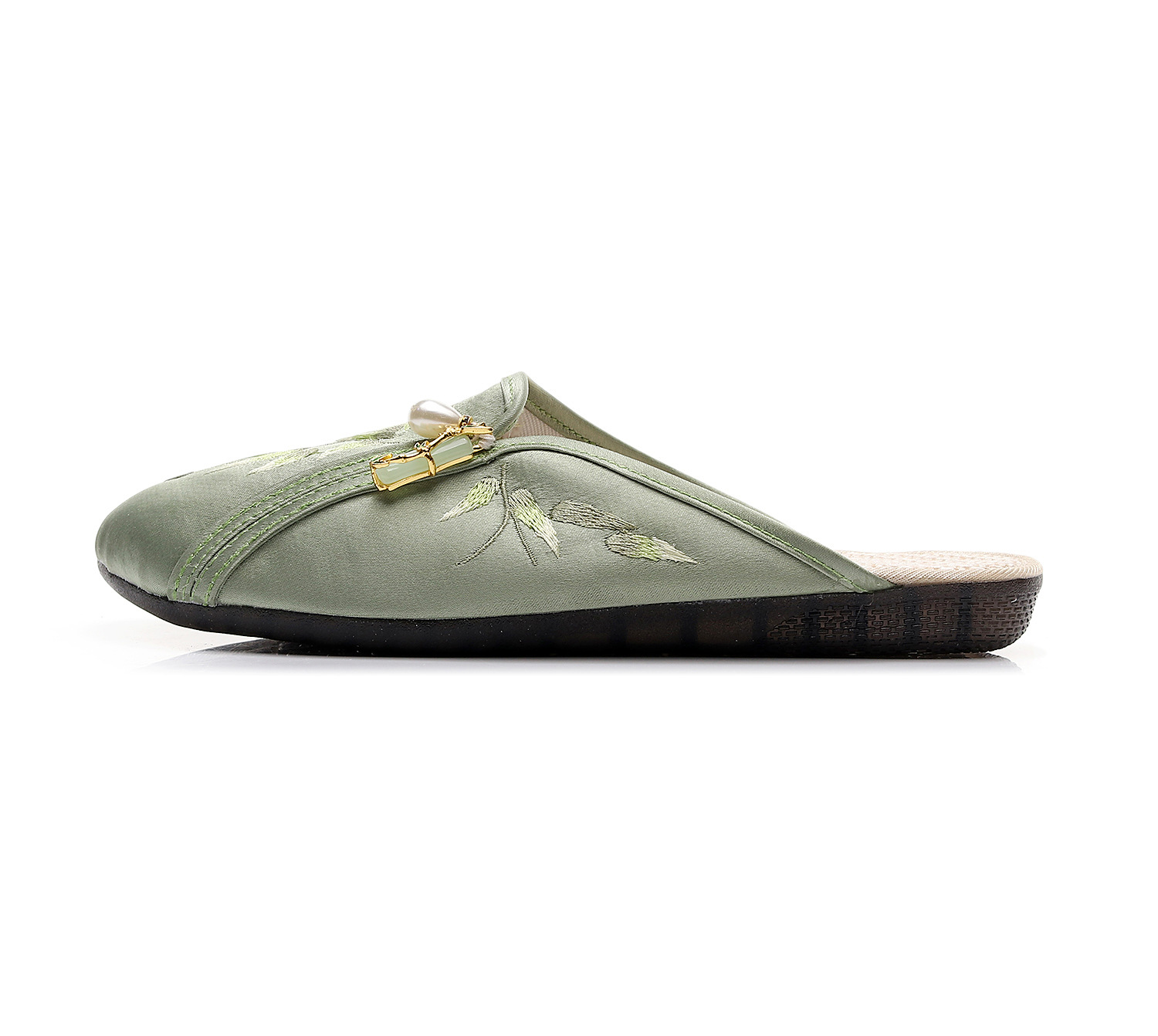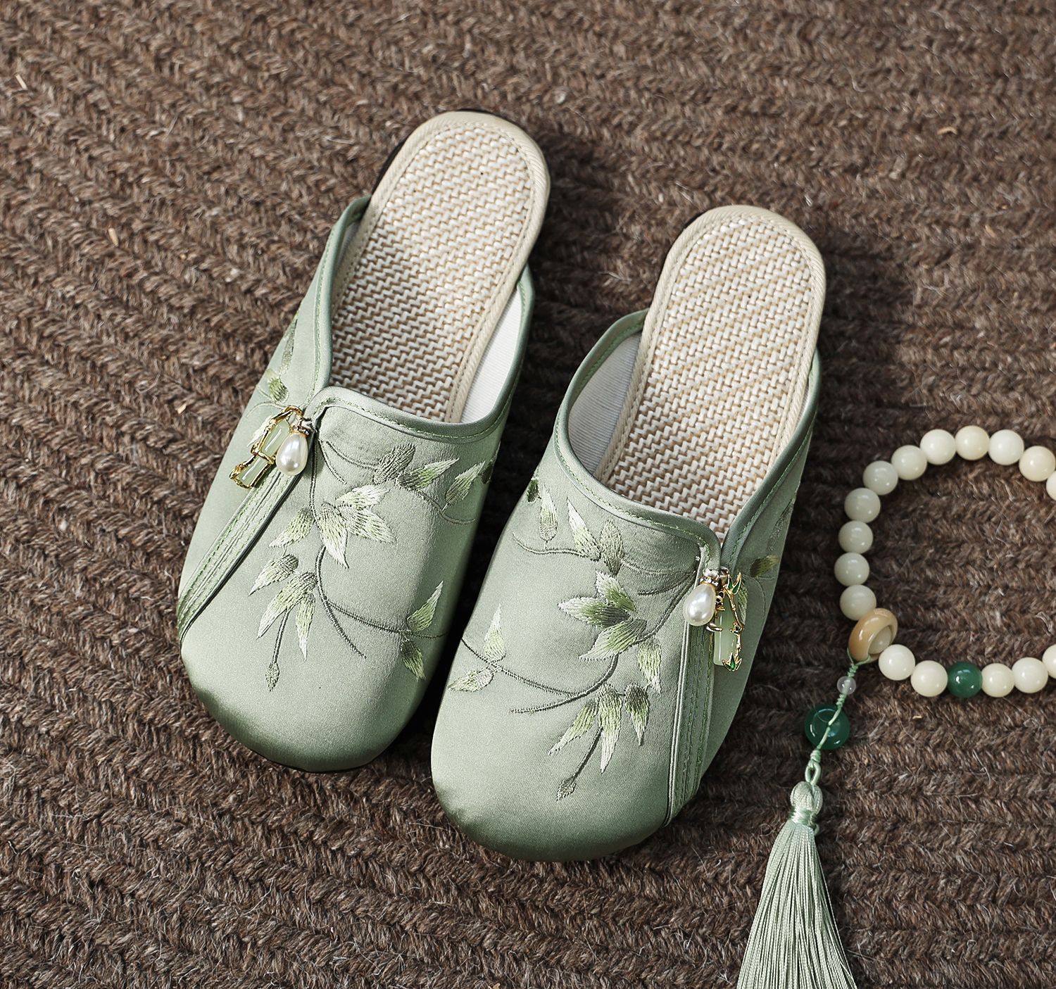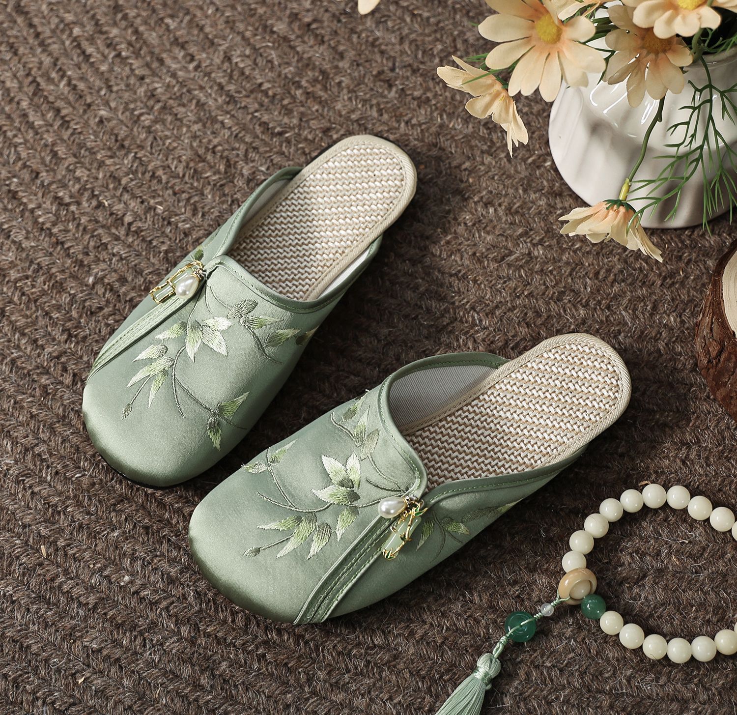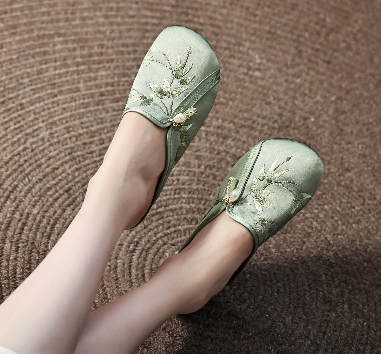 여름 새틴 수 놓은 반 슬리퍼 홈 및 의상 여성용 포크 자수 신발