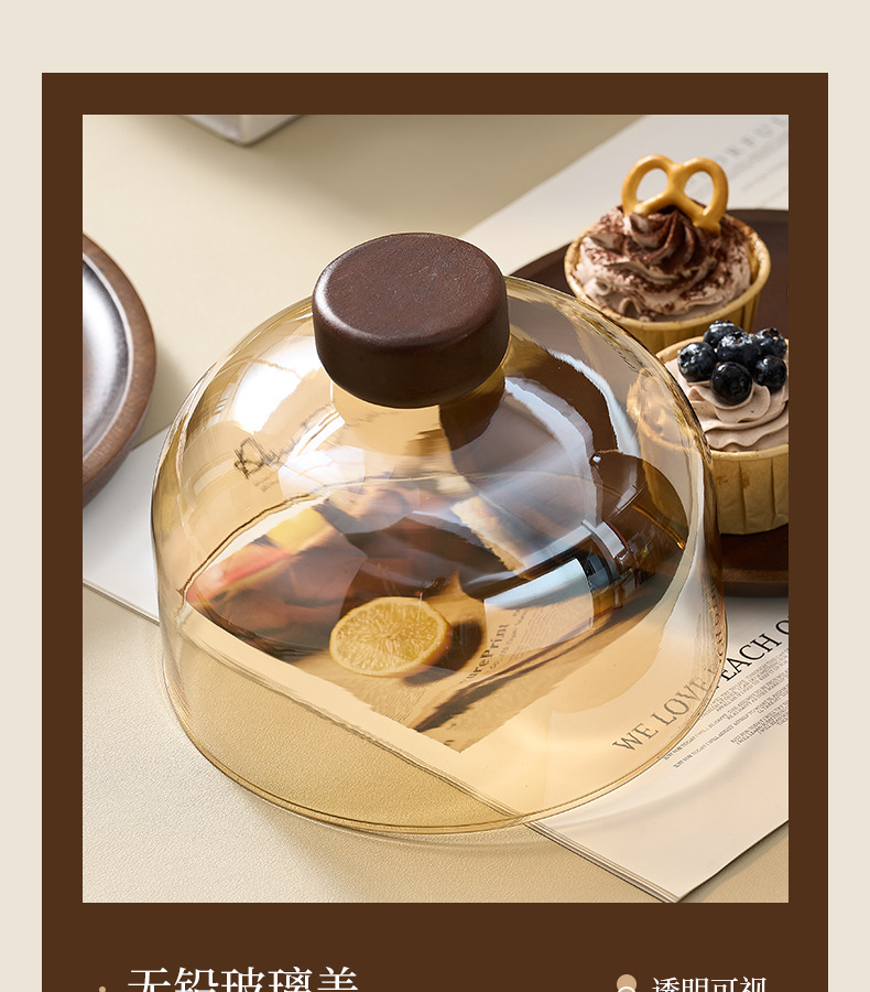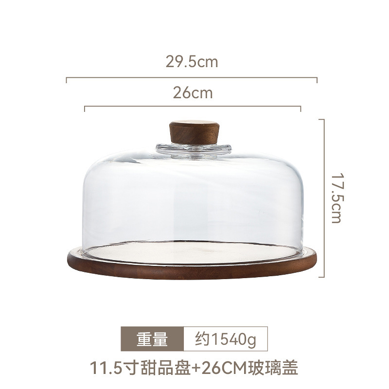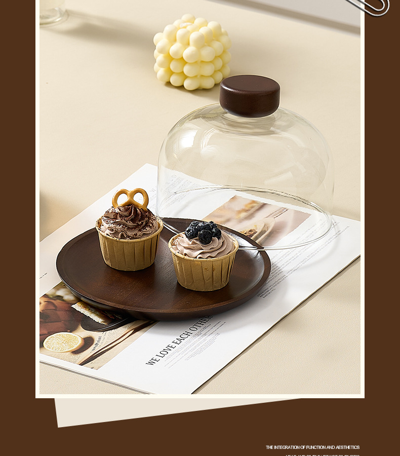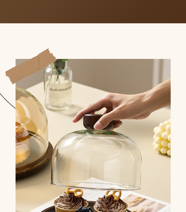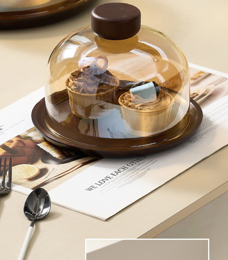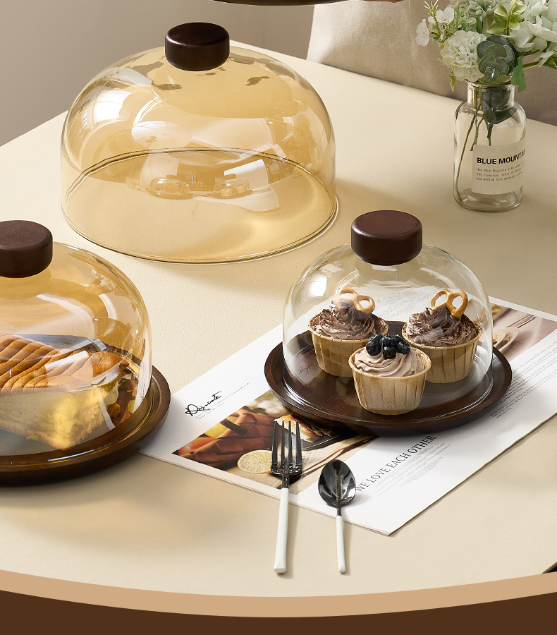 새로운 단단한 나무 케이크 스탠드 방진 유리 디스플레이 트레이 음식 커버 고급스러운 투명 유리 커버 과자 서양 음식