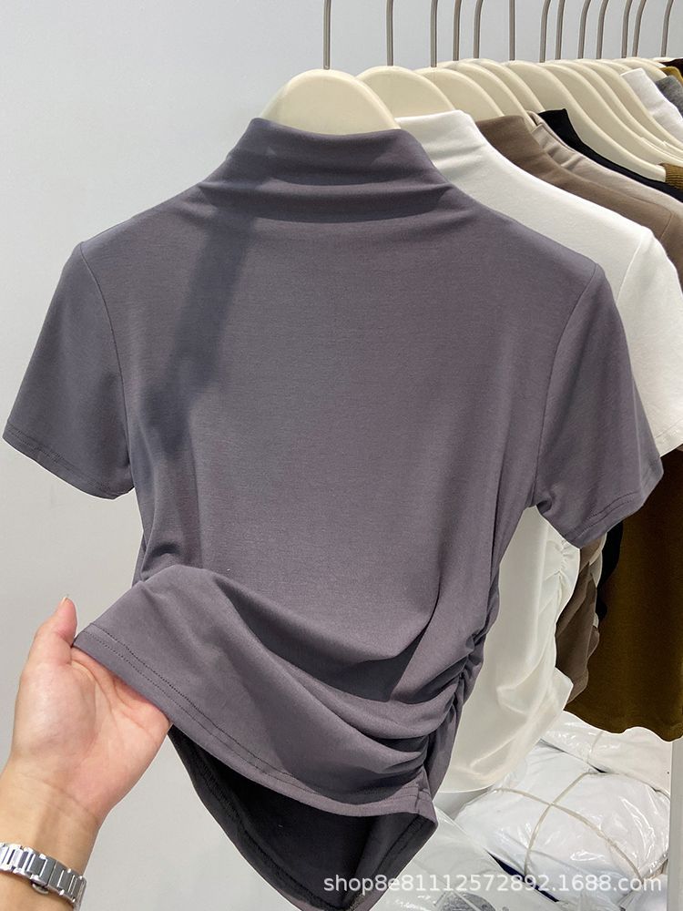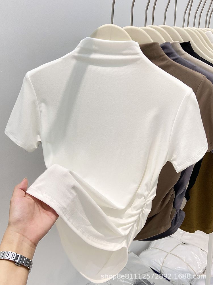 2024년 여름 신상 하프 터틀넥 허리 퓨어 코튼 반팔 티셔츠 여성용 주름 디자인 슬림핏 짧은 트렌디 인