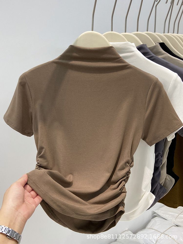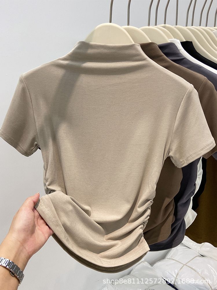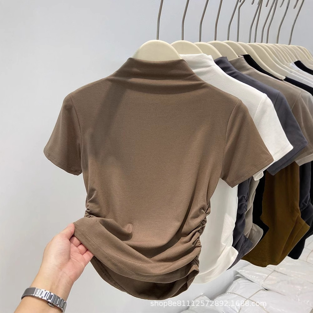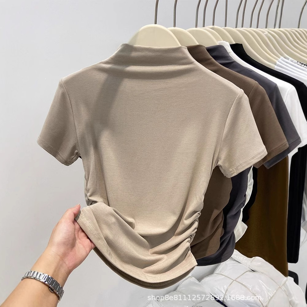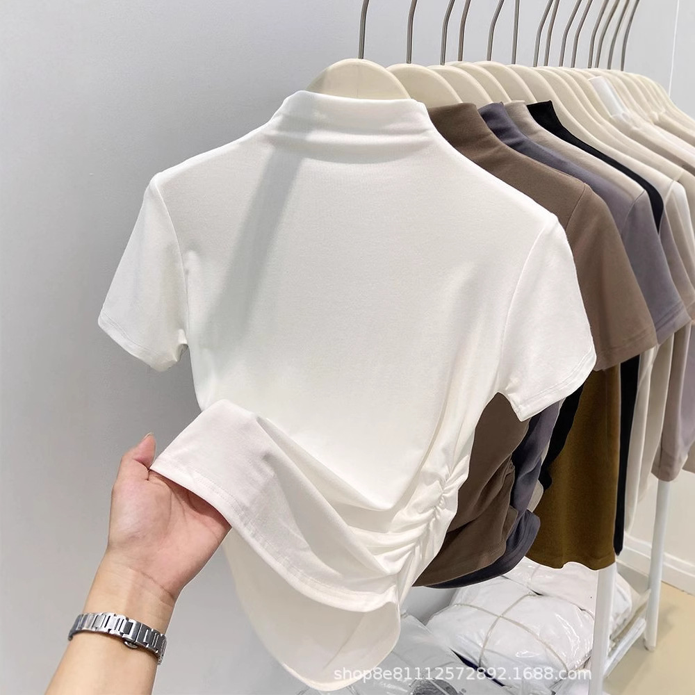 2024년 여름 신상 하프 터틀넥 허리 퓨어 코튼 반팔 티셔츠 여성용 주름 디자인 슬림핏 짧은 트렌디 인스토어 가기