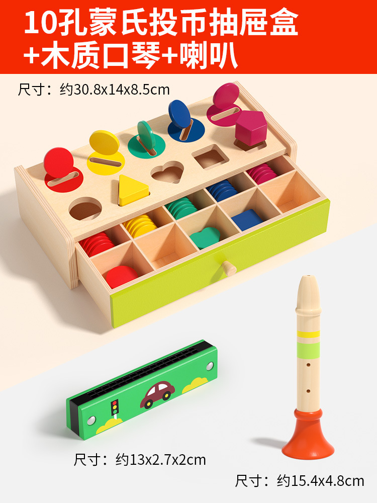 • 10홀 몬테소리 동전식 서랍 상자 + 나무 하모니카 + 스피커