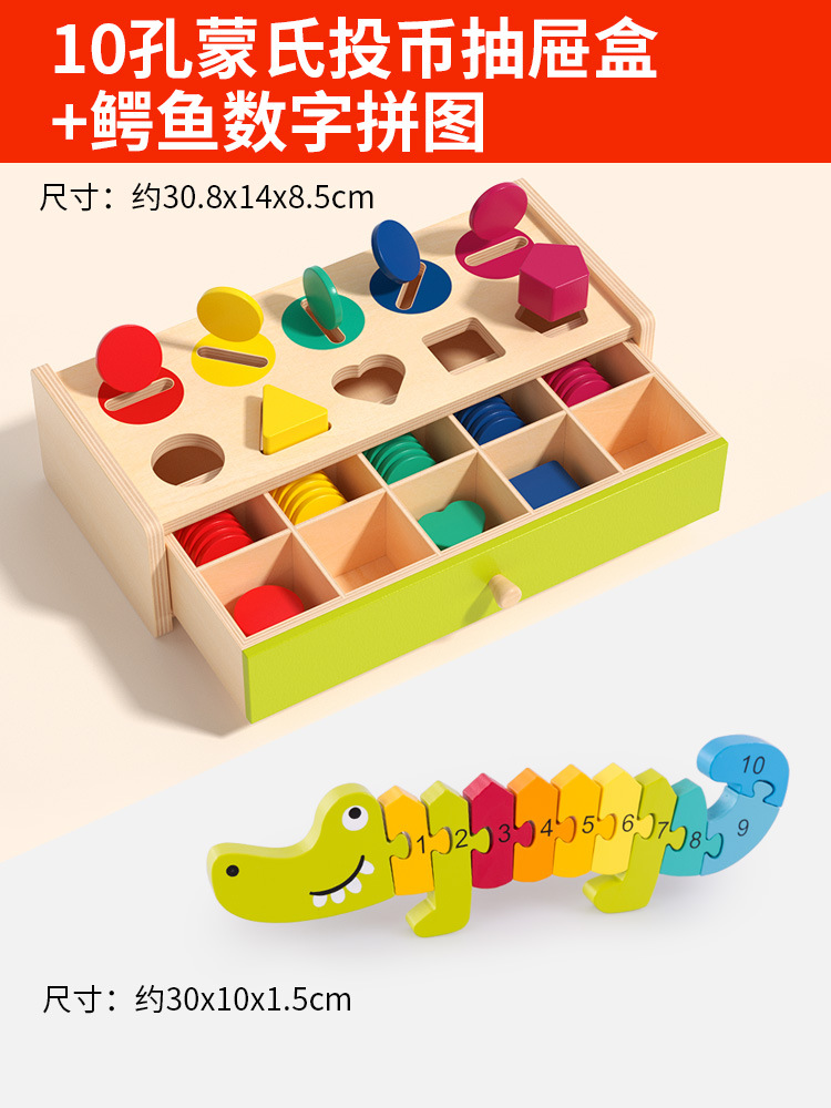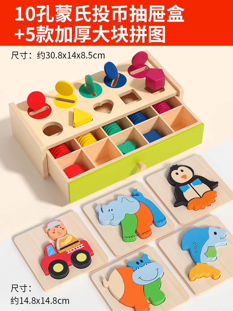 • 10홀 몬테소리 동전 투입식 서랍 상자 + 두꺼운 대형 퍼즐 5개