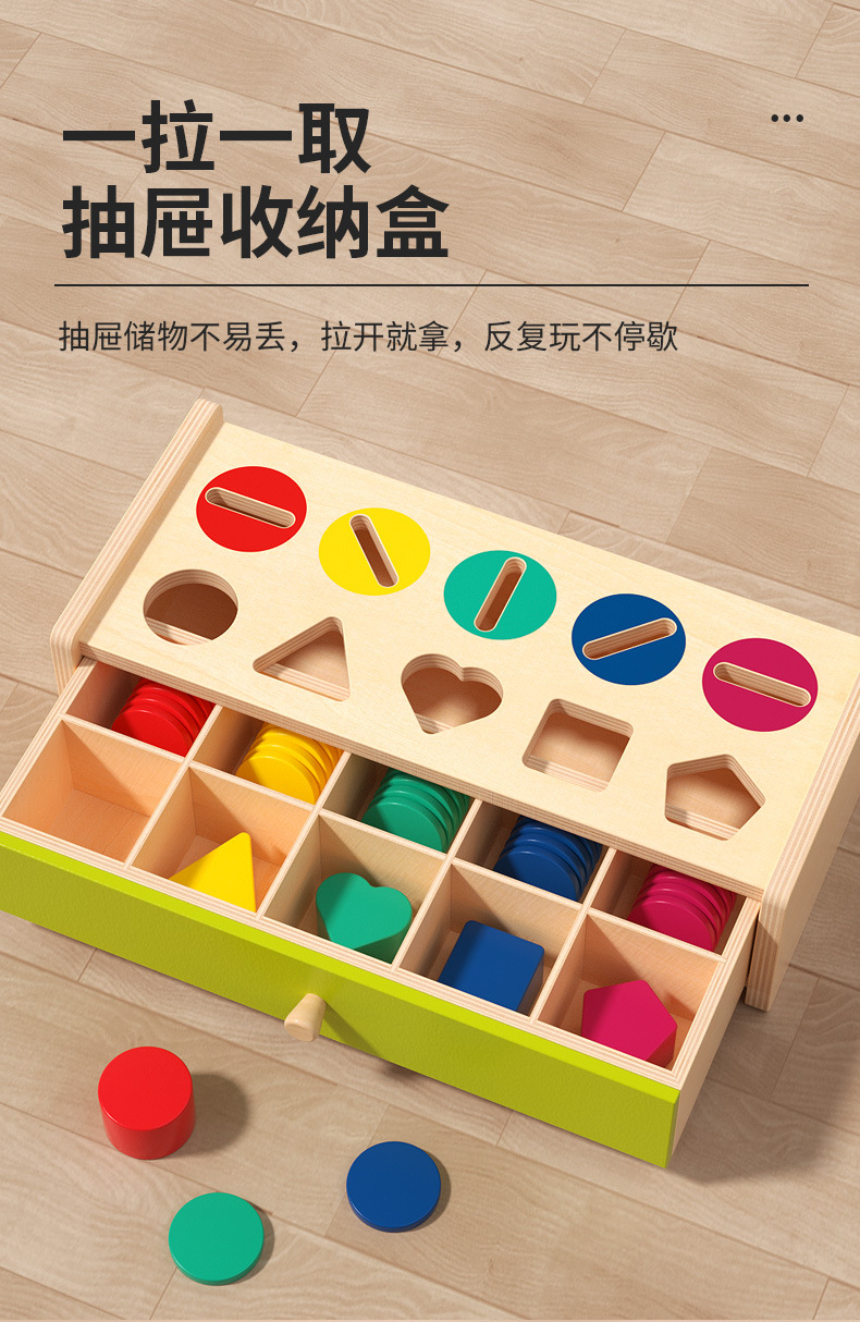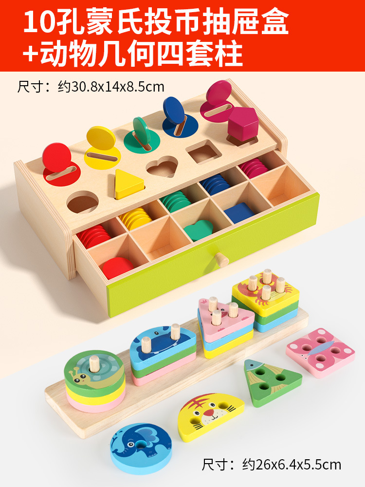 • 10홀 몬테소리 동전 투입식 서랍 상자 + 동물 기하학 기둥 4세트