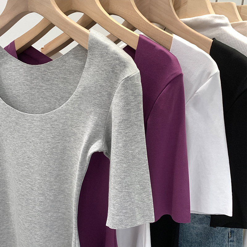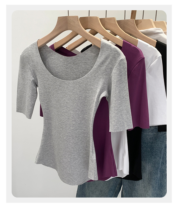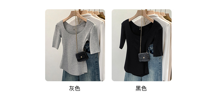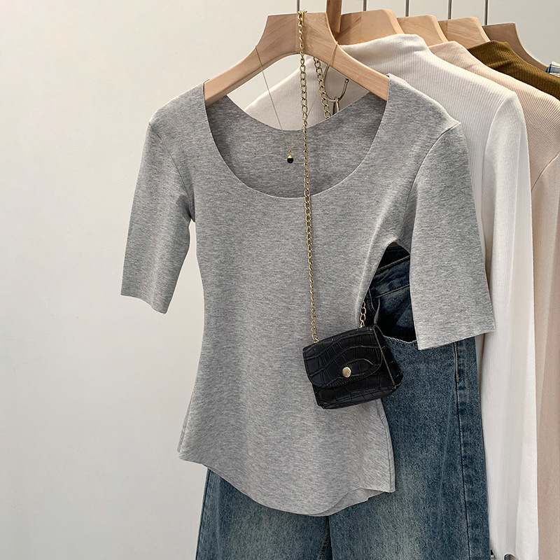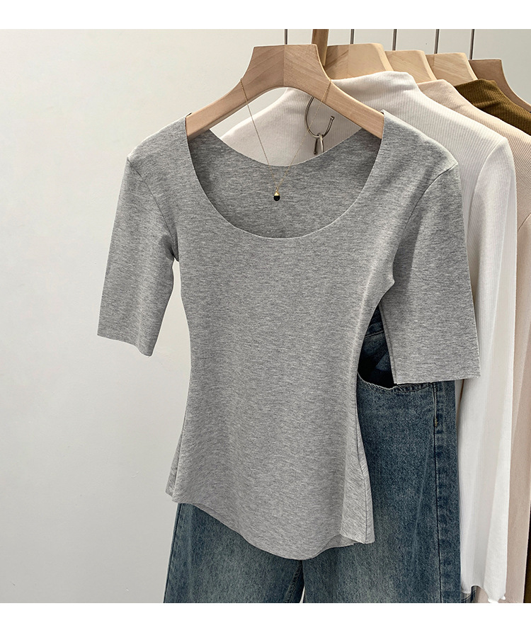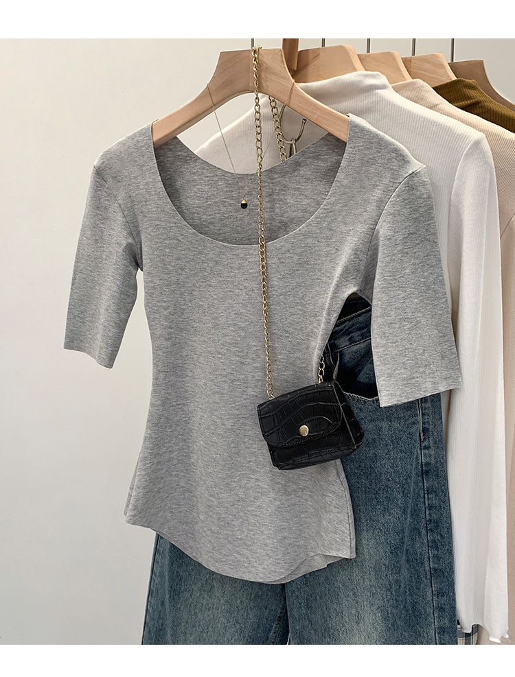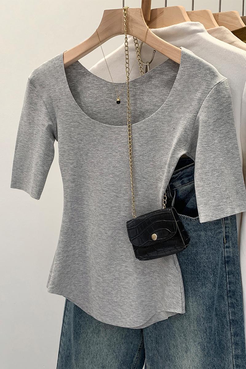 2026년 초봄 인기상품 그레이 U넥 반팔 티셔츠 여성 통근복 여름 신상품 유니크하고 예쁜 허리라인이 잘 드러나는 디자인