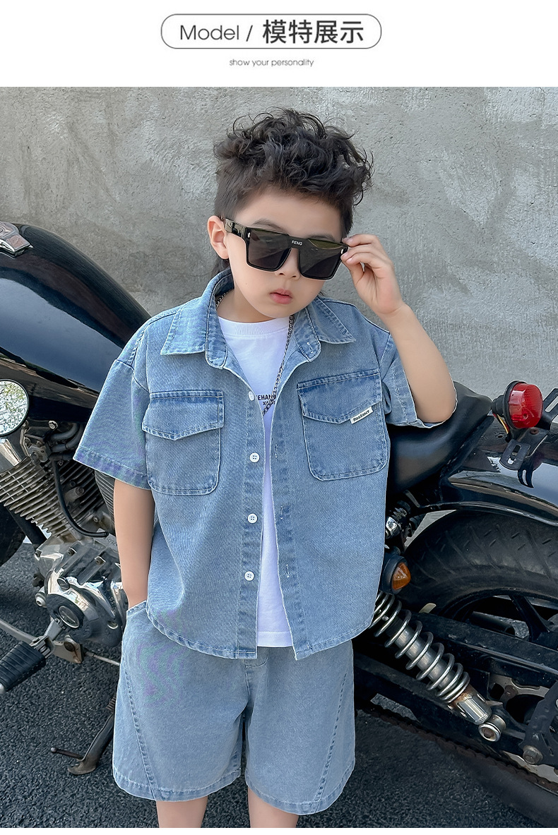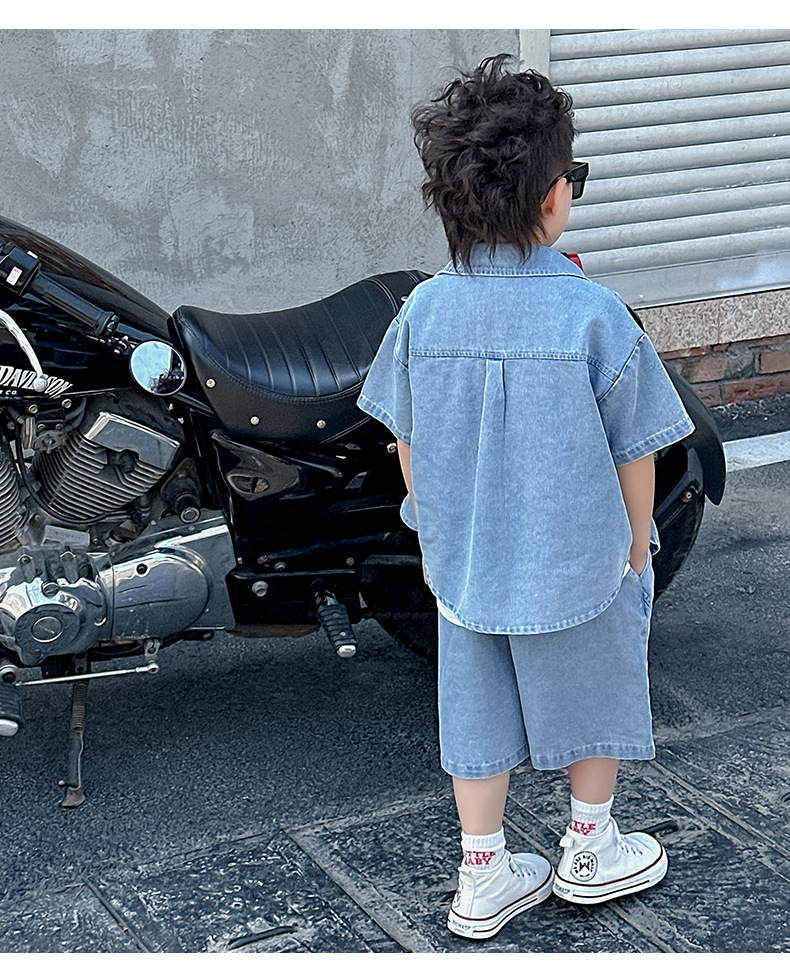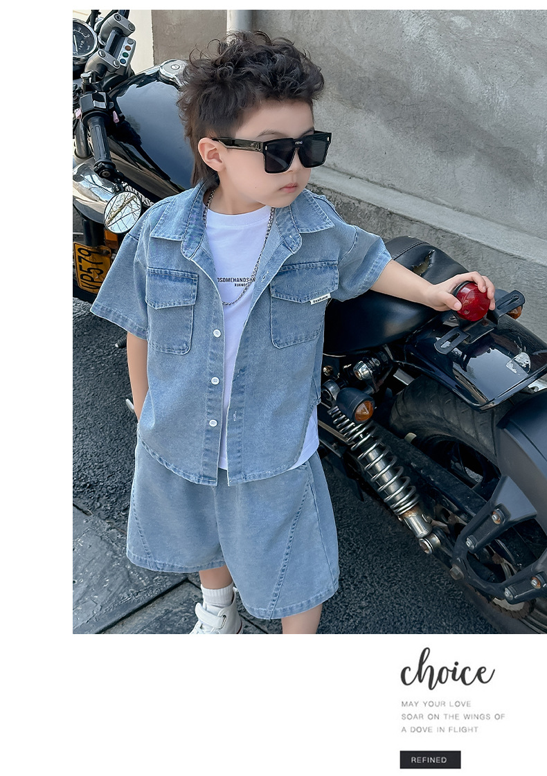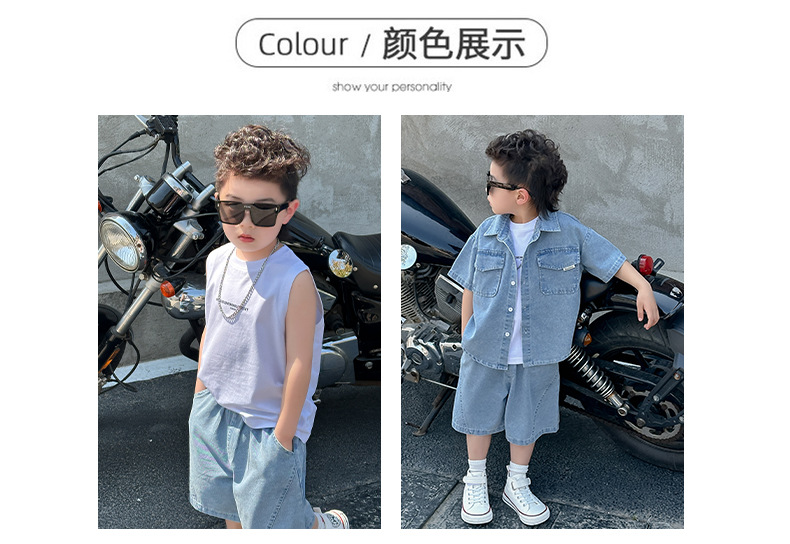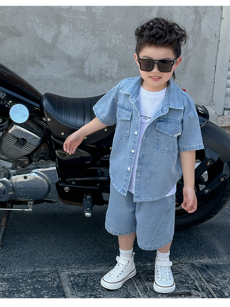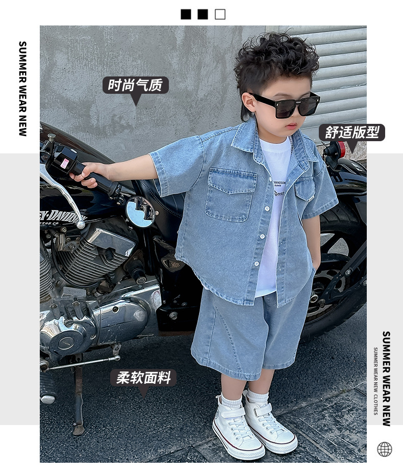 소년 정장 2025 새로운 여름 옷 어린이 잘 생긴 반팔 데님 셔츠 소년 조끼 바지 두 조각 얇은 세트스토어 가기