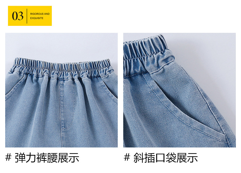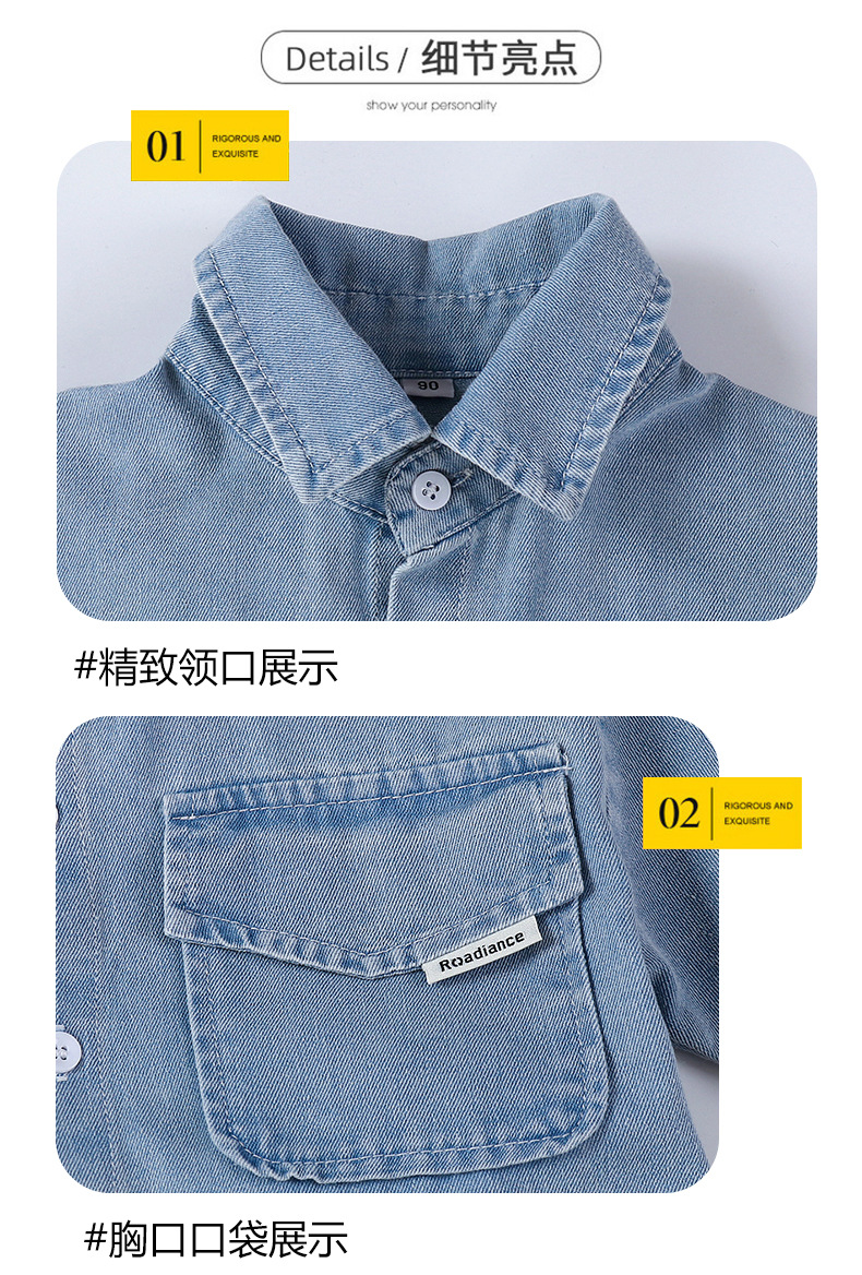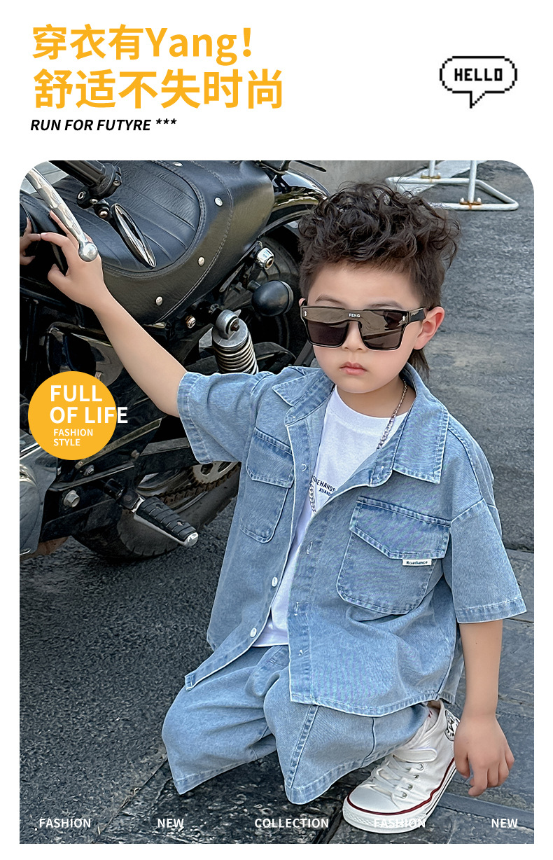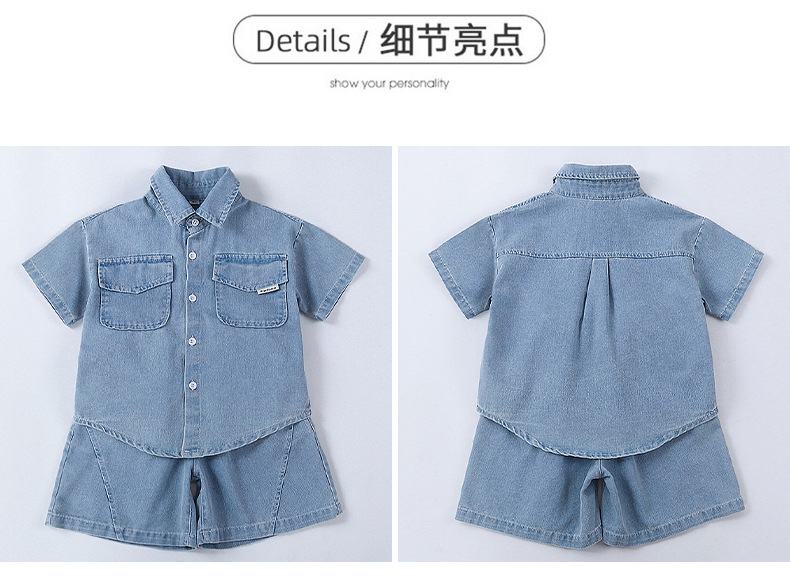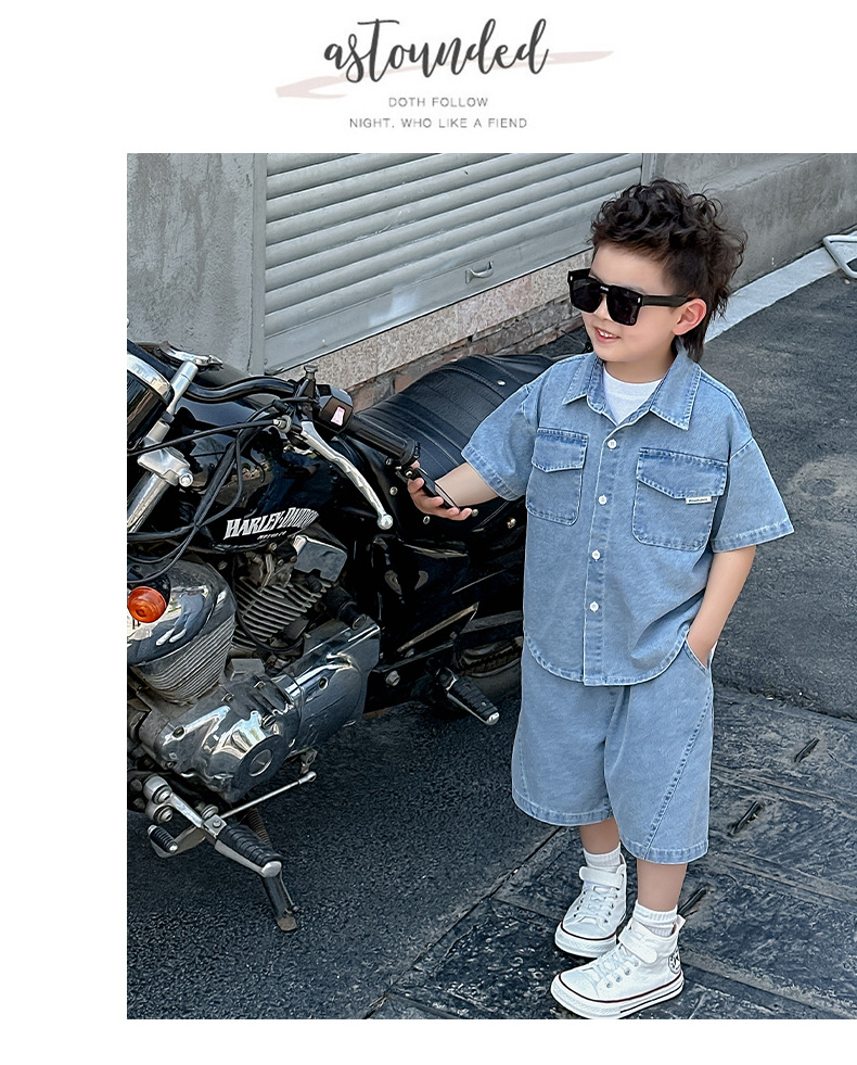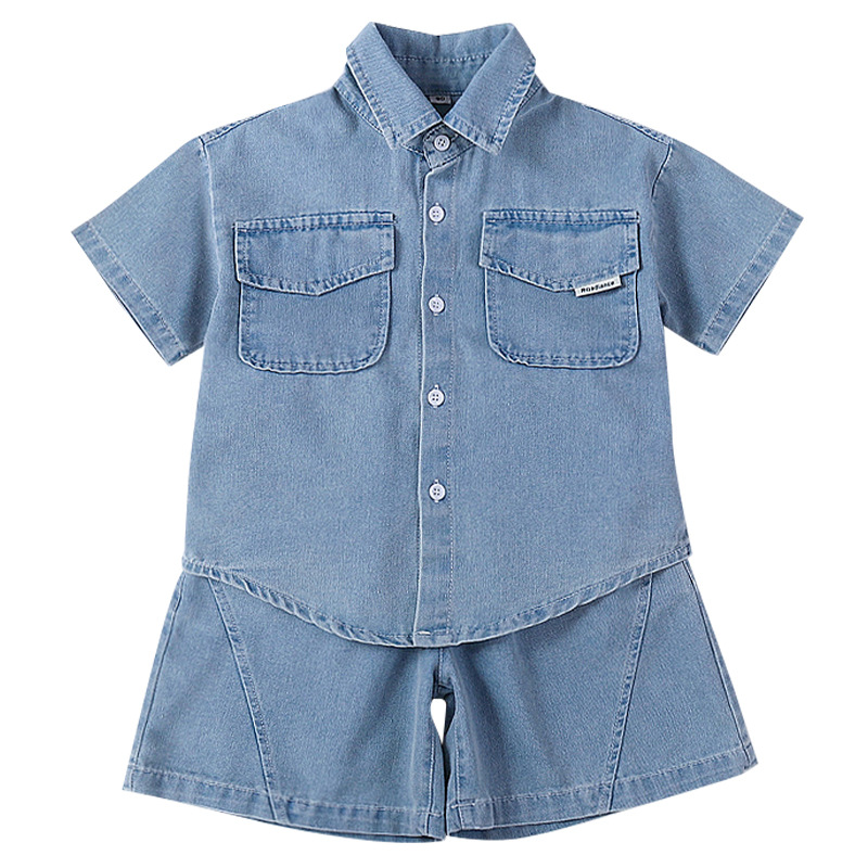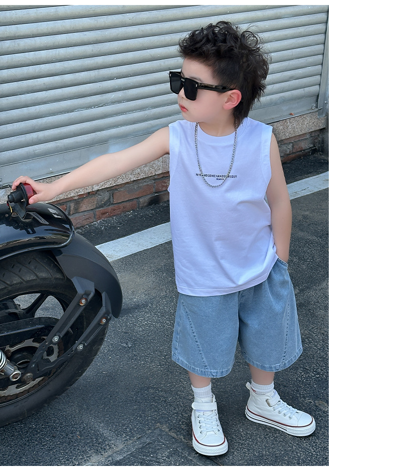 소년 정장 2025 새로운 여름 옷 어린이 잘 생긴 반팔 데님 셔츠 소년 조끼 바지 두 조각 얇은 세트스토어 가기