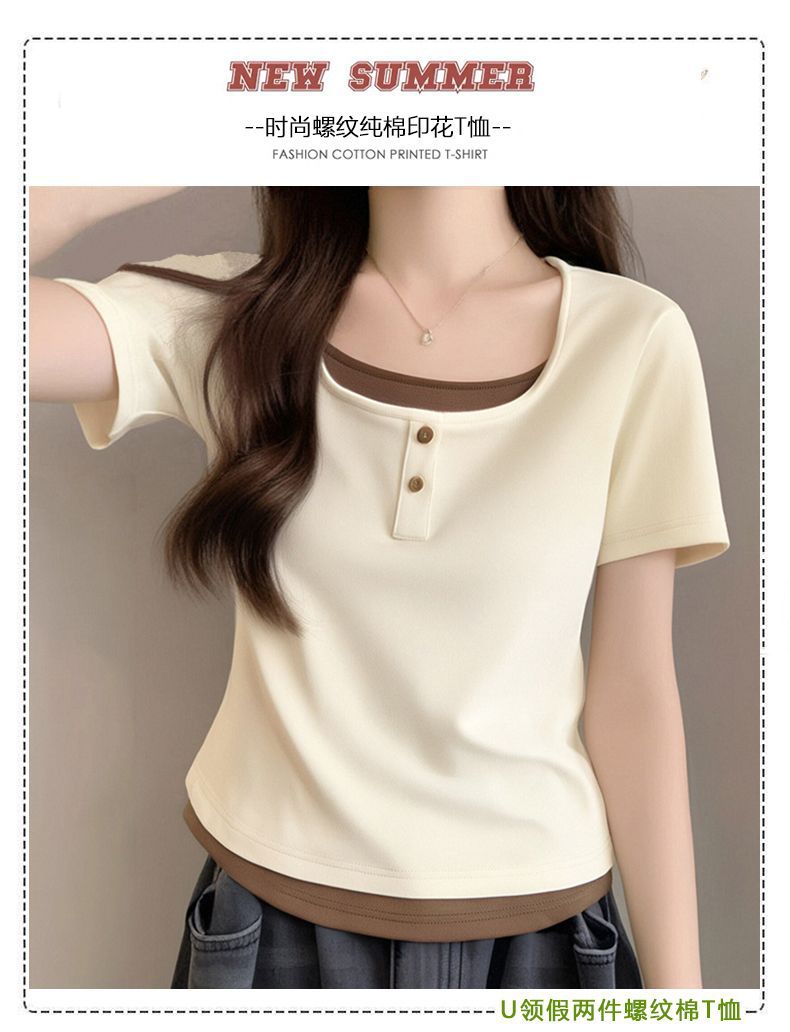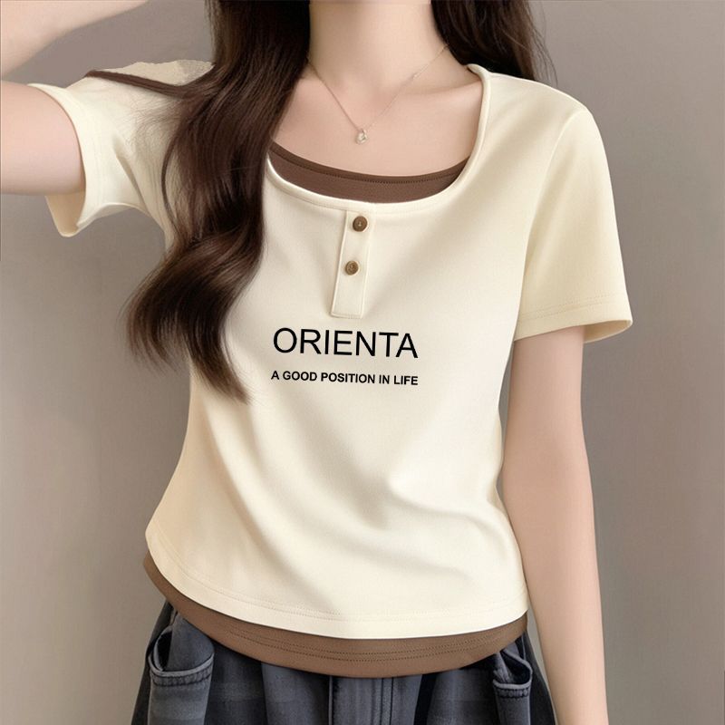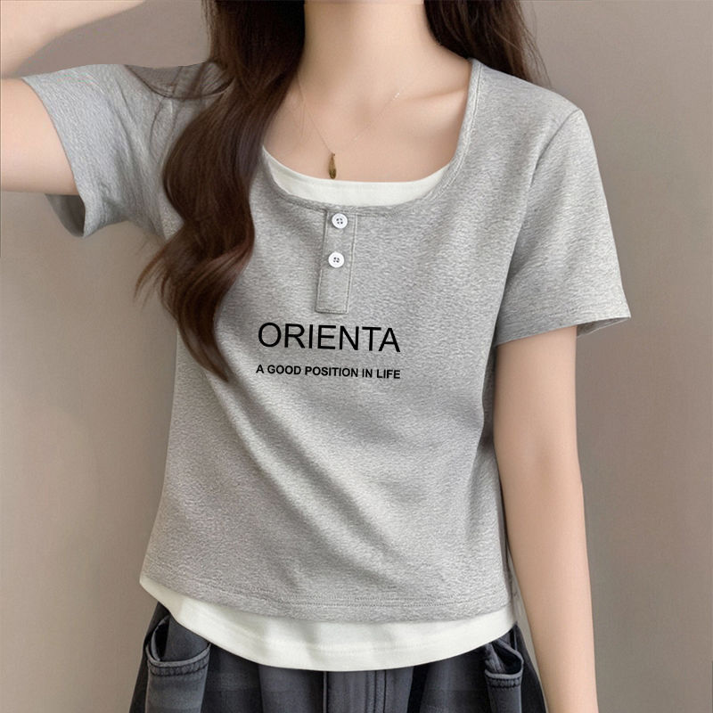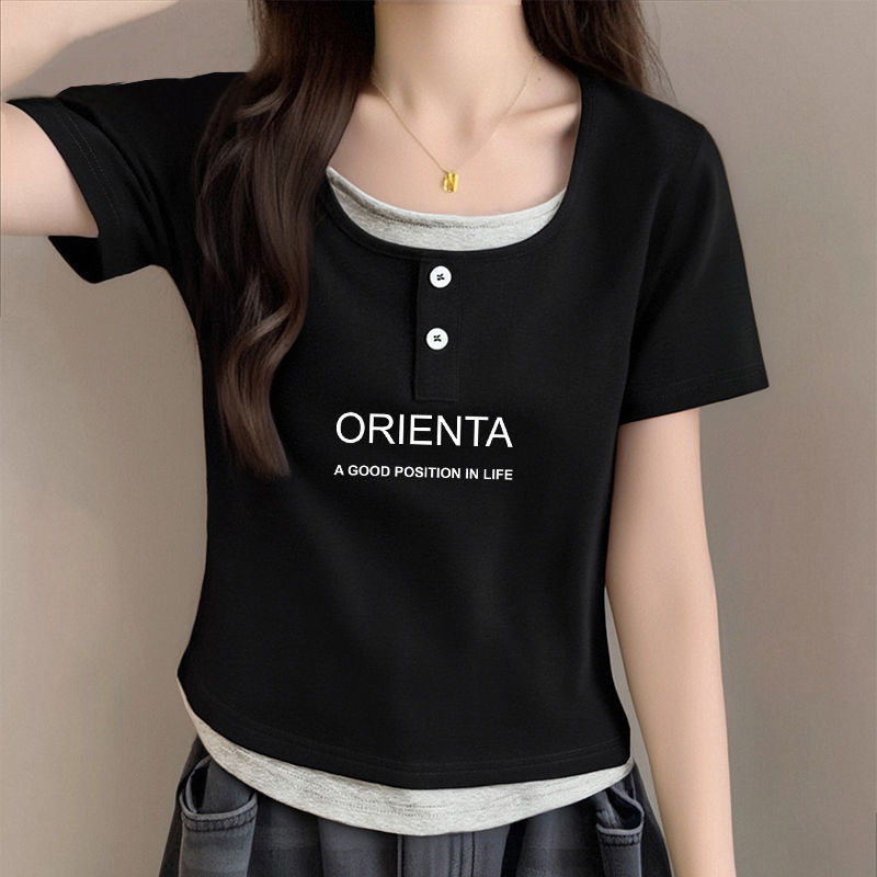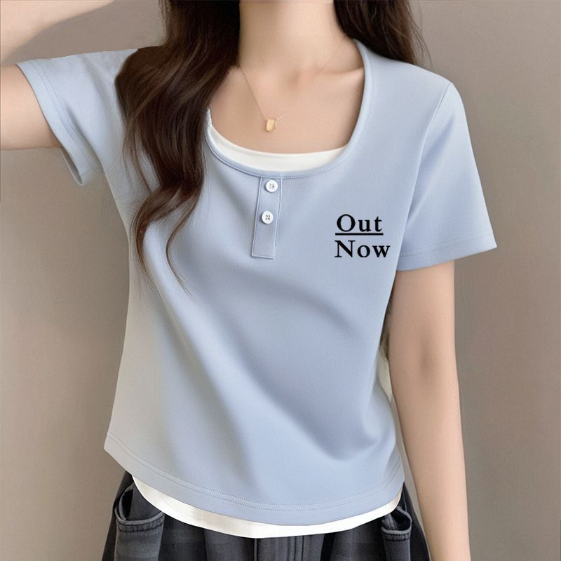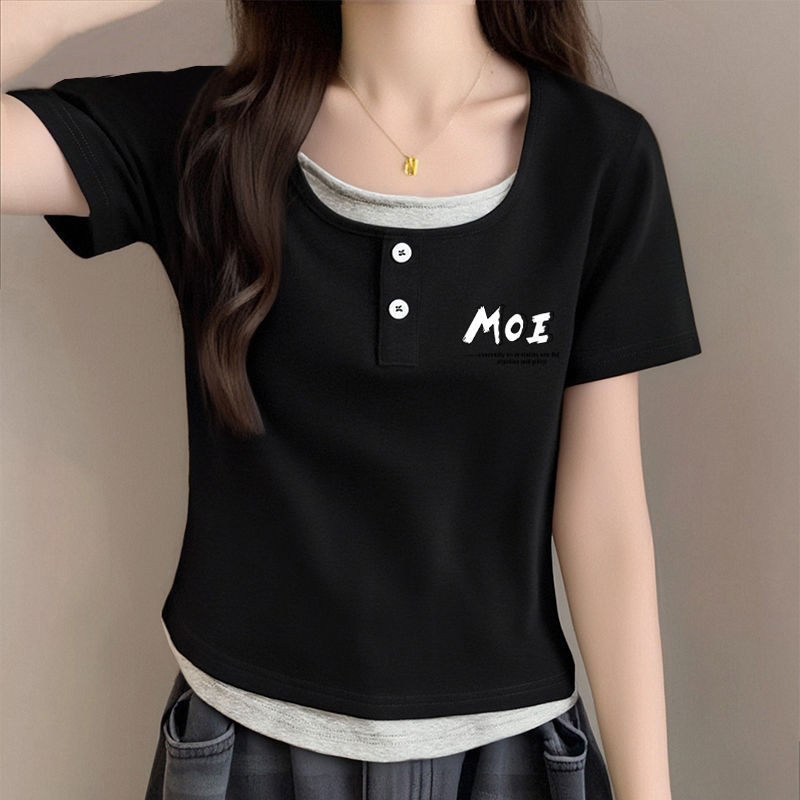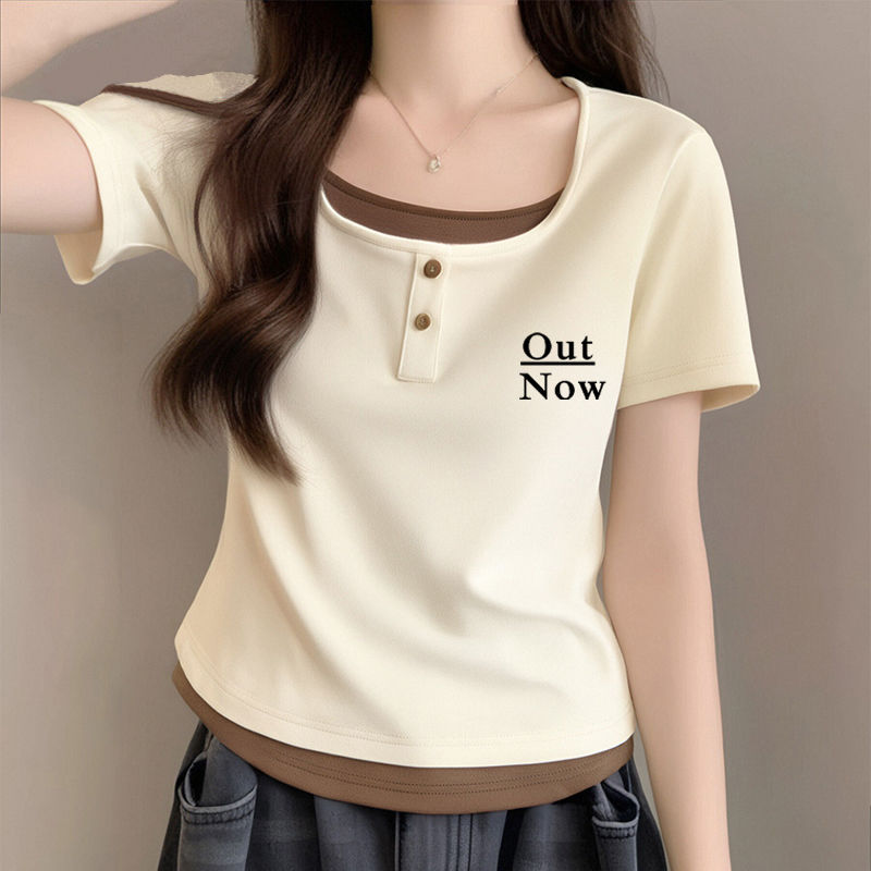 뚱뚱한 자매 어깨 반팔 티셔츠 여자 2025 년 새 여름 슬림핏 올매치 쇼트 스파이스 소녀 가짜 투피스 스몰 탑스토어 가기