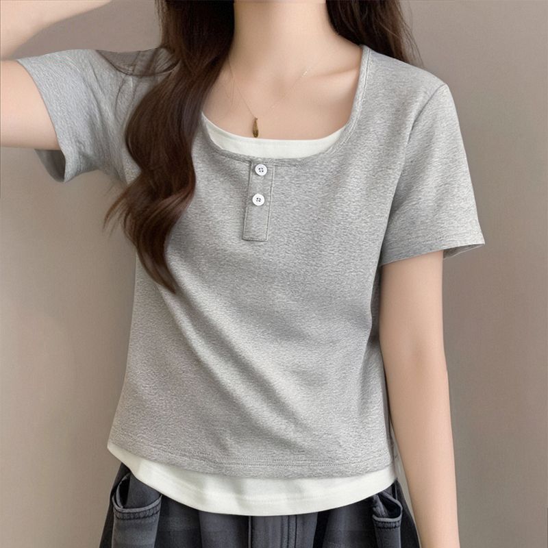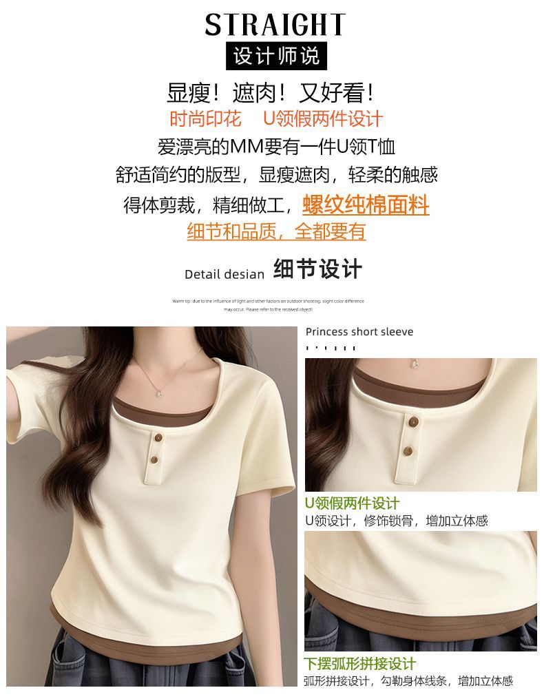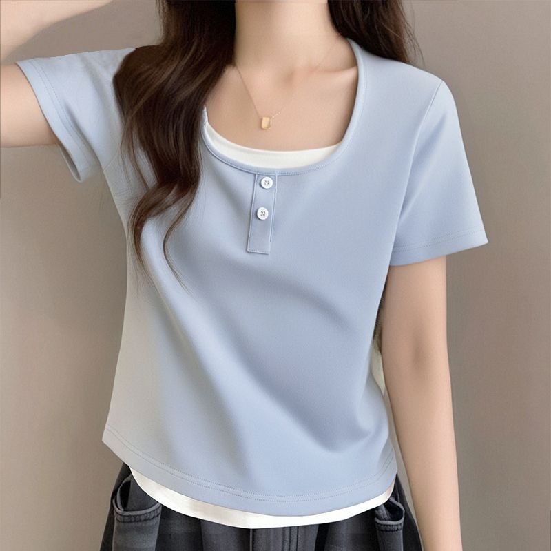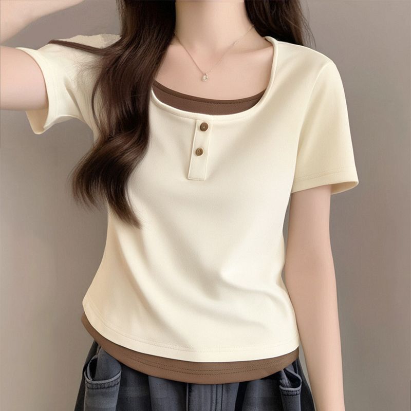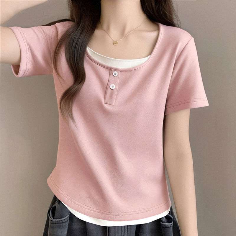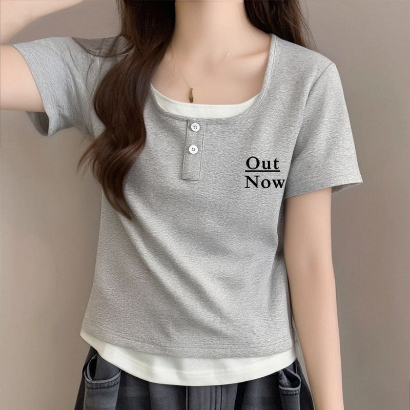 뚱뚱한 자매 어깨 반팔 티셔츠 여자 2025 년 새 여름 슬림핏 올매치 쇼트 스파이스 소녀 가짜 투피스 스몰 탑스토어 가기