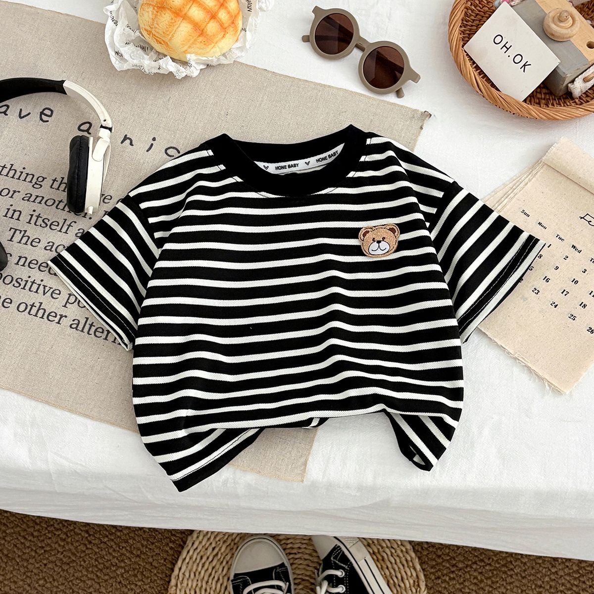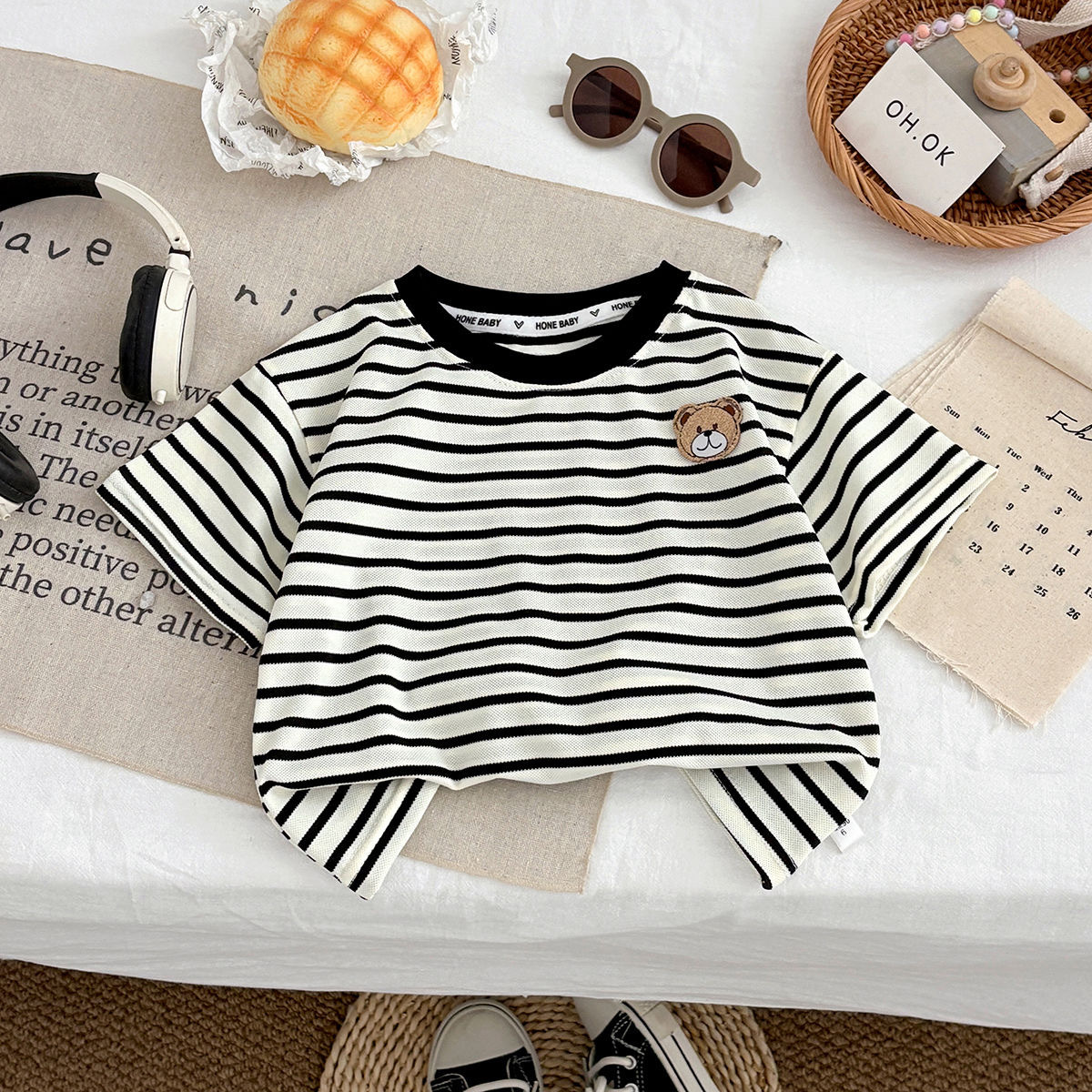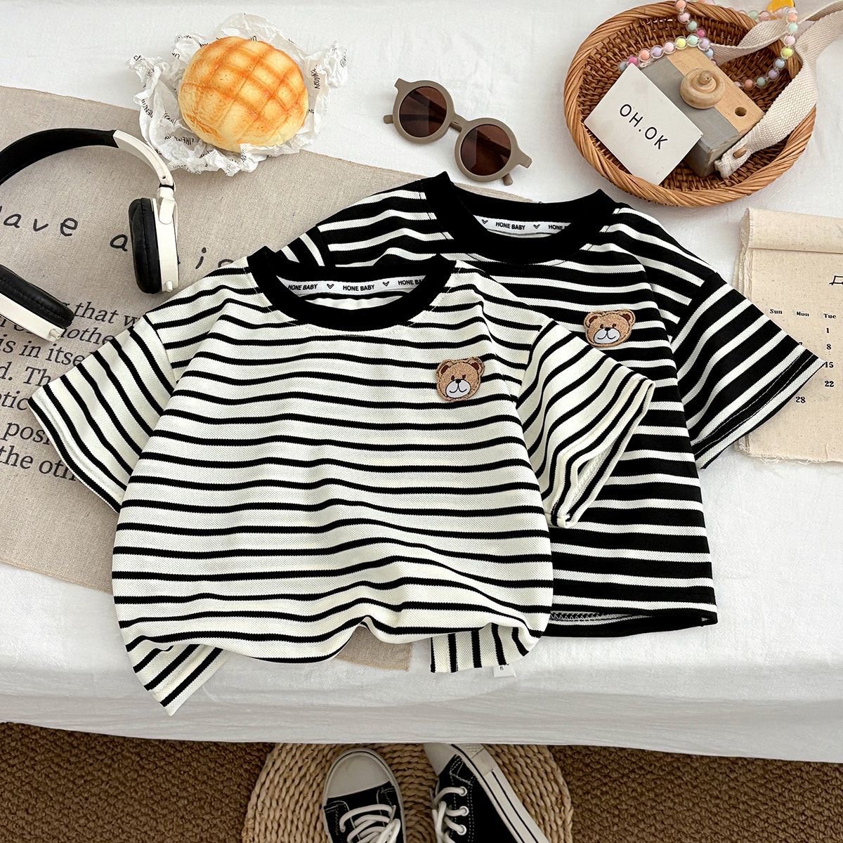 2026년 신상 한국판 스트라이프 곰돌이 반팔 티셔츠 심플하고 캐주얼하며 귀엽고 다용도로 활용 가능한 중소형 아동용 상의