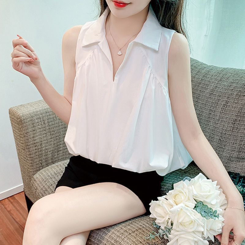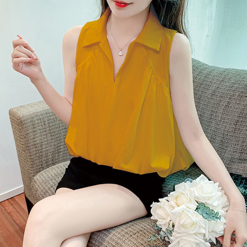 여성용 민소매 쉬폰 셔츠, 루즈한 배 커버 셔츠, 여름 신작 패셔너블 셔츠, 여성용 짧은 상의