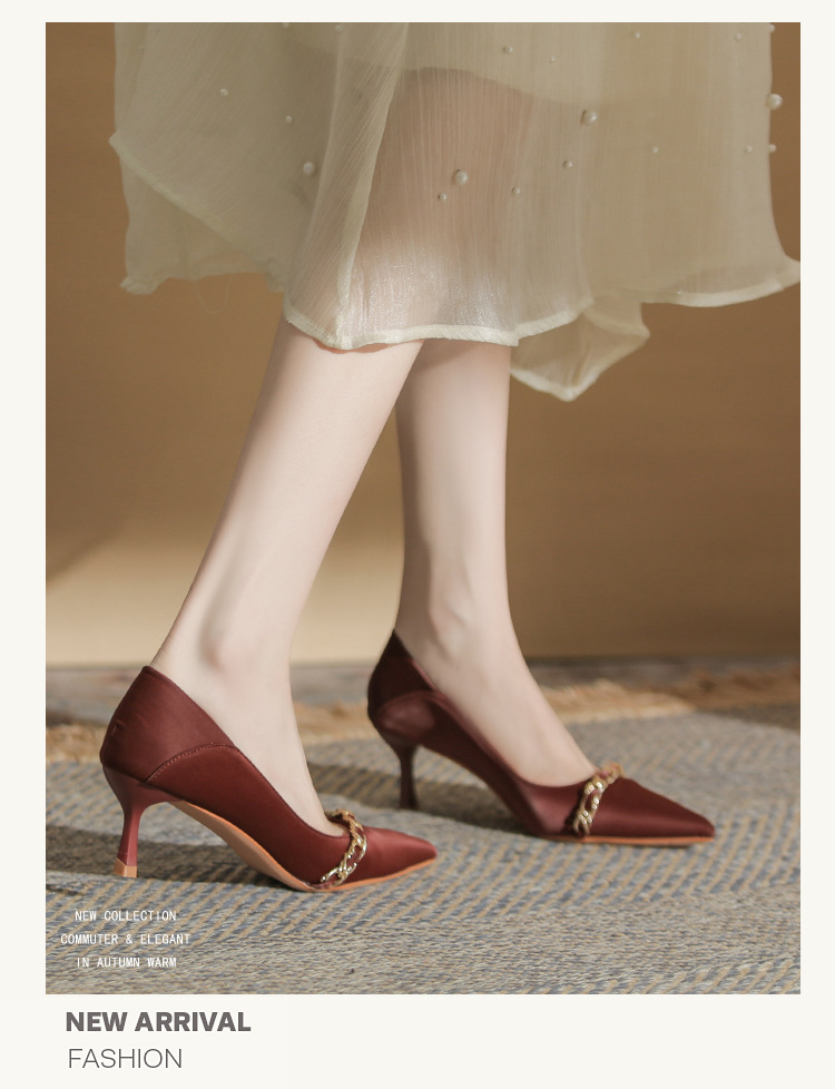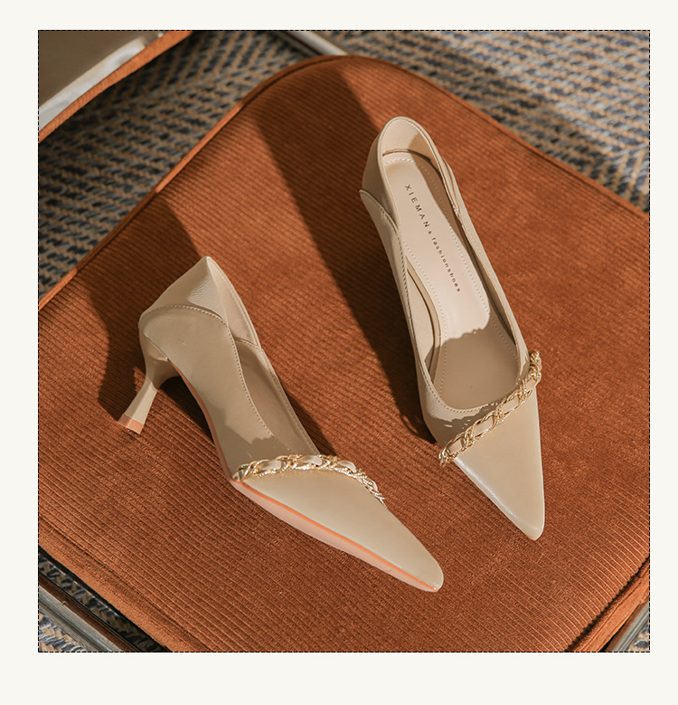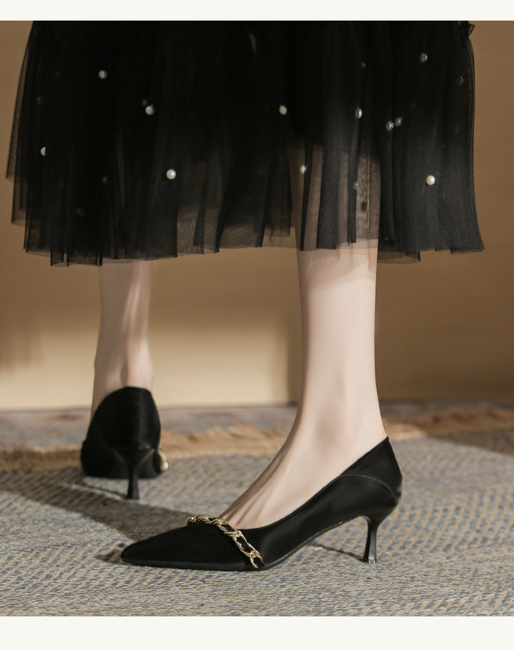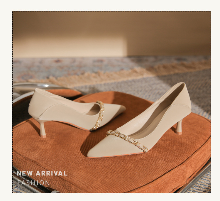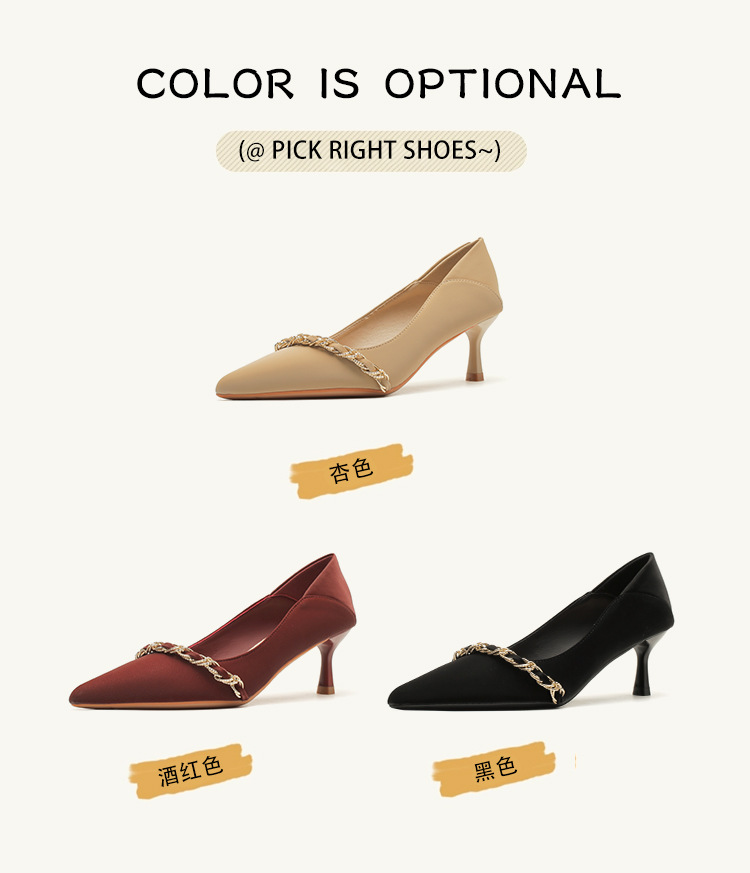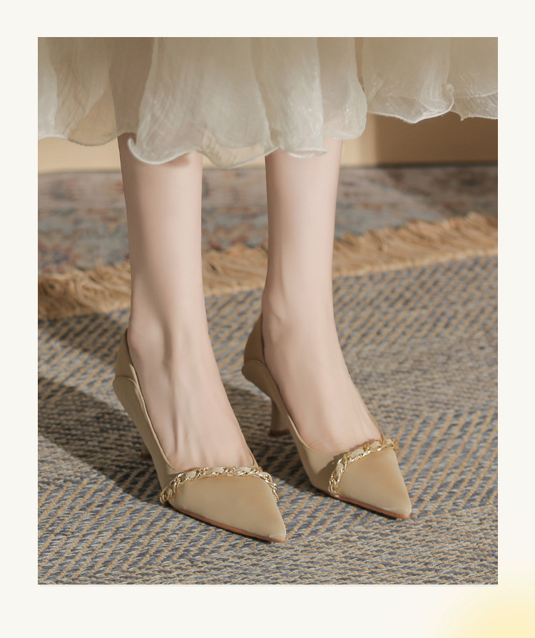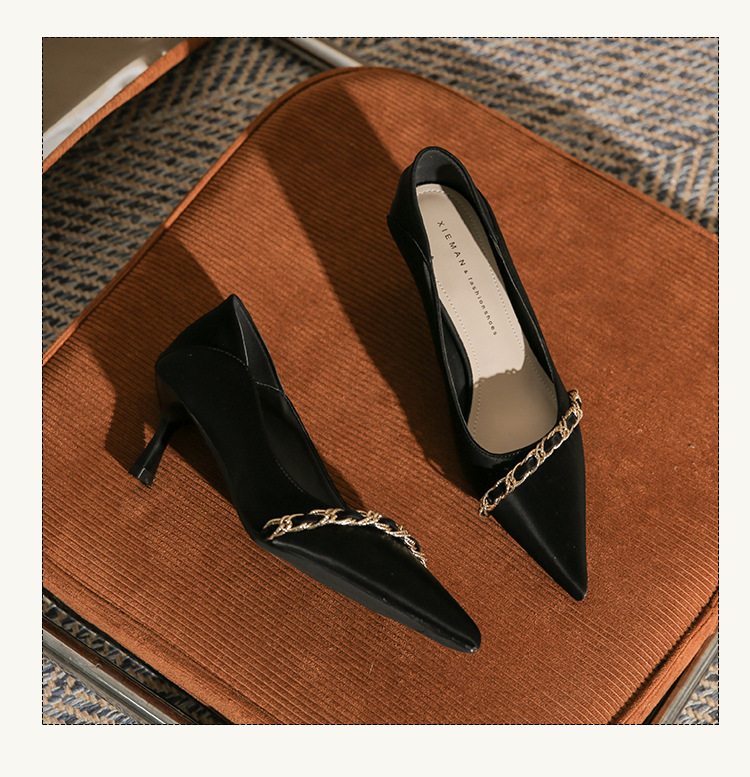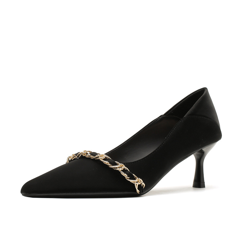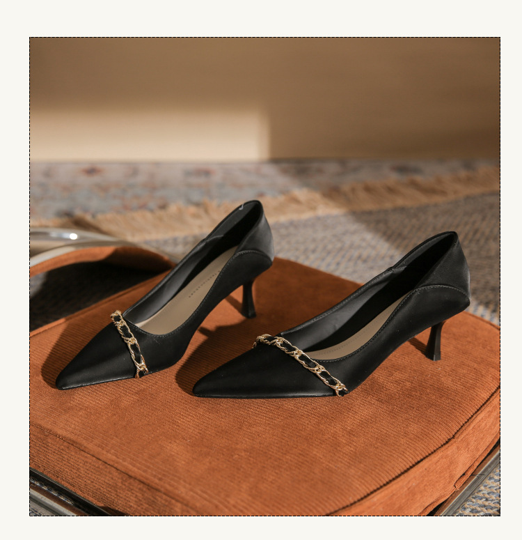 사계절 착용 가능한 Qianlihu 프렌치 엘레강스 여성화, 스틸레토 힐, 뾰족한 메탈 체인, 전문 통근 하이힐