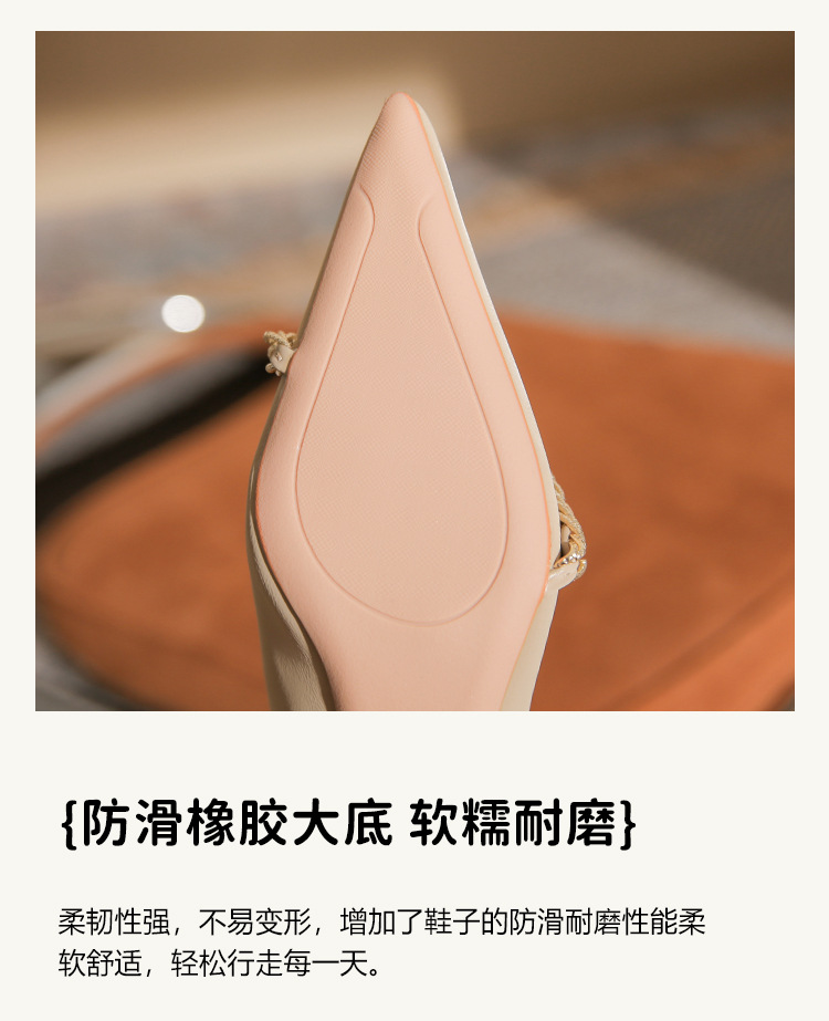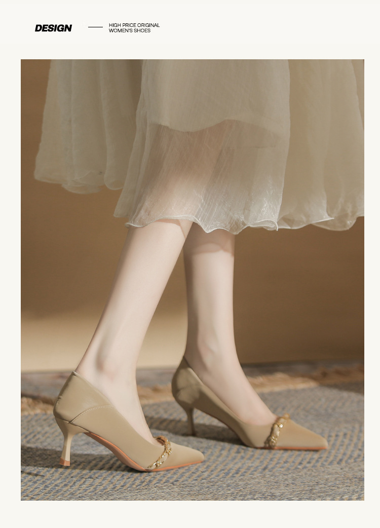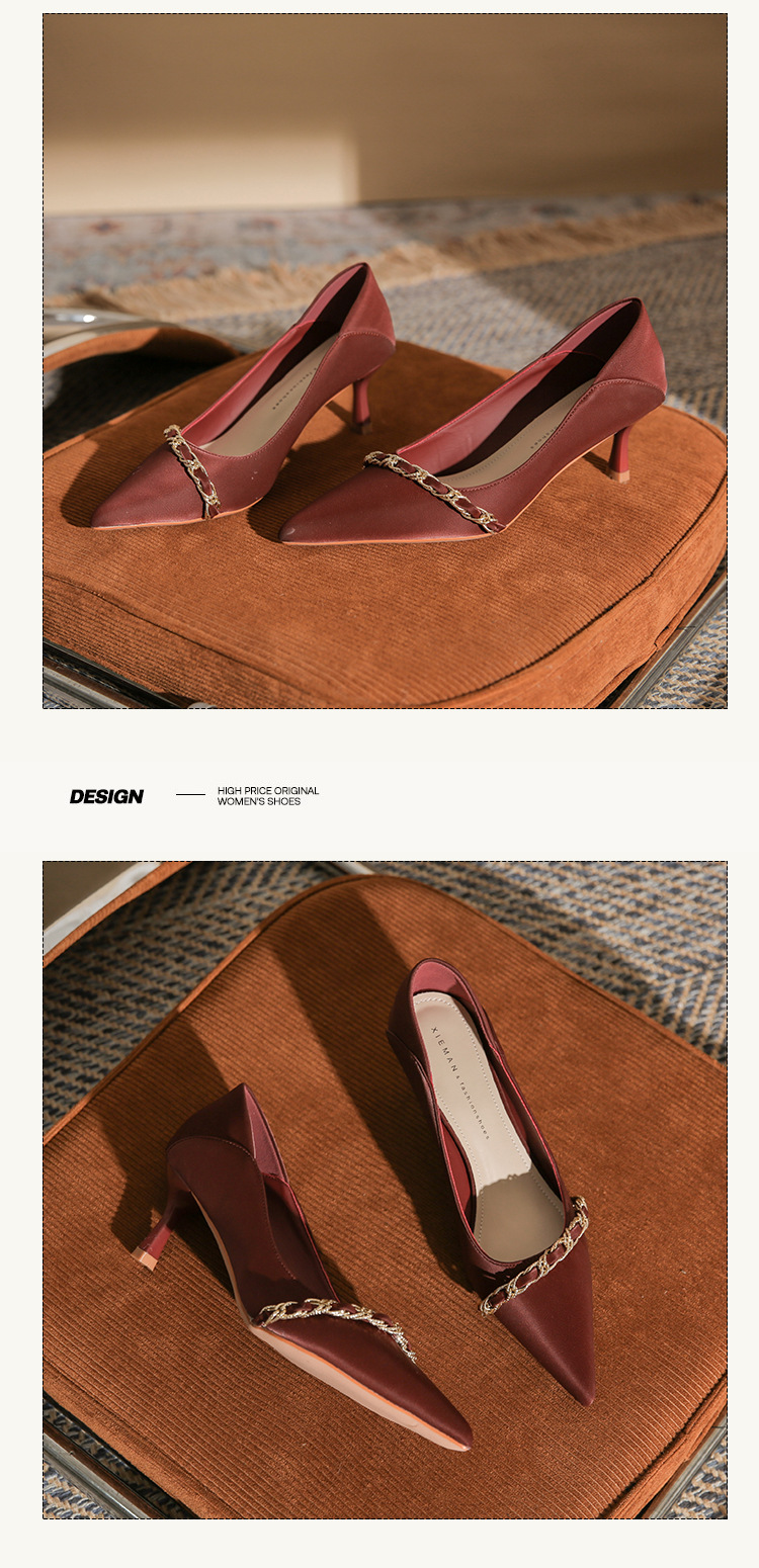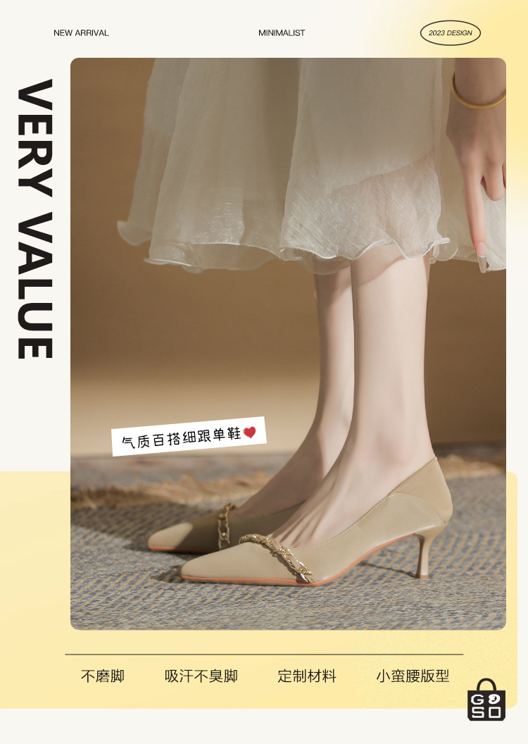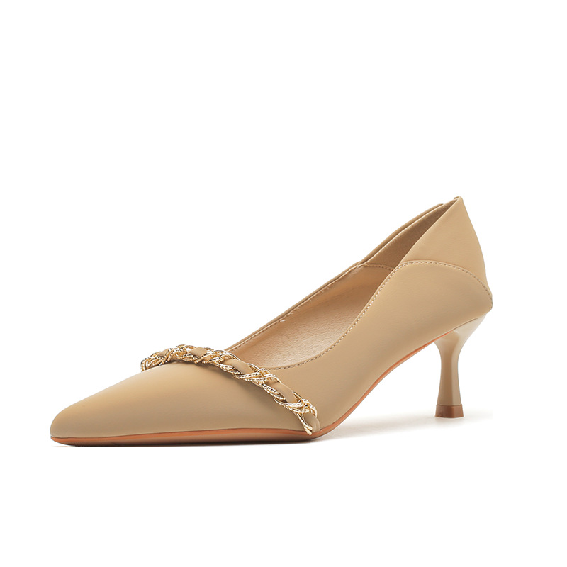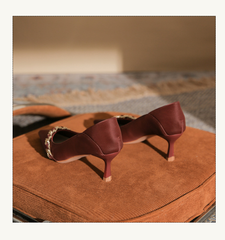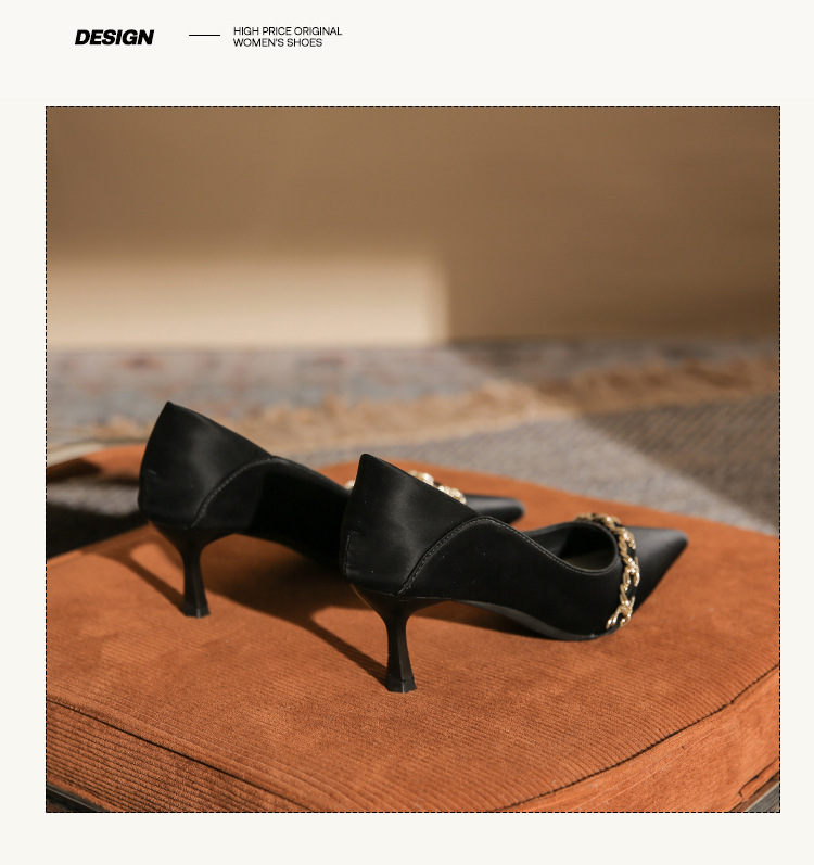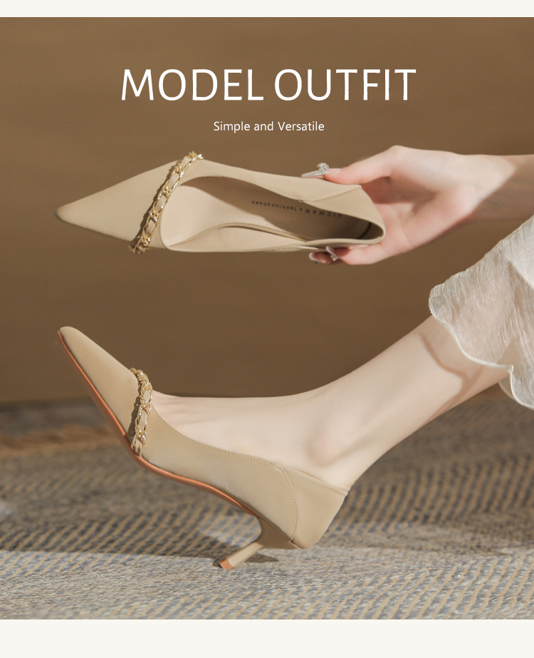 사계절 착용 가능한 Qianlihu 프렌치 엘레강스 여성화, 스틸레토 힐, 뾰족한 메탈 체인, 전문 통근 하이힐