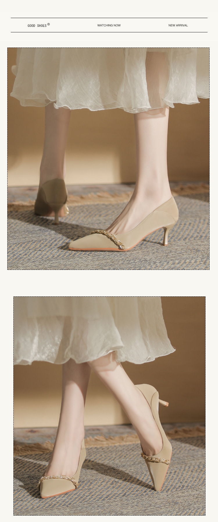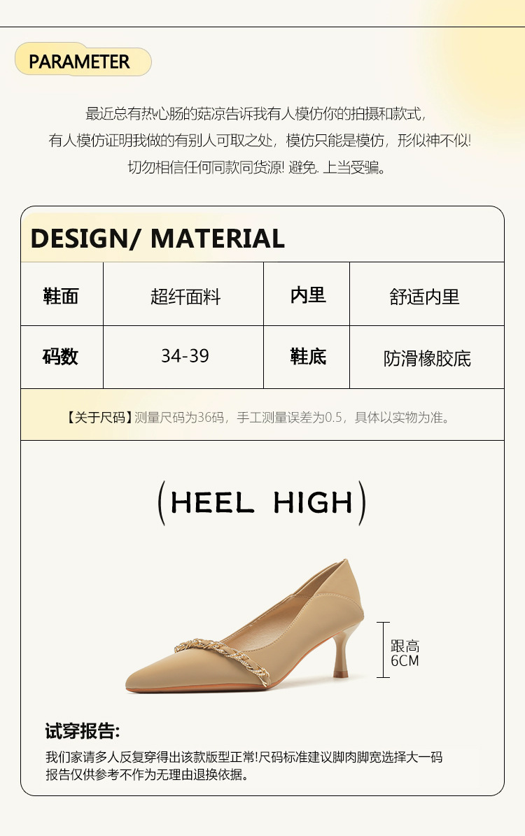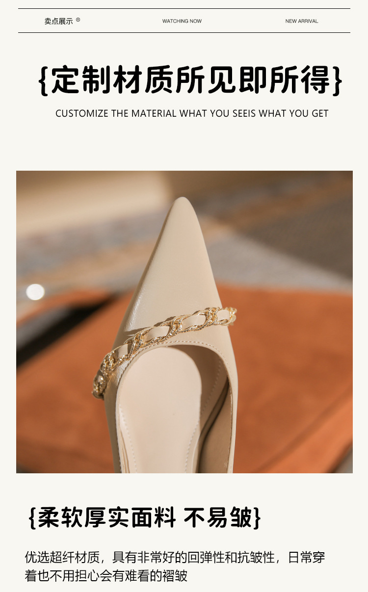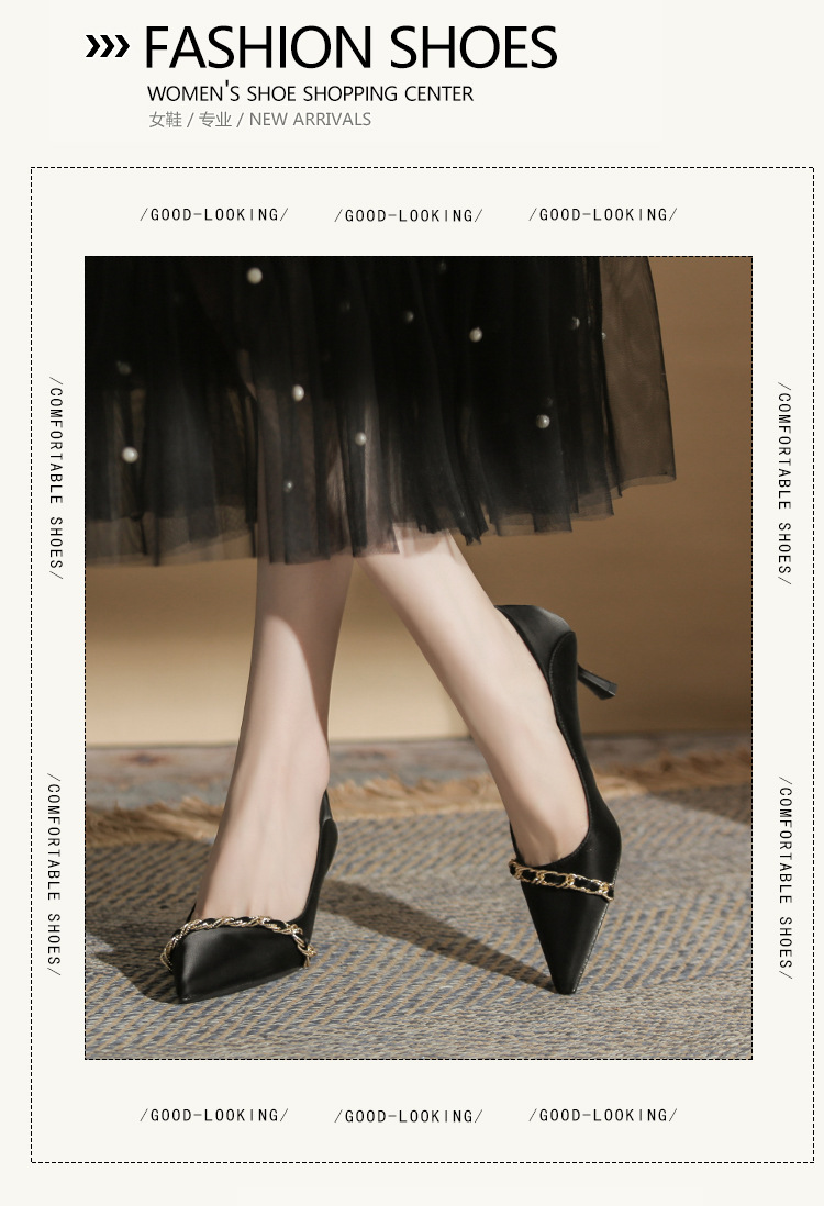 사계절 착용 가능한 Qianlihu 프렌치 엘레강스 여성화, 스틸레토 힐, 뾰족한 메탈 체인, 전문 통근 하이힐스토어 가기