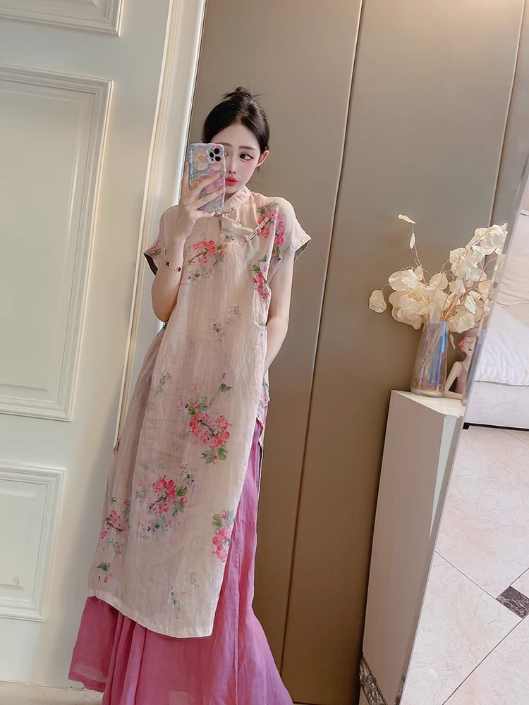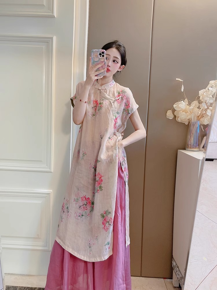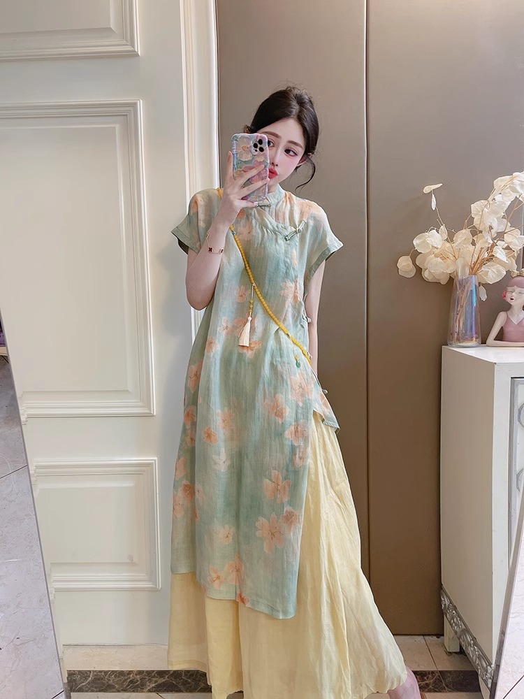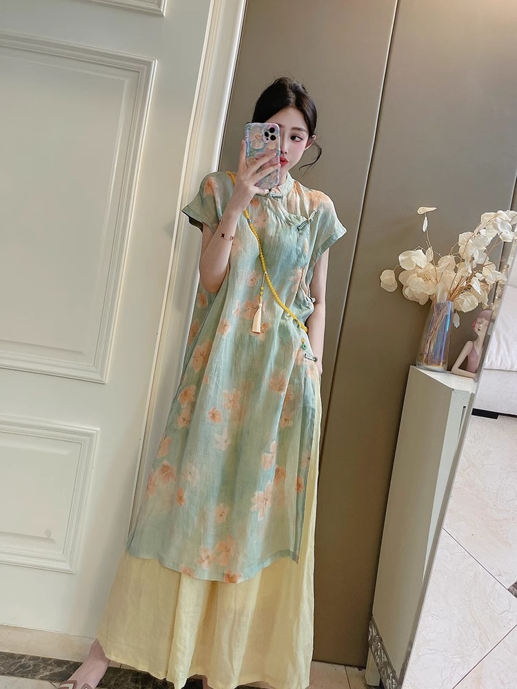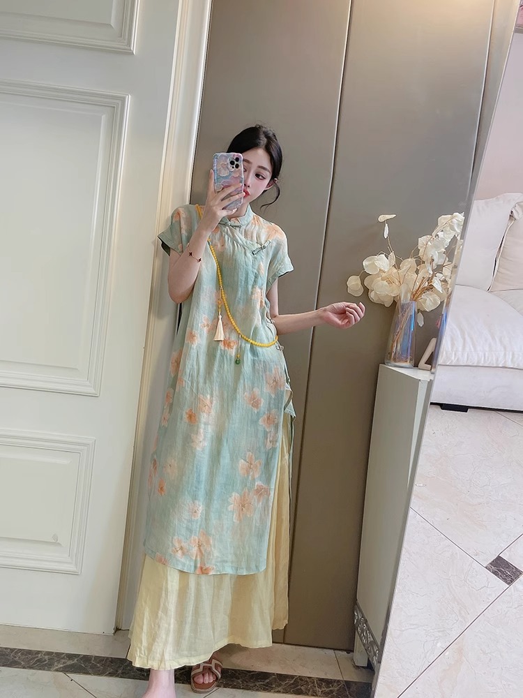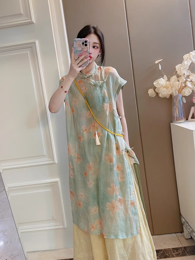 차가운 바람 버클 경사 플래켓 코튼 리넨 여성용 중장 원피스 여름 예술적 차 세트 사이드 스플릿 가운