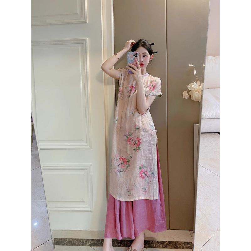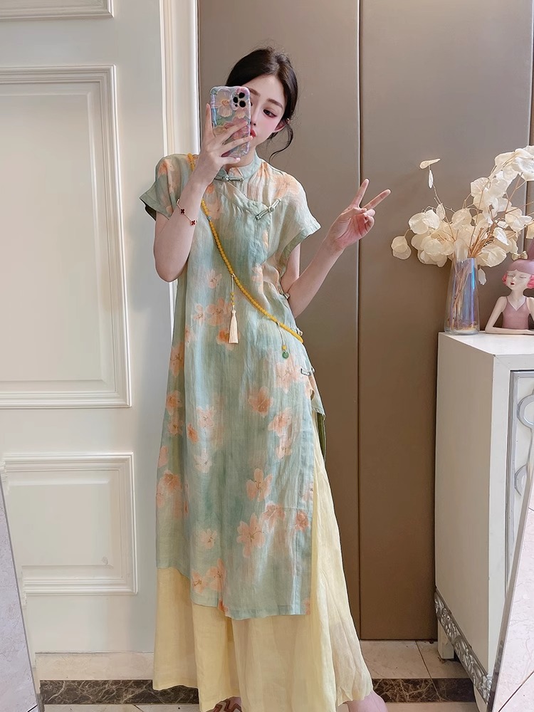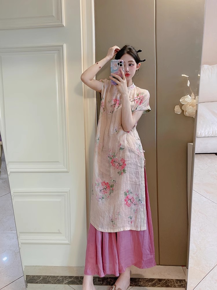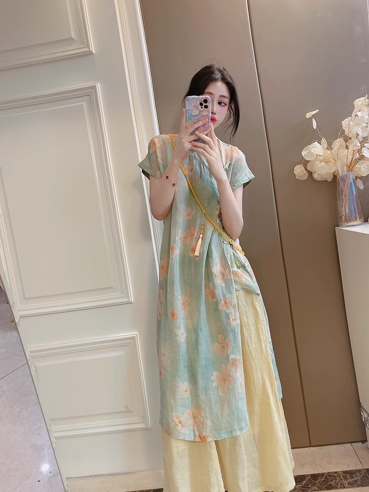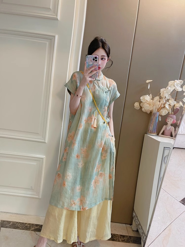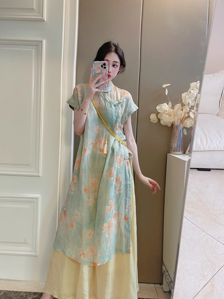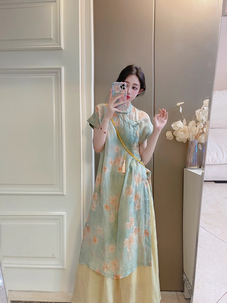 차가운 바람 버클 경사 플래켓 코튼 리넨 여성용 중장 원피스 여름 예술적 차 세트 사이드 스플릿 가운