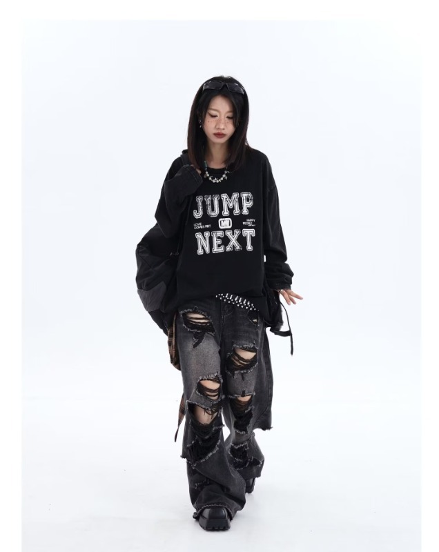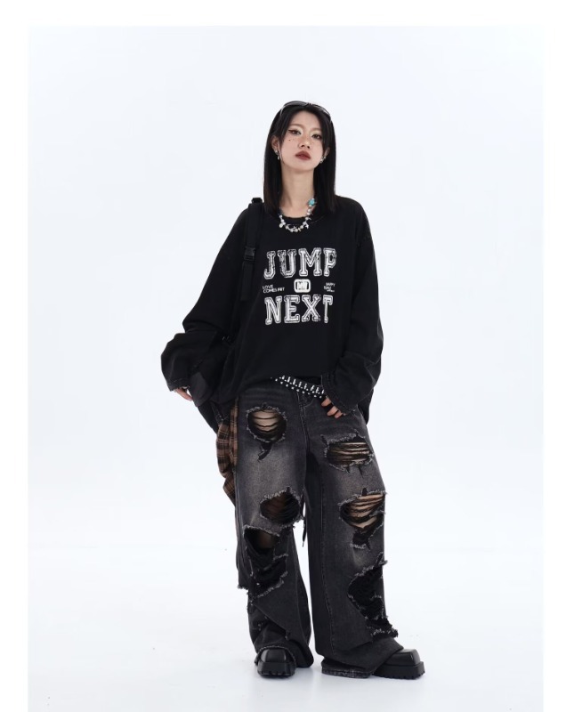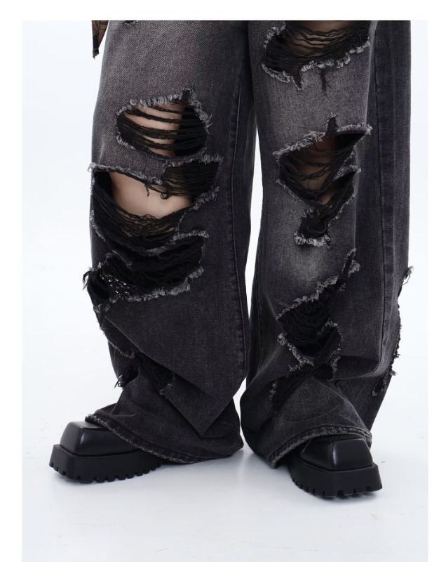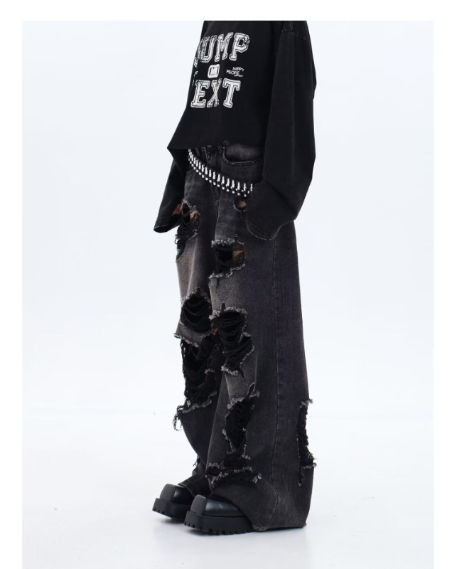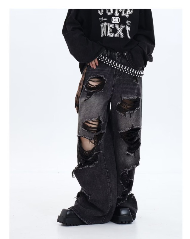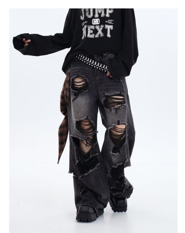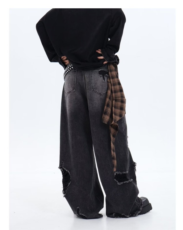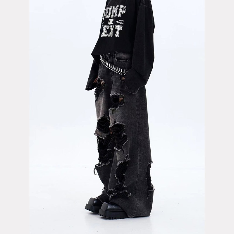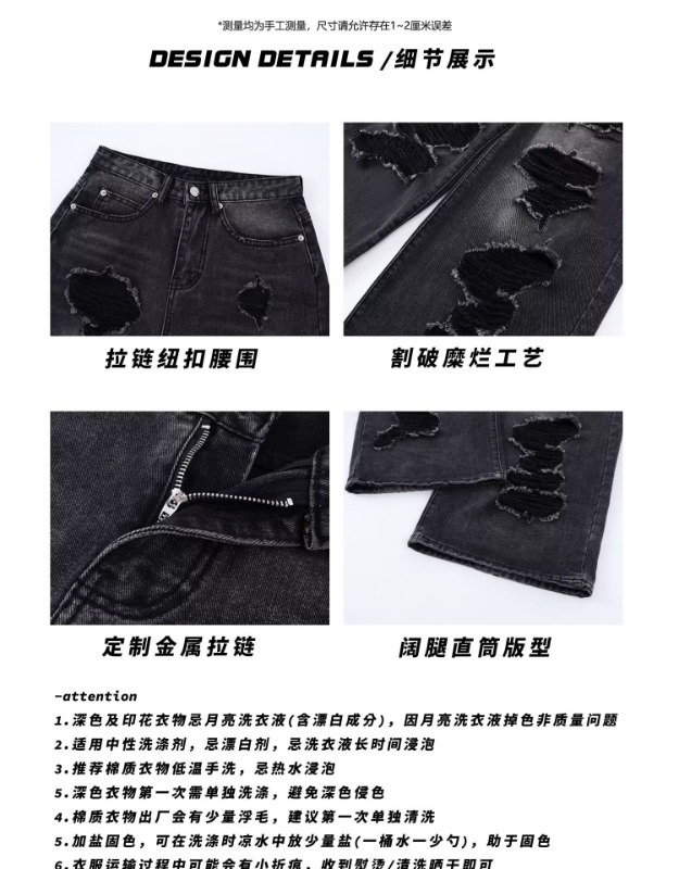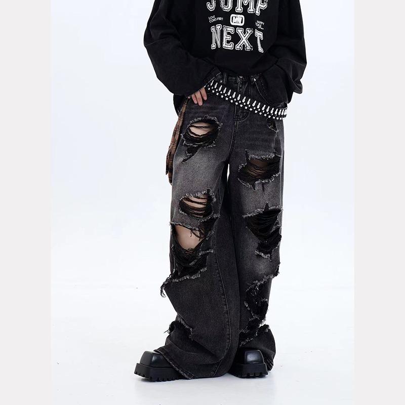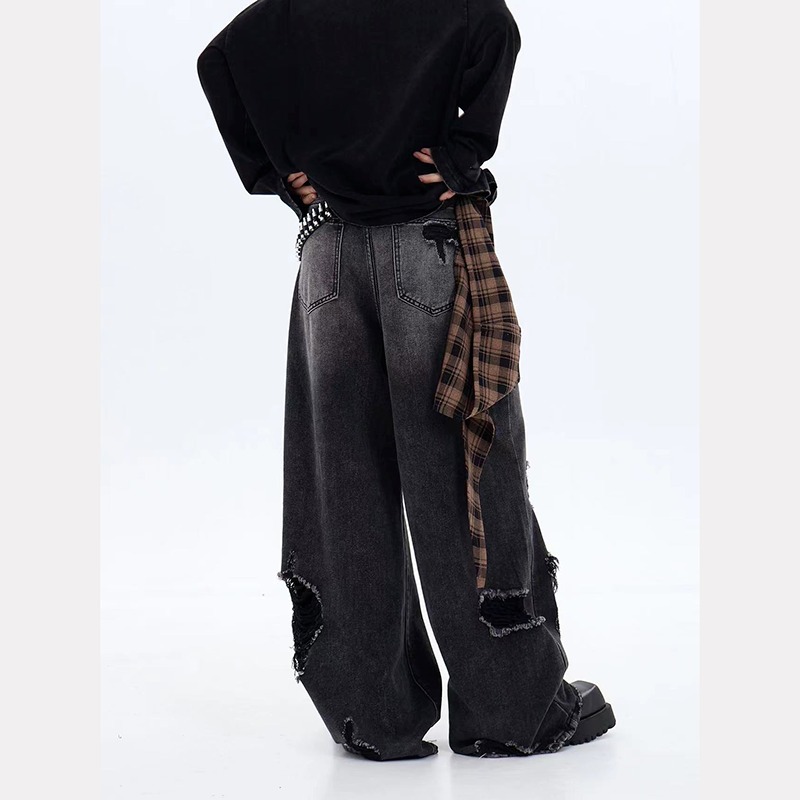 아메리칸 하이 스트리트 청바지 남성 바이브 여름 핸섬 루즈 스트레이트 와이드 레그 2024 뉴 찢어진 베이비 팬츠스토어 가기