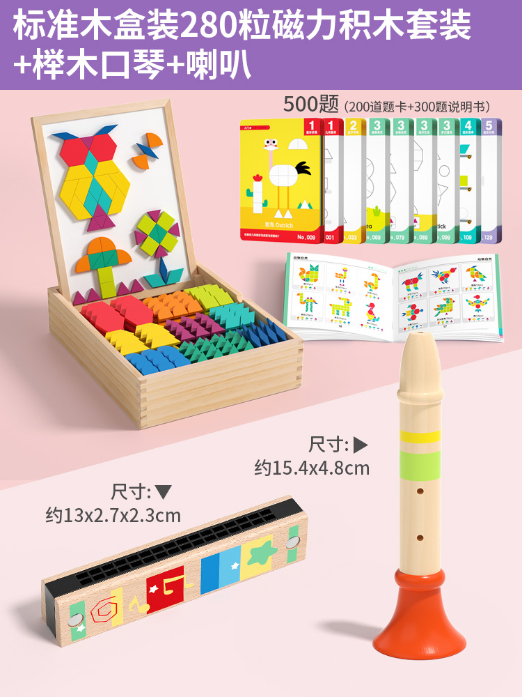 • 280개의 자석 빌딩 블록 세트 + 너도밤나무 하모니카 + 스피커가 포함된 표준 업그레이드 브래킷 나무 상자