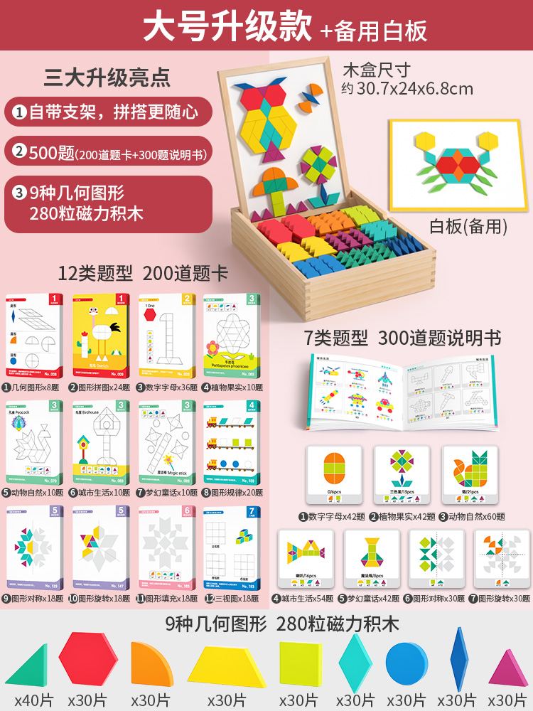 • 대형 업그레이드된 브래킷 나무 상자(자기 기하학적 빌딩 블록 210개, 질문 240개) + 예비 자석 화이트보드