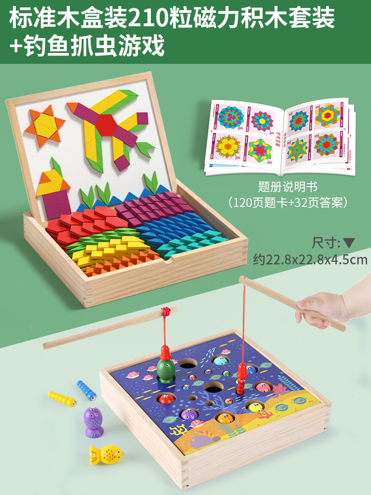 • 210개의 자석 빌딩 블록 세트 + 낚시 및 곤충 잡기 게임이 포함된 표준 업그레이드 브래킷 나무 상자