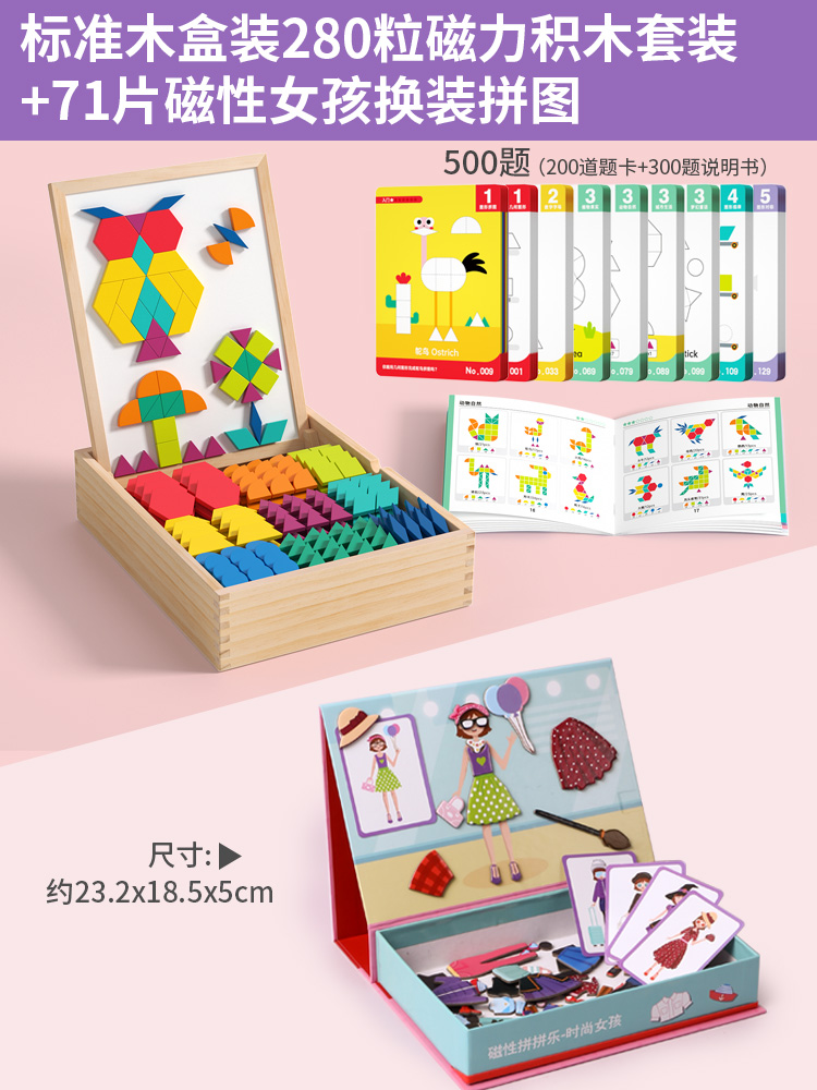• 표준 업그레이드 브래킷 나무 상자 280개 자석 빌딩 블록 세트 + 71개 자석 소녀 드레스업 퍼즐