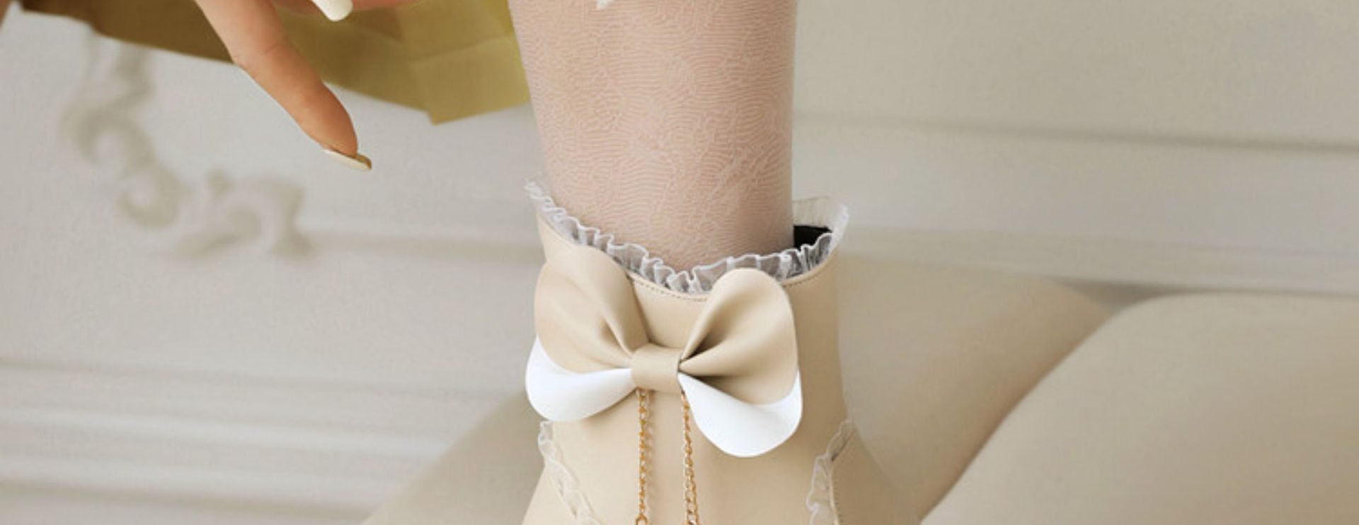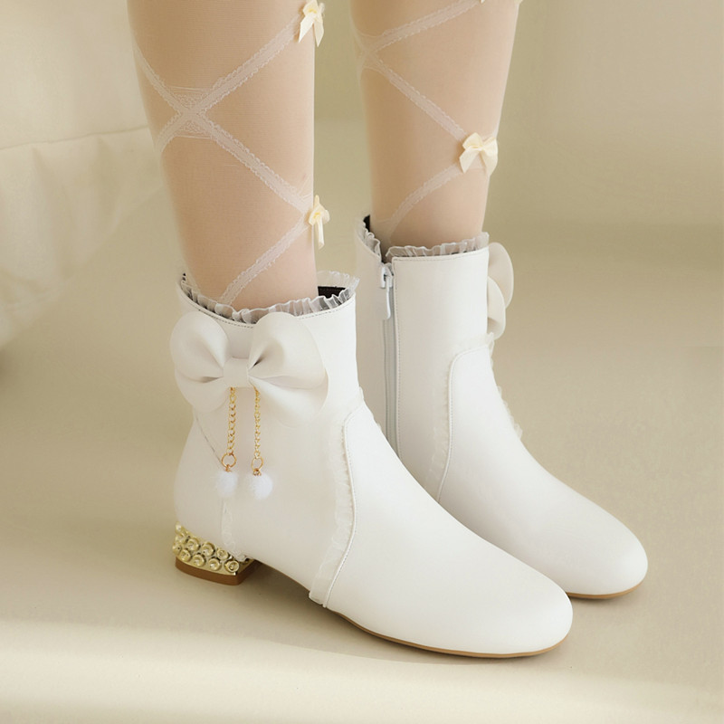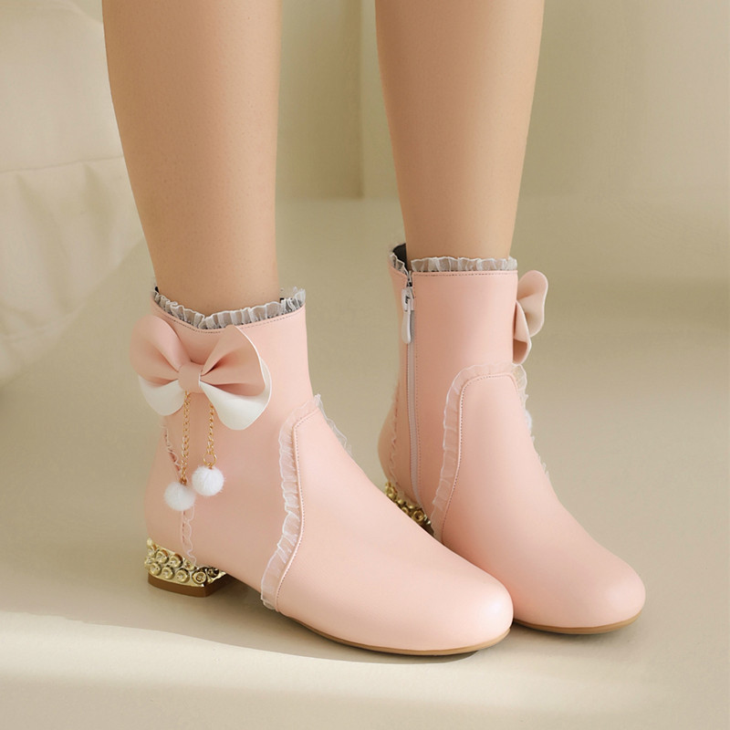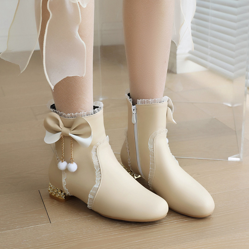 달콤한 대학 스타일 보우 숏부츠 인터넷 연예인 레이스 작은 신선한 여성 신발 로우 힐 라운드 투 사이드 지퍼 마틴 부츠