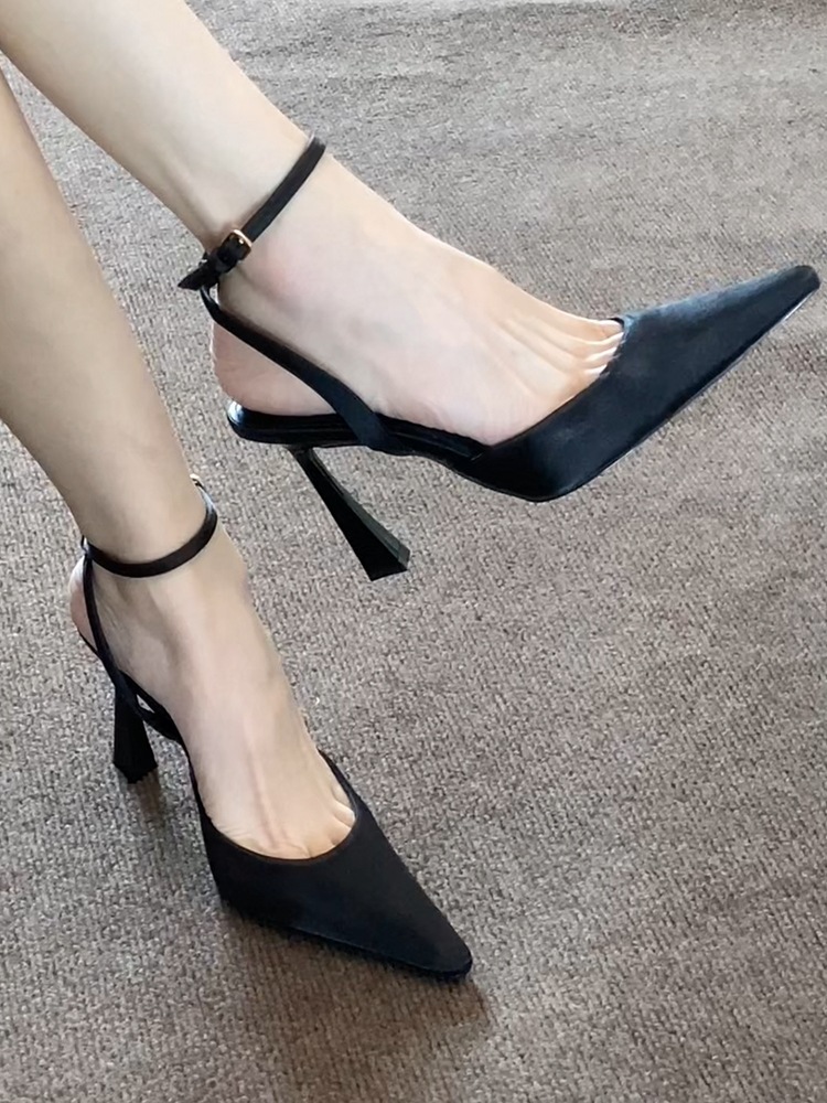 우아한 프랑스 스타일 블랙 새틴 버클 스트랩 발가락 샌들 여성용 스틸레토 힐 포인팅 발가락 하이힐