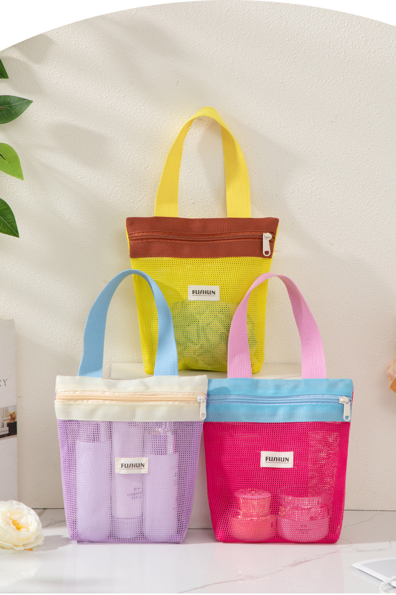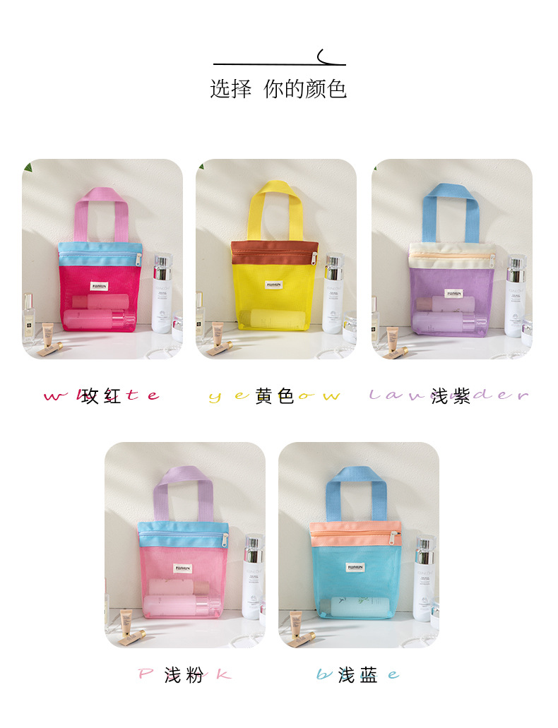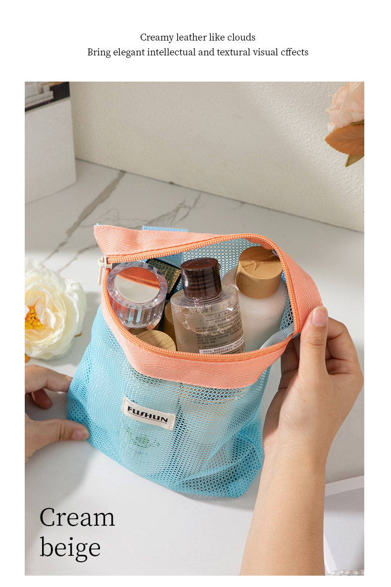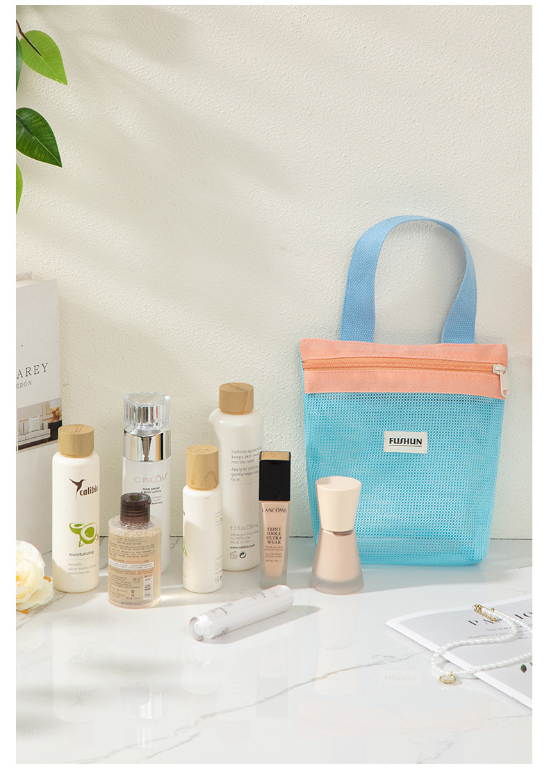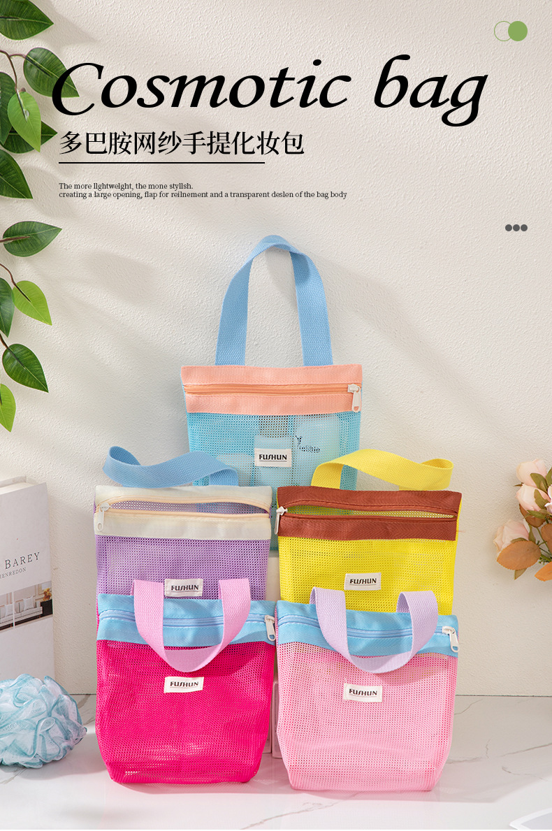 새로운 스타일의 뜨개질 메쉬 휴대용 화장품 가방, 휴대용 외출용 수납 세면도구 가방스토어 가기
