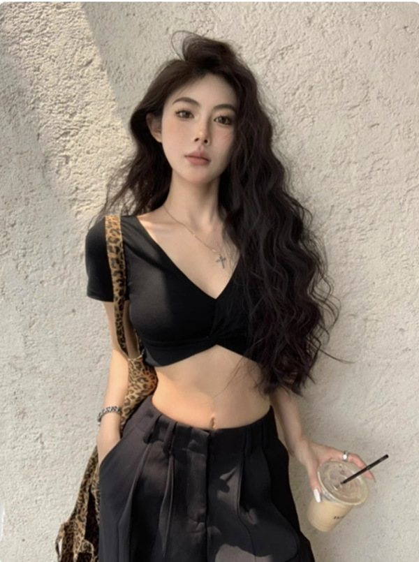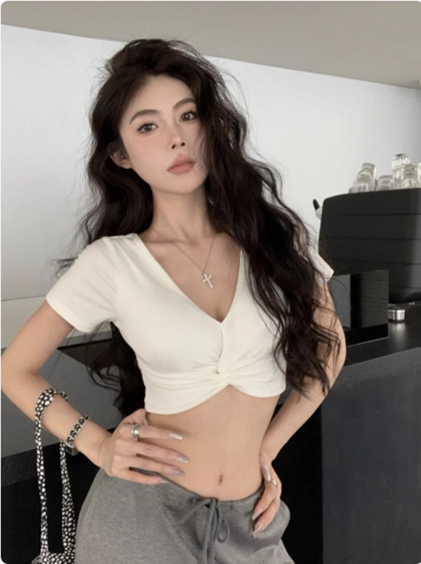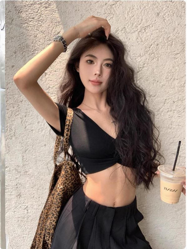 가슴이 드러나는 핫 걸스 섹시 딥 V 넥 오픈 웨이스트 반팔 티셔츠 여성용 여름 재즈 댄스 타이트 배벨 엑스트라 쇼트 재즈 탑스토어 가기