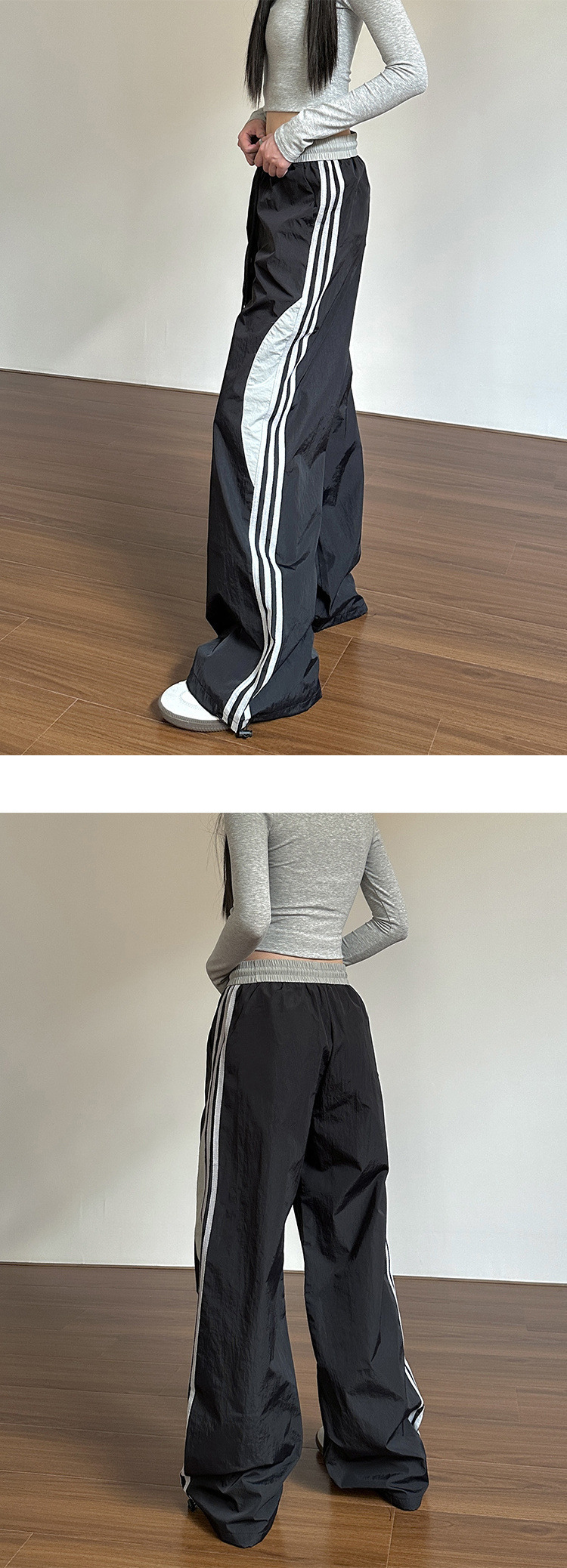 아메리칸 레트로 사이드 스트라이프 스플라이싱 공수 충전 바지 여성 여름 얇은 루즈 슬리밍 와이드 레그 캐주얼 바지