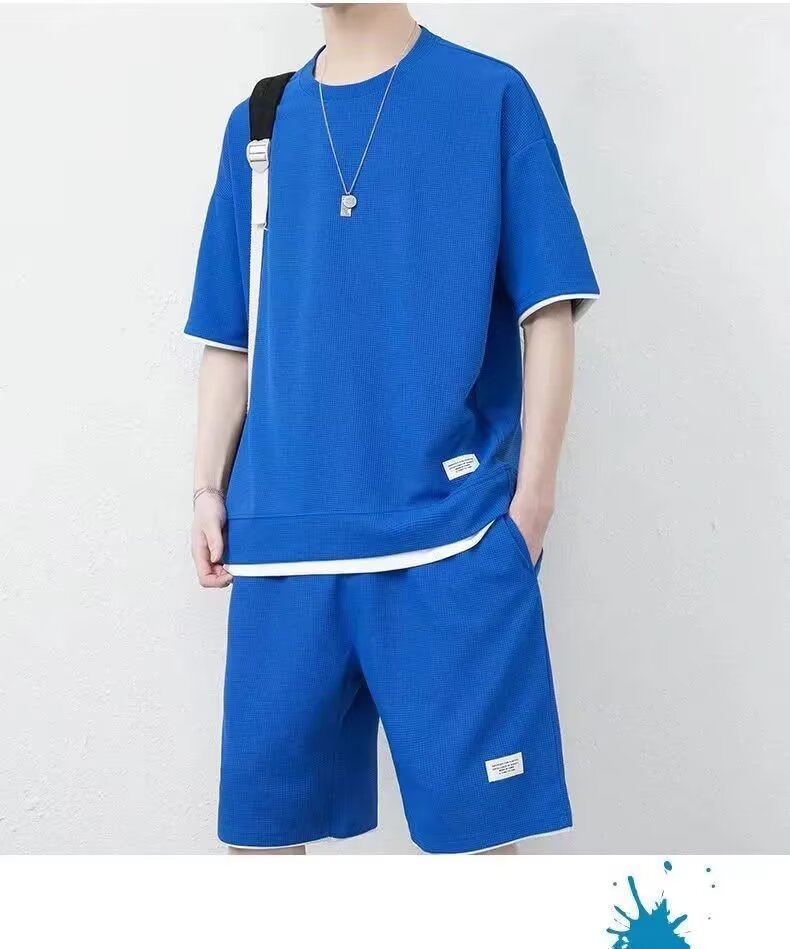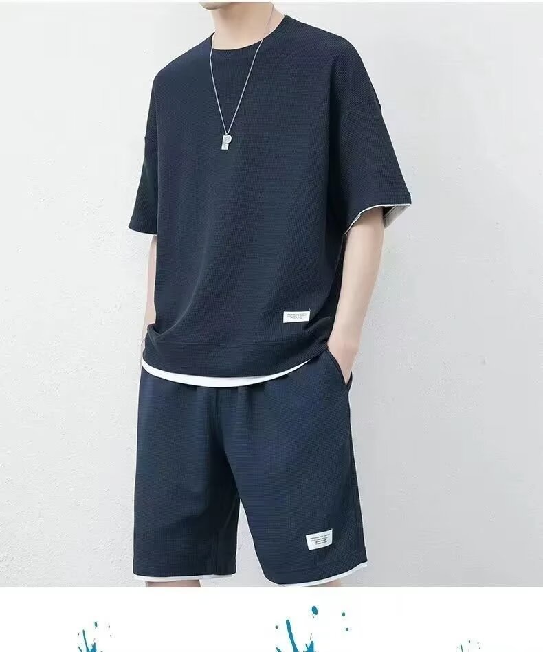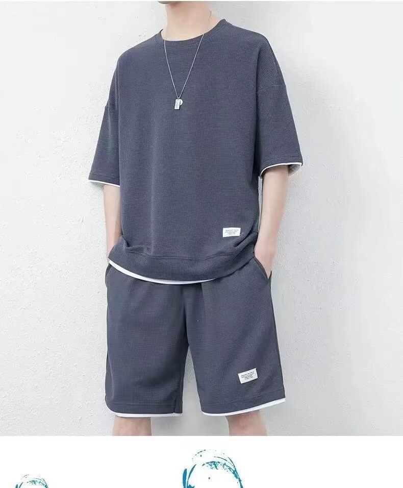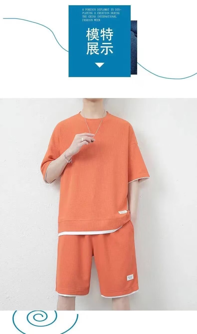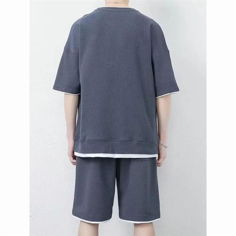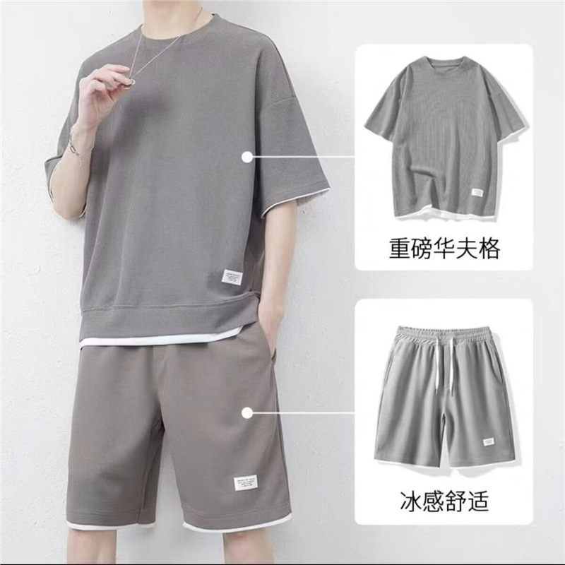남자 여름 클래식 간단한 올 매치 와플 러 반팔 반바지 세트 남자 유행 잘 생긴 캐주얼 스포츠 세트스토어 가기