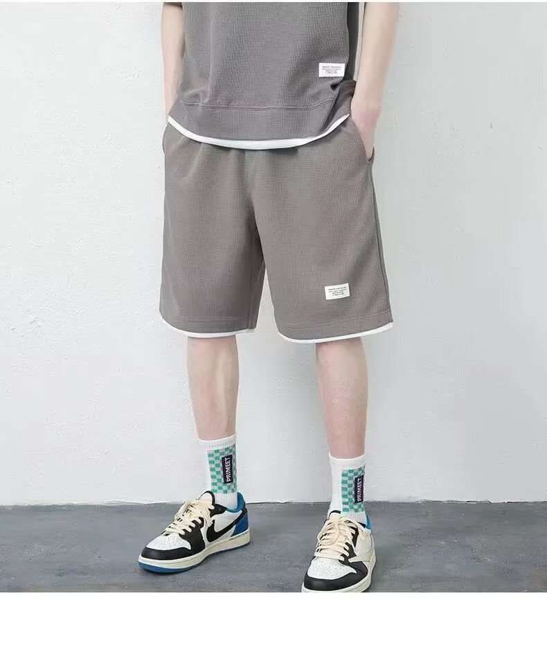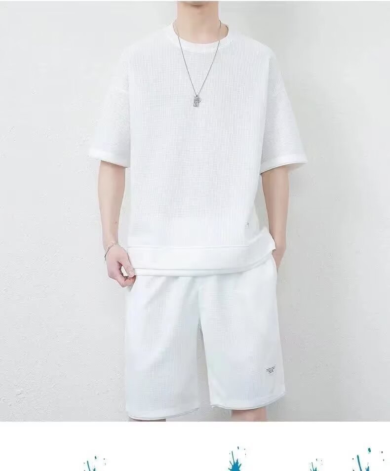 남자 여름 클래식 간단한 올 매치 와플 러 반팔 반바지 세트 남자 유행 잘 생긴 캐주얼 스포츠 세트