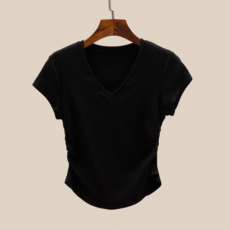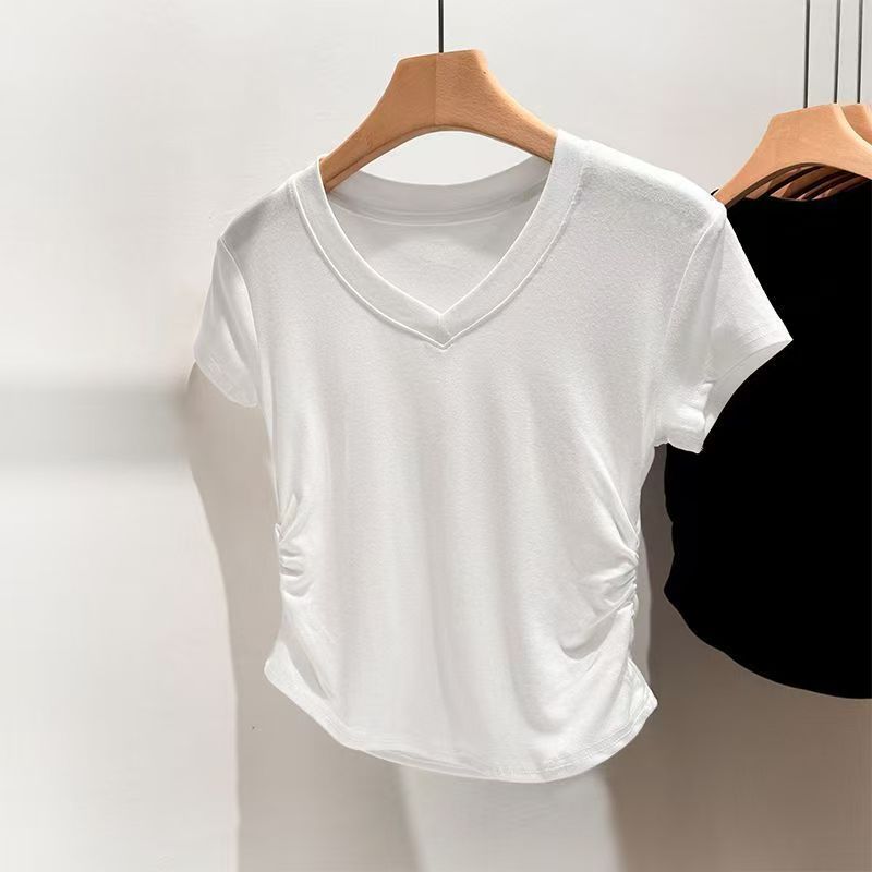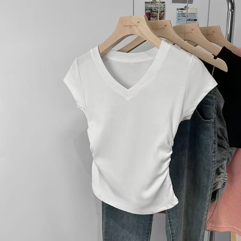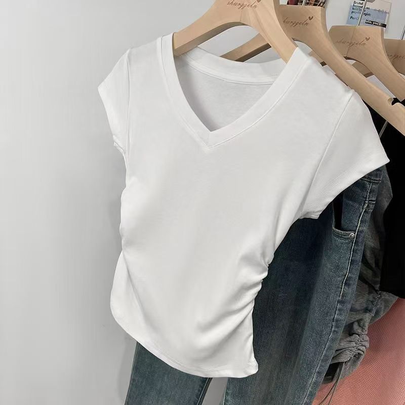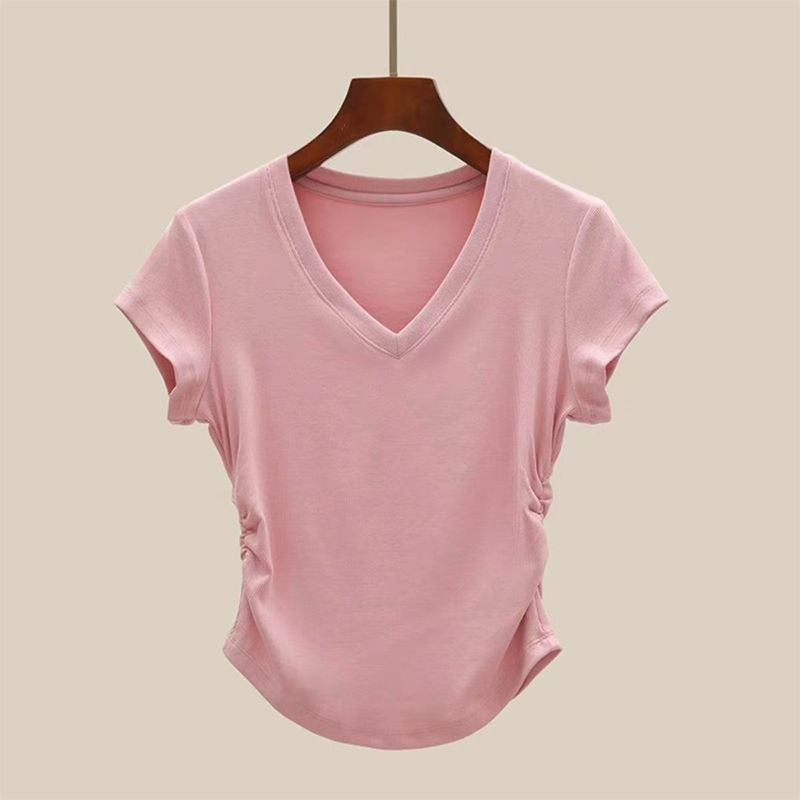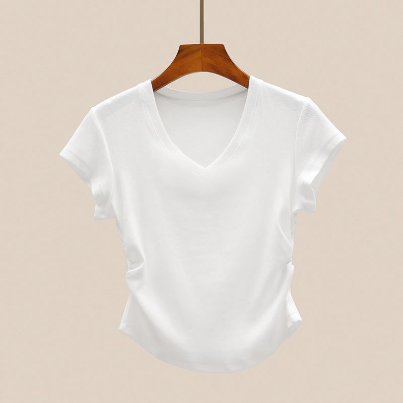 여성용 오른쪽 어깨 브이넥 반팔 티셔츠 여름 디자인 허리 주름 슬리밍 곡선 밑단 타이트 쇼트 핫걸 탑스토어 가기