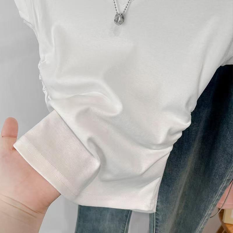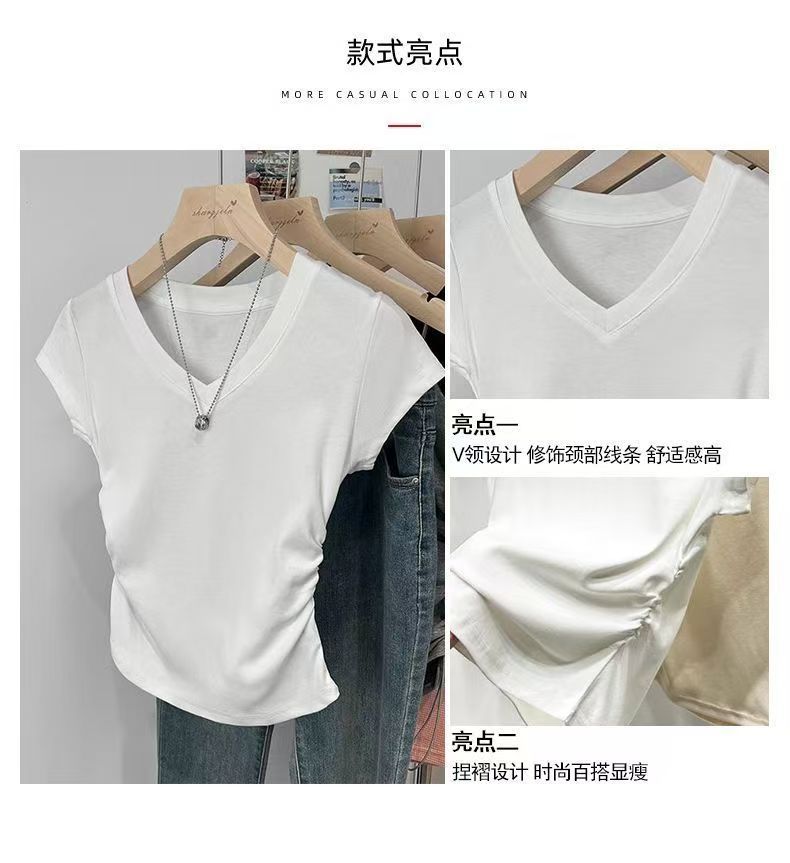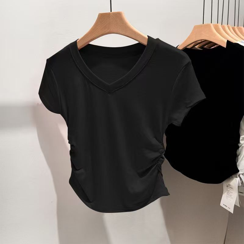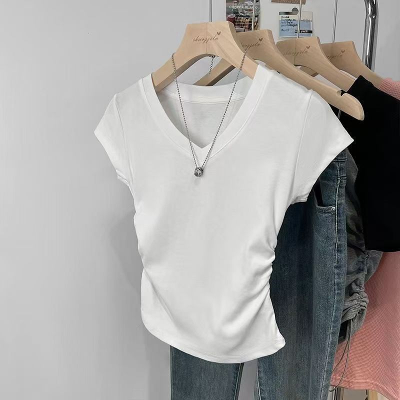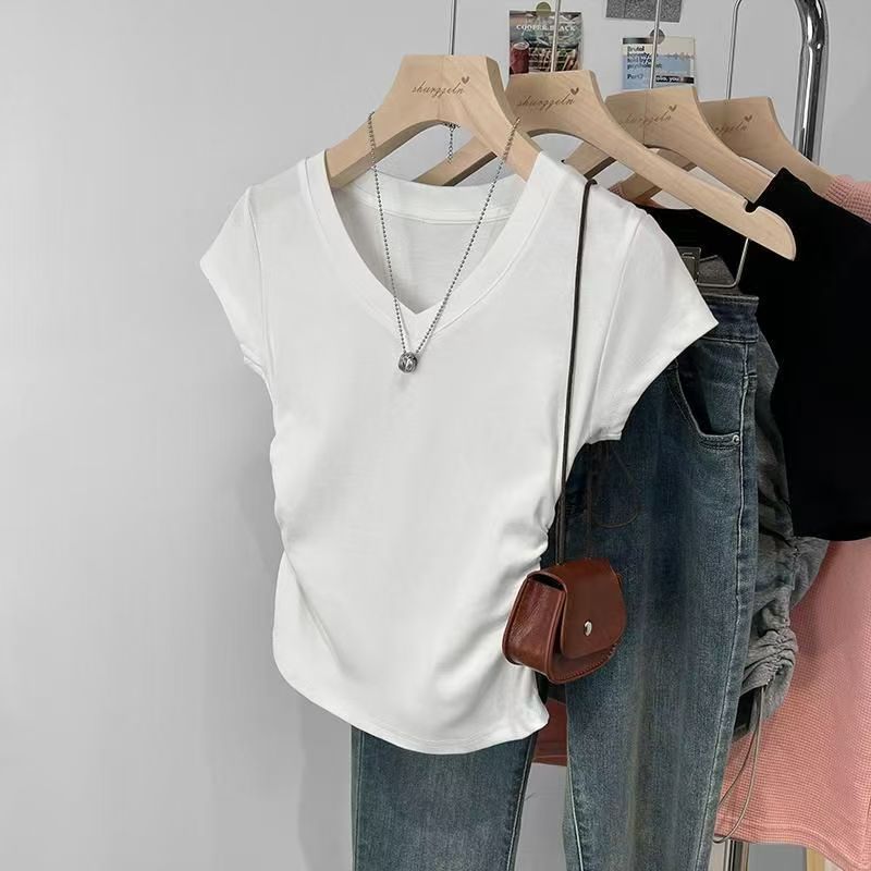 여성용 오른쪽 어깨 브이넥 반팔 티셔츠 여름 디자인 허리 주름 슬리밍 곡선 밑단 타이트 쇼트 핫걸 탑스토어 가기