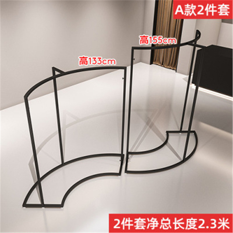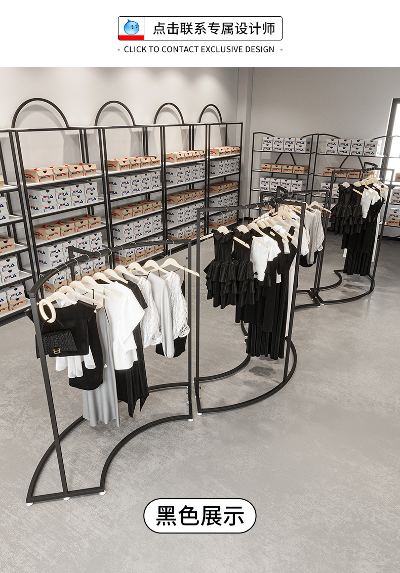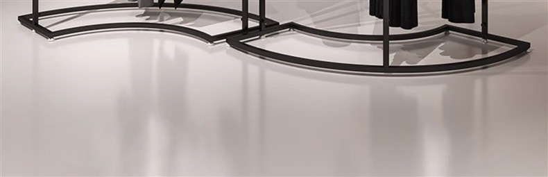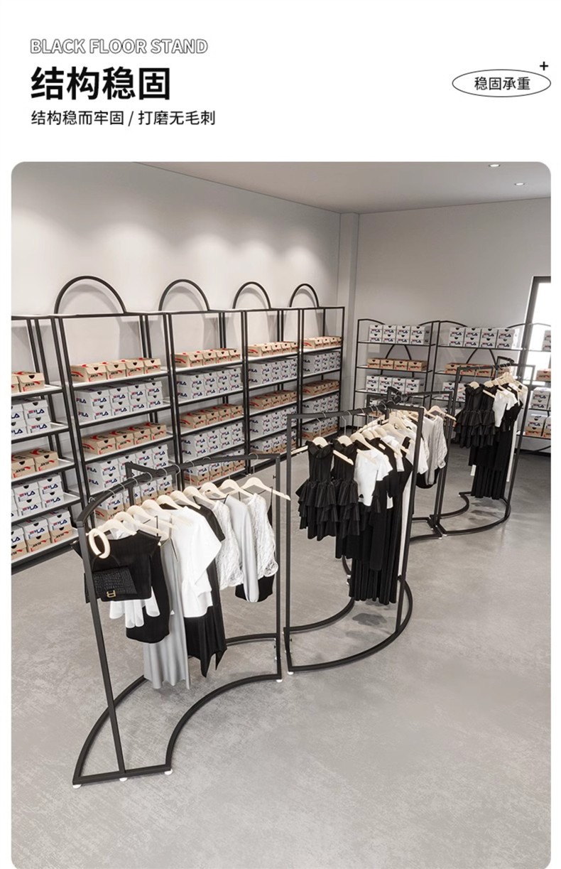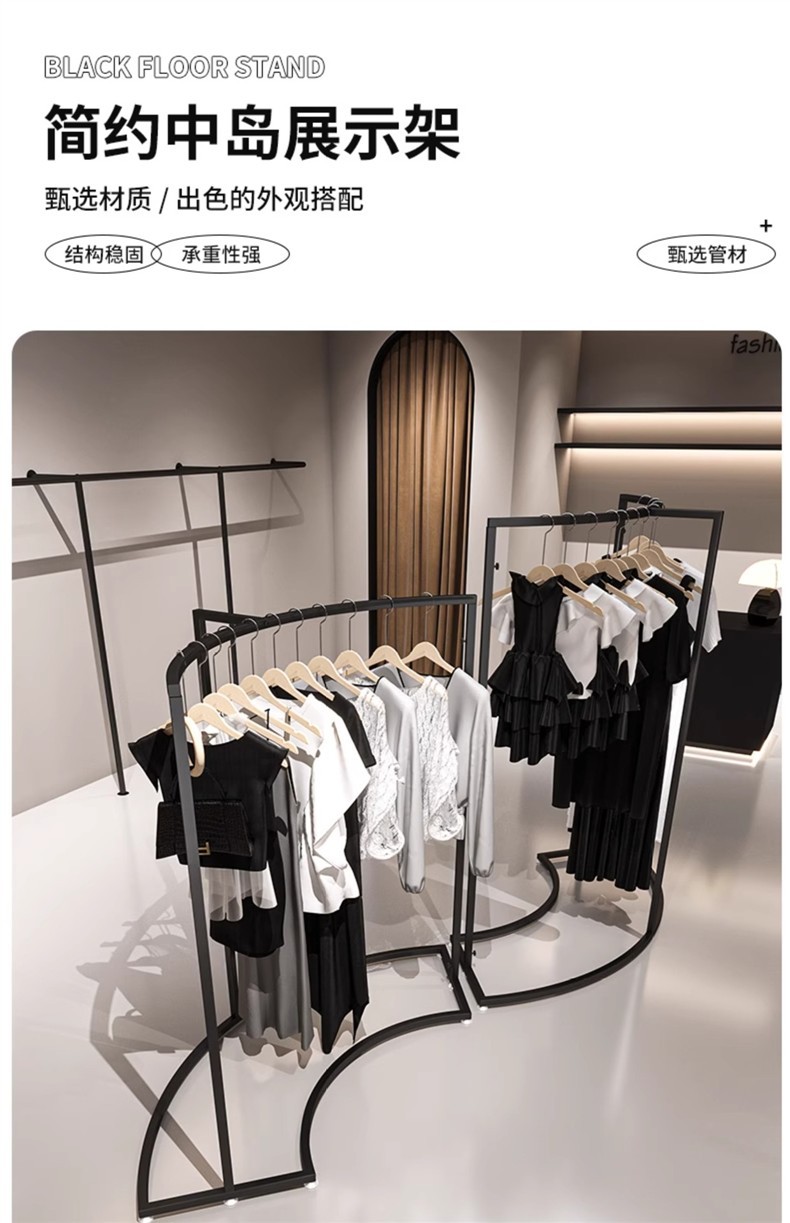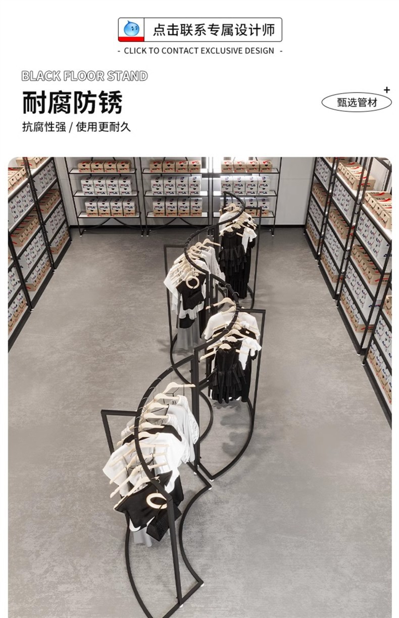 의류 매장 센터 콘솔 디스플레이 랙 블랙 철 아트 곡선 의류 디스플레이 랙 조합 남성 및 여성 의류 매장 선반 옷걸이스토어 가기