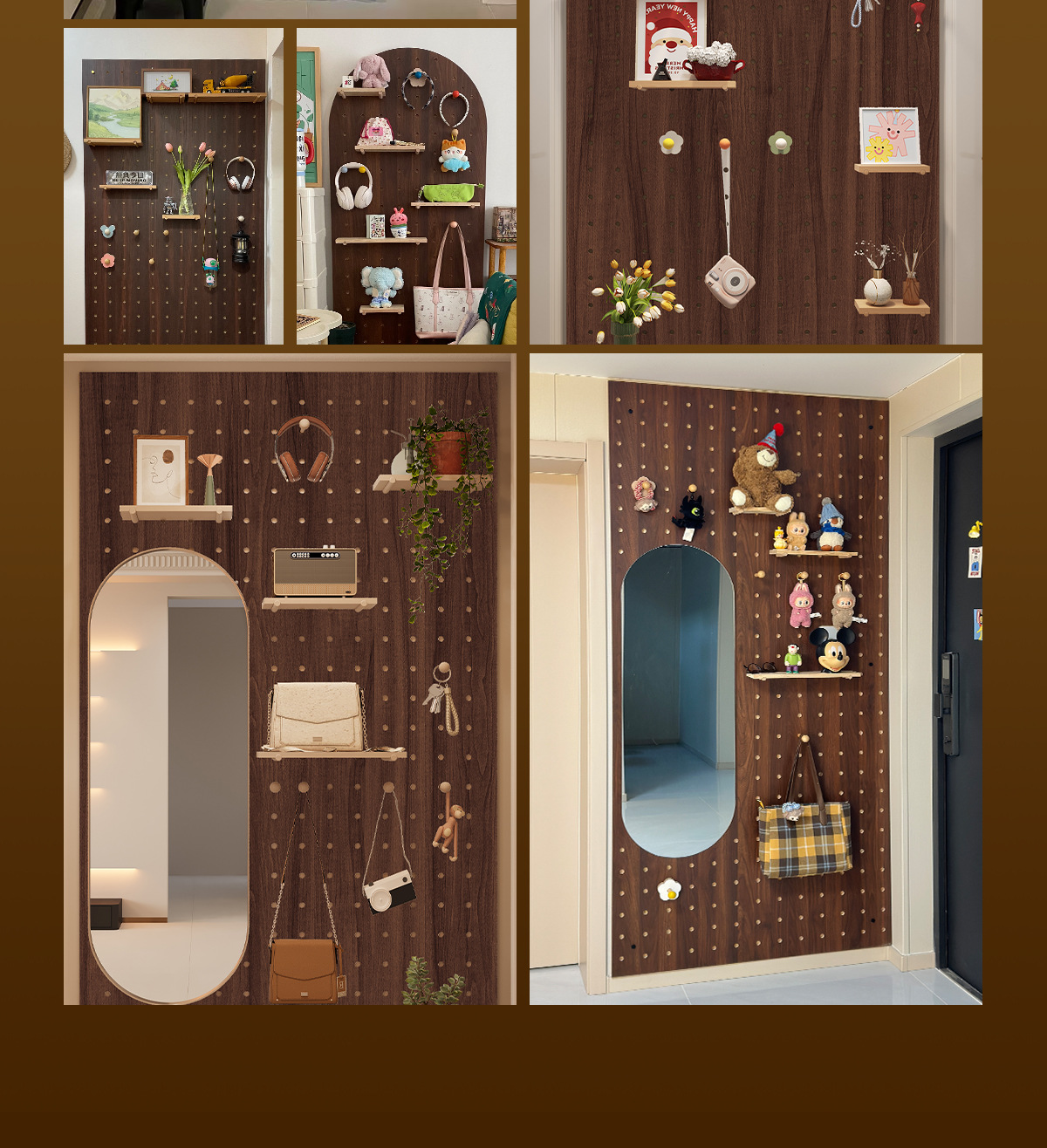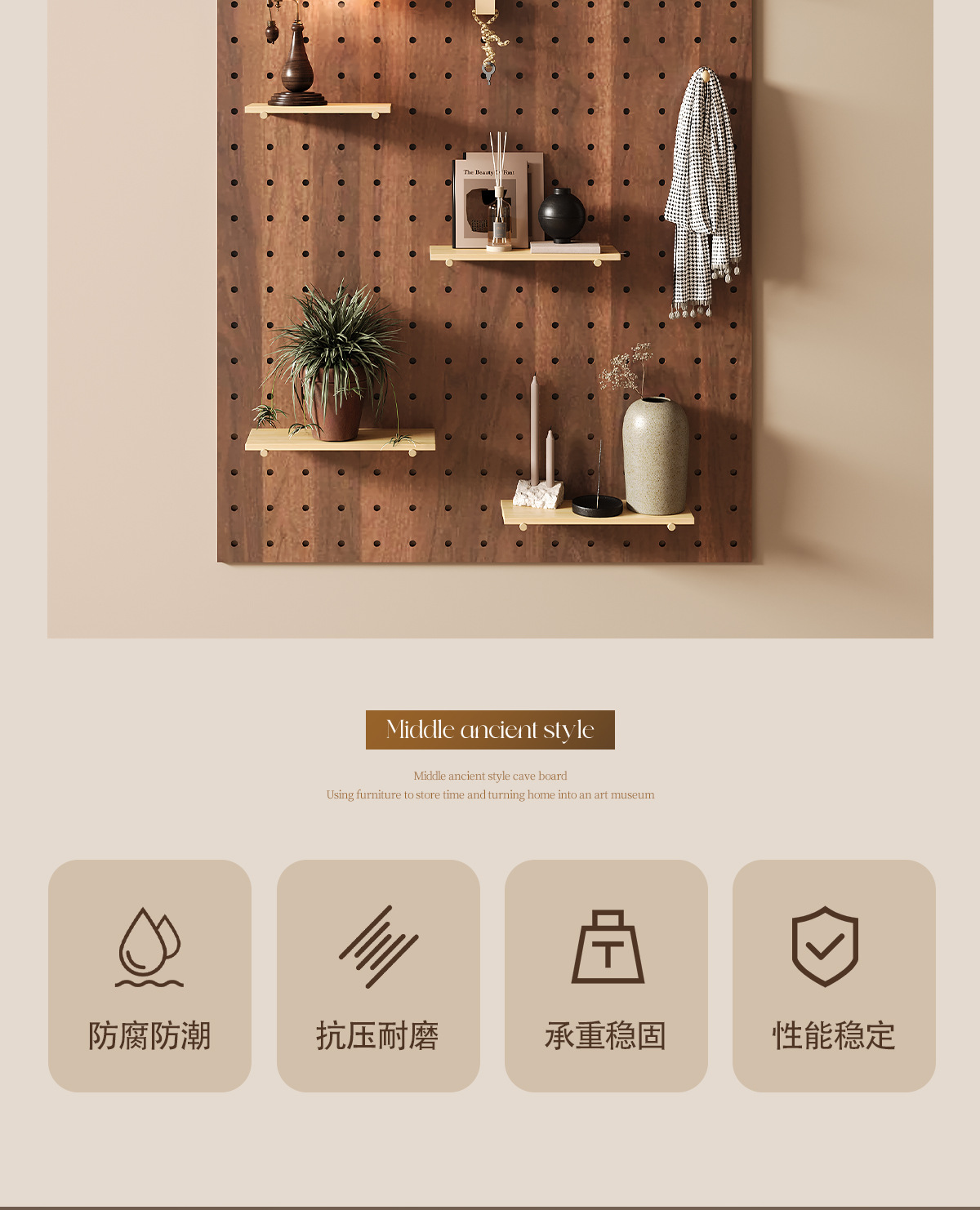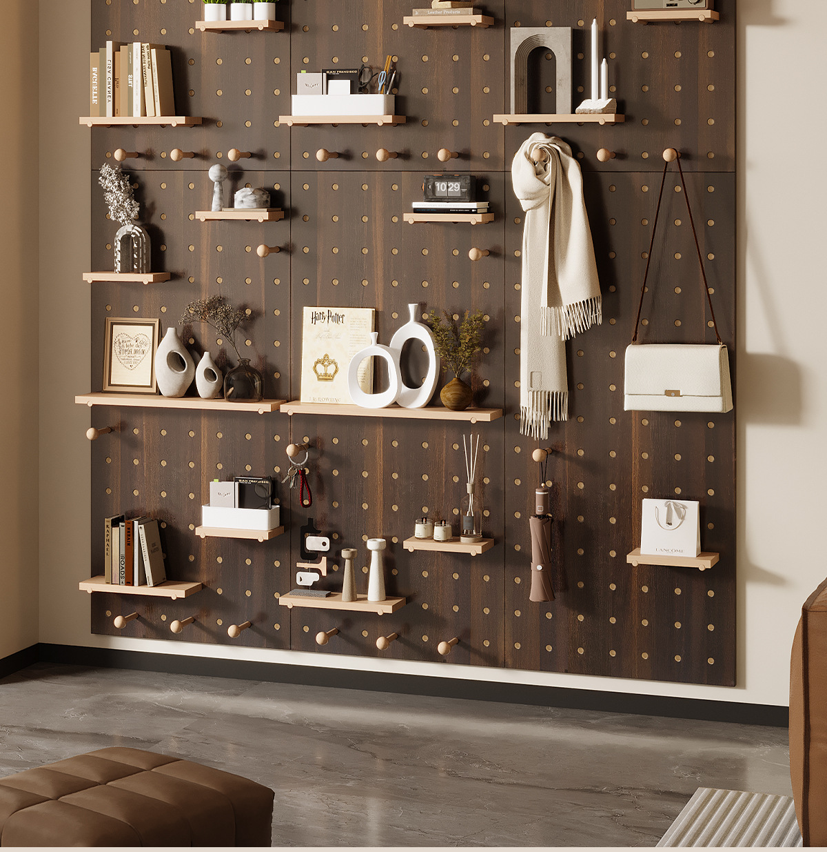 중세 스타일 단단한 나무 구멍 보드 벽 선반 액세서리 파티션 벽 디스플레이 스토리지 랙 도매 공급