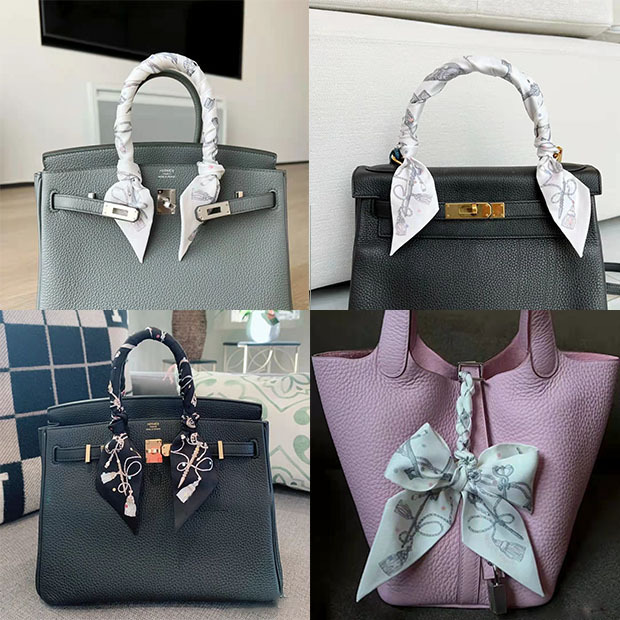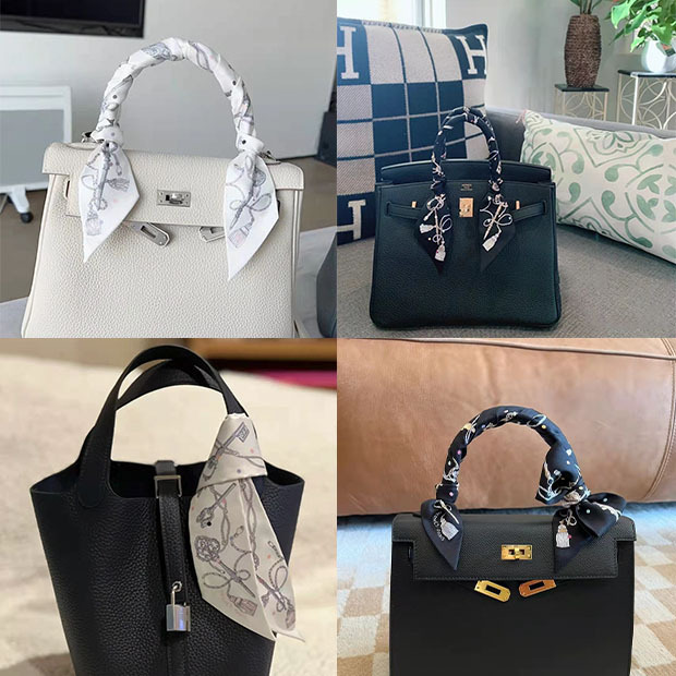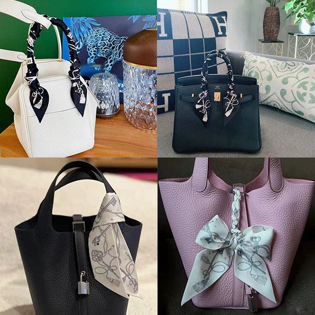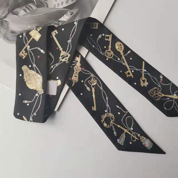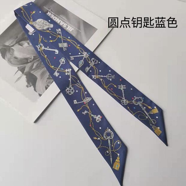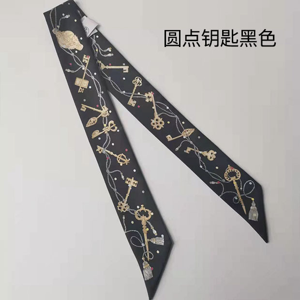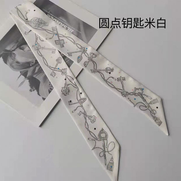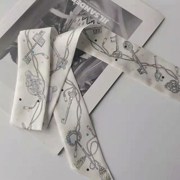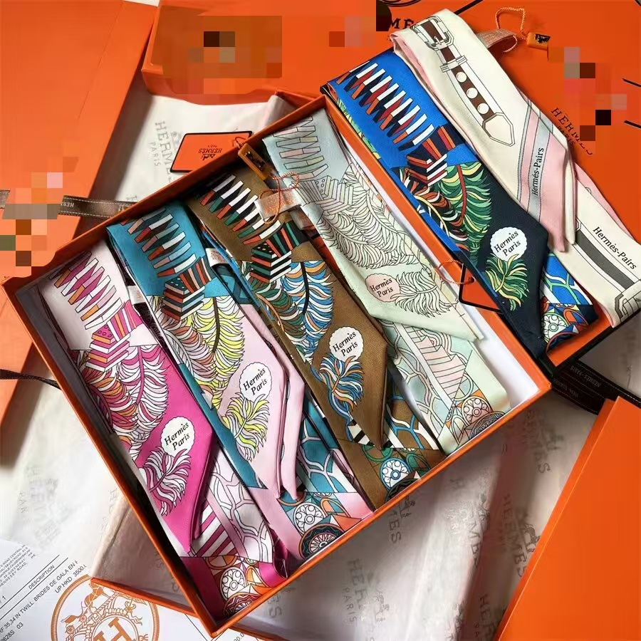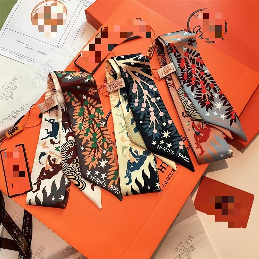 2025H 가족 소장품 도서표지 스탬프가 있는 작은 실크 스카프, 가방 손잡이 리본, 머리끈, 실크 아이리스 플라워 스카프