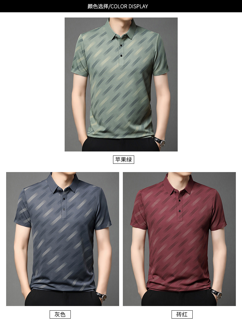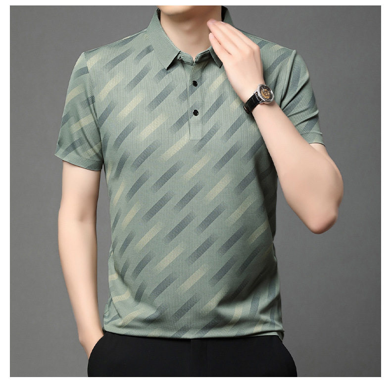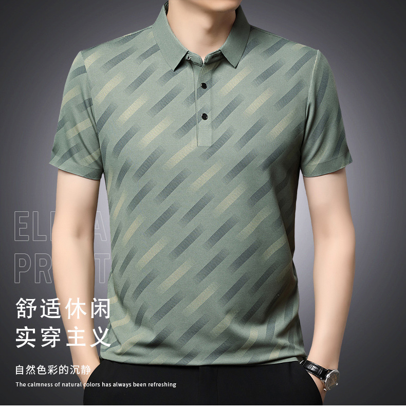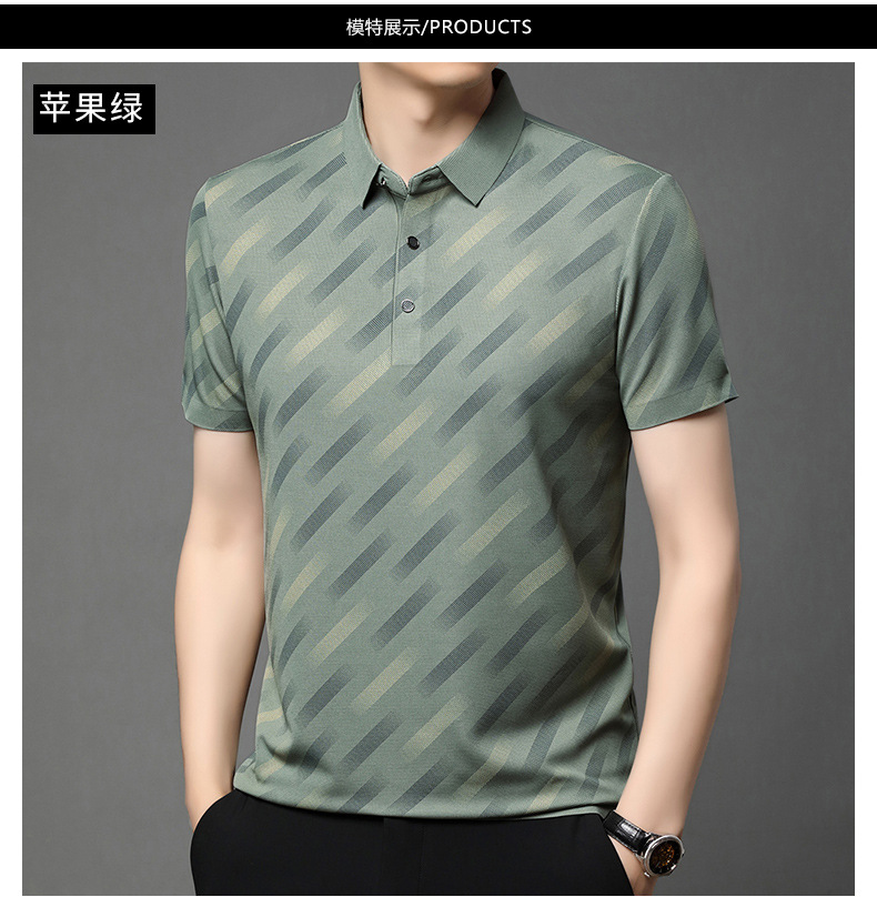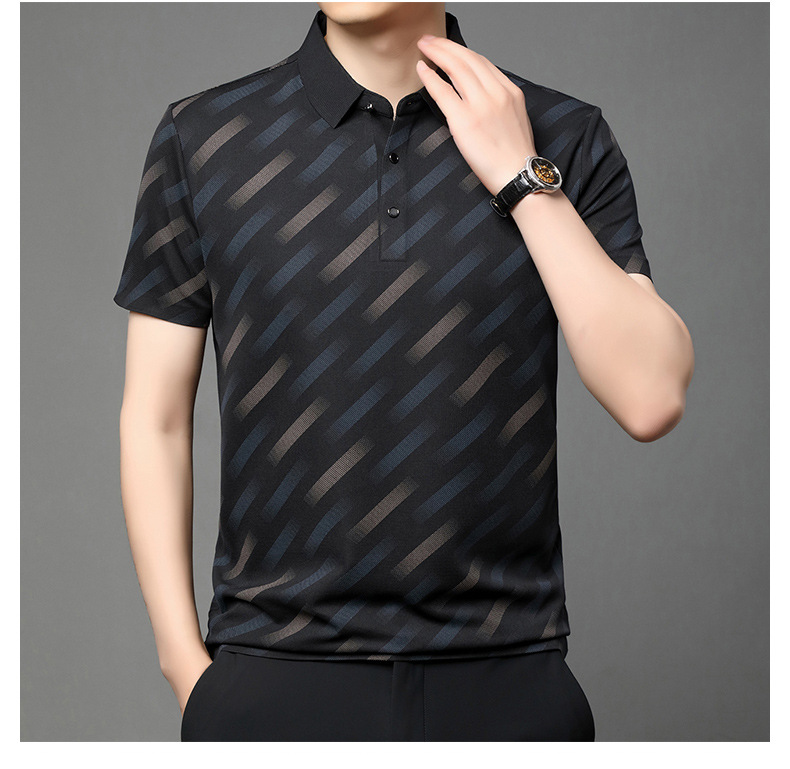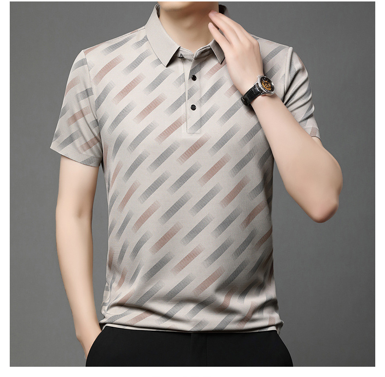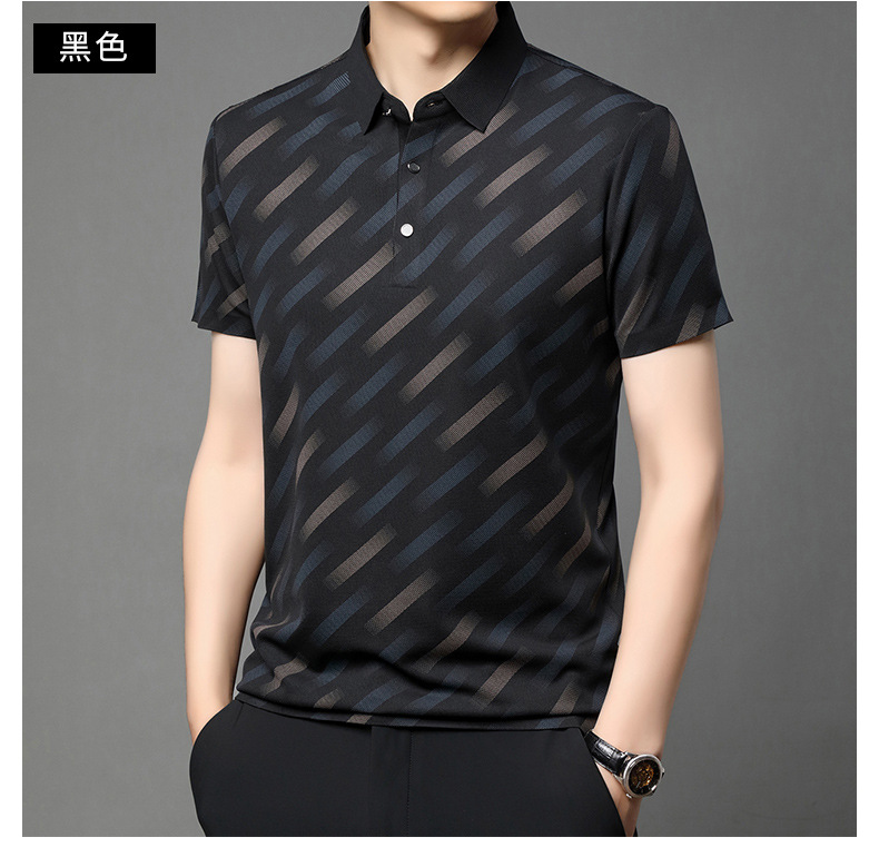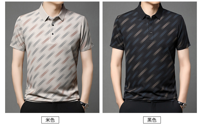 남성용 라이브 방송 인기 아이스 실크 반팔 티셔츠 남성용 여름 신작 캐주얼 스트라이프 프린트 라펠 반팔 폴로 셔츠