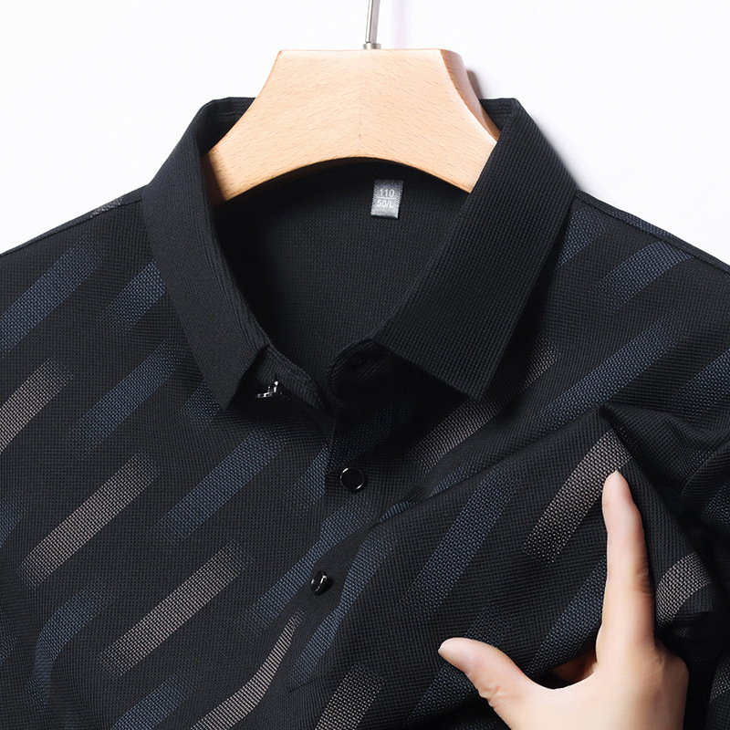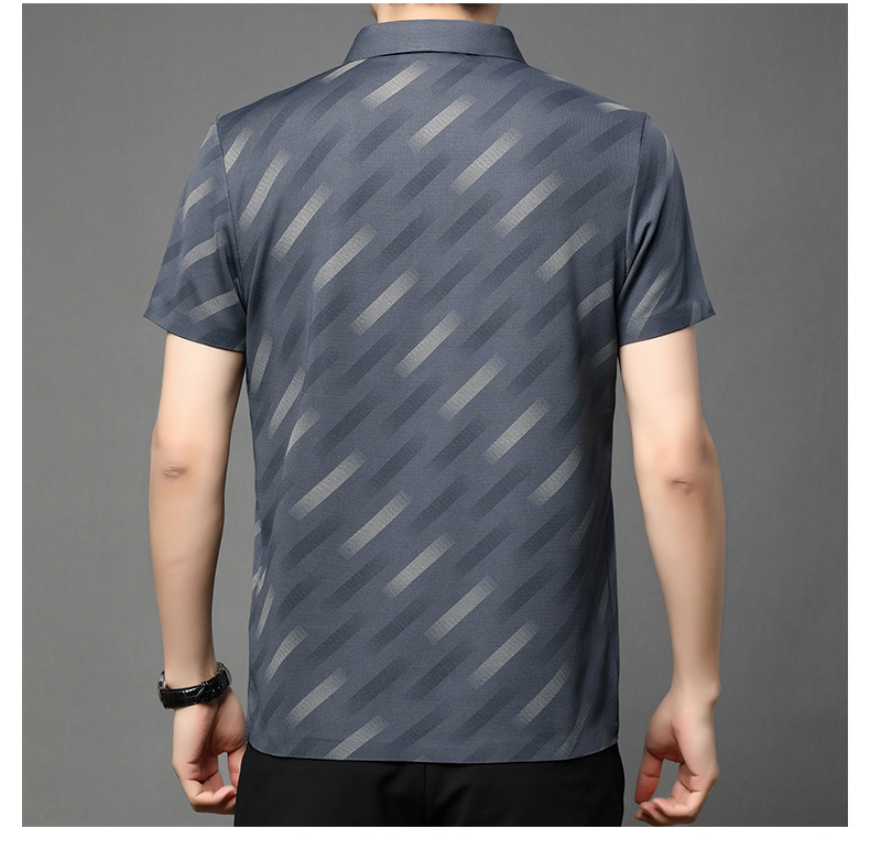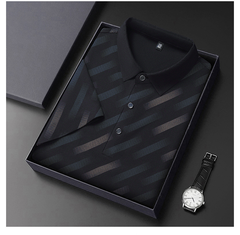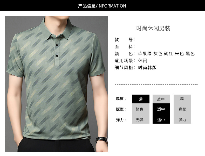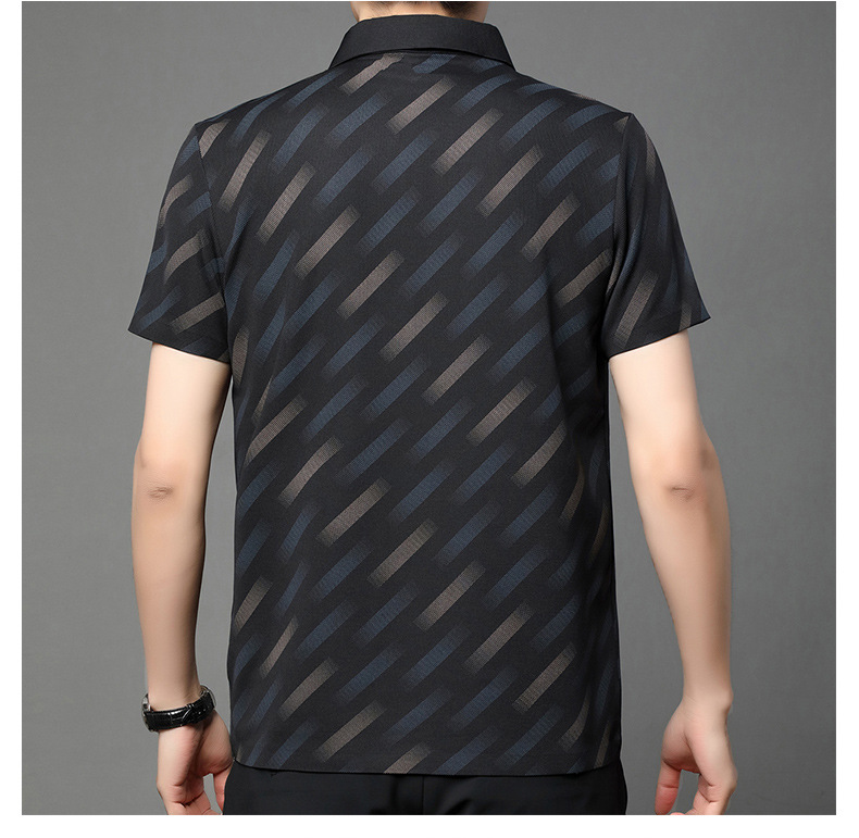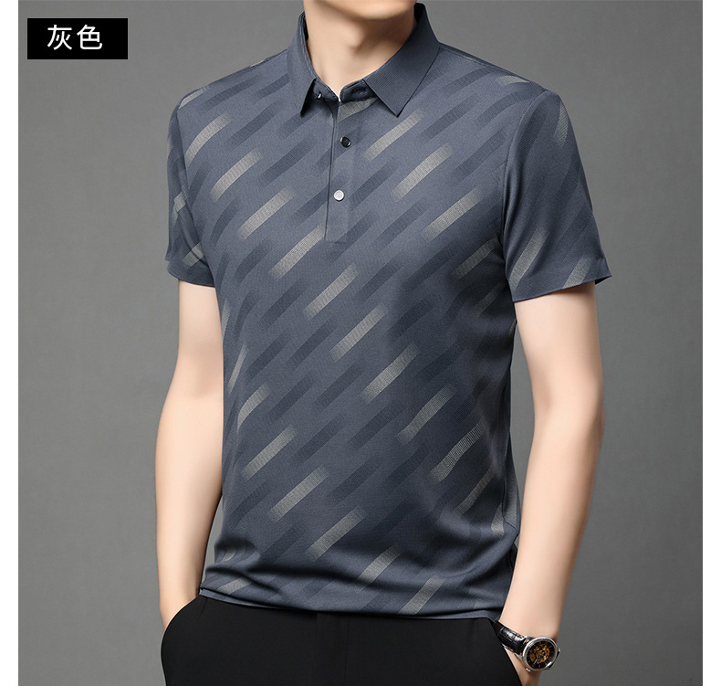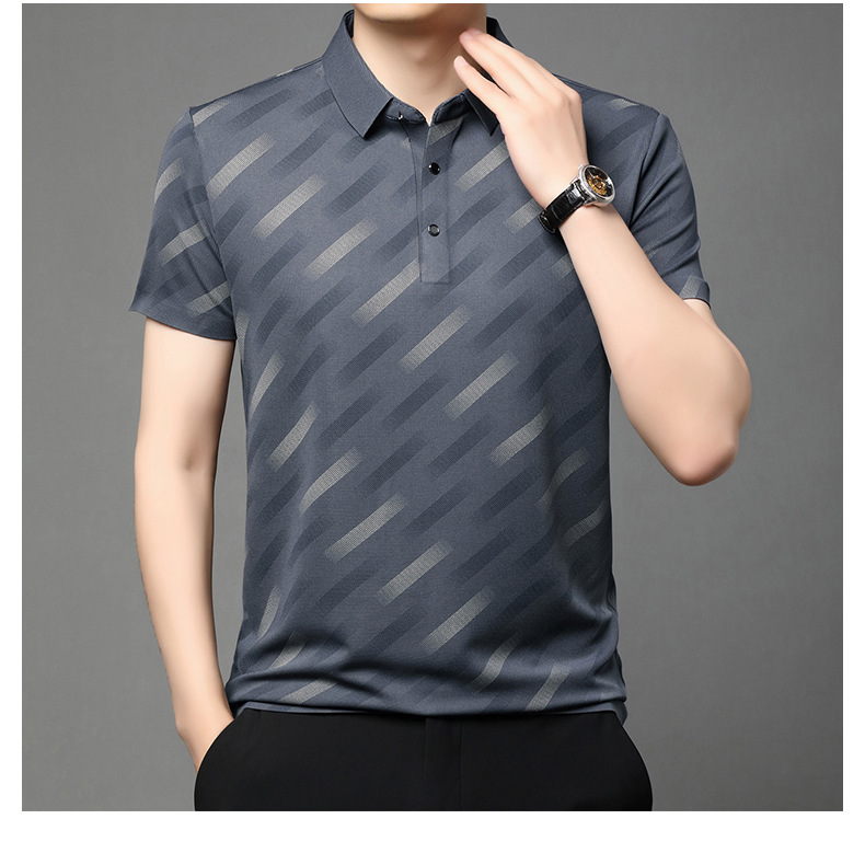 남성용 라이브 방송 인기 아이스 실크 반팔 티셔츠 남성용 여름 신작 캐주얼 스트라이프 프린트 라펠 반팔 폴로 셔츠